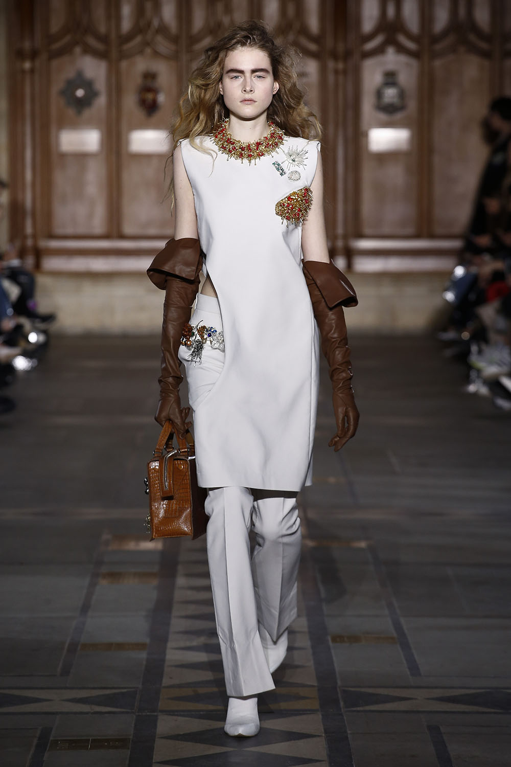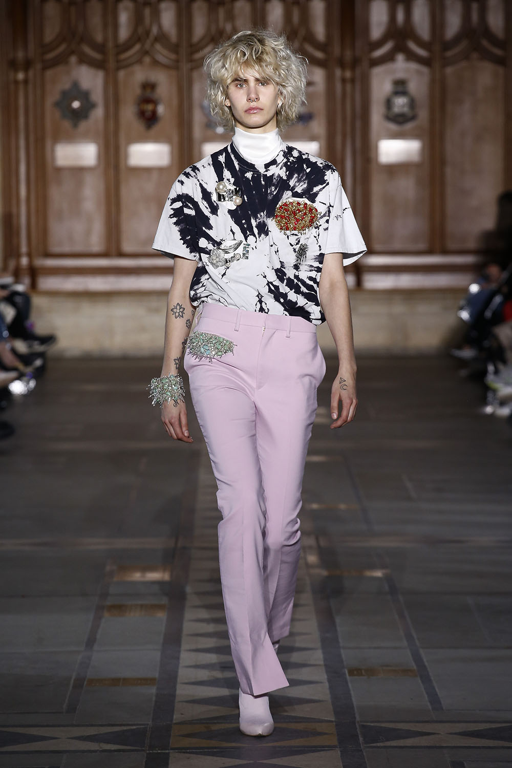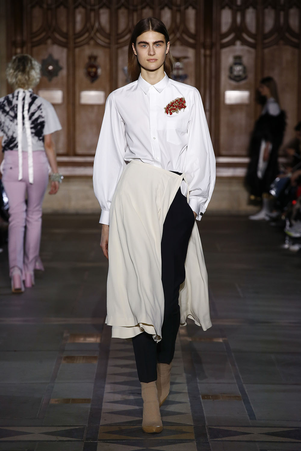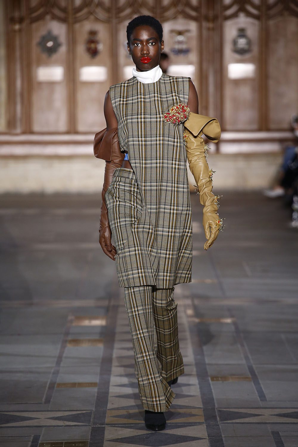 ショー全体を通して、クラシックなウィメンズウェア、そしてメンズウェアをモダンな解釈で表現したワードローブには、シュールレアリズムを思わせるデコラティブなディティールやレイヤースタイリングが取り入れられ、エレベーテットなベーシックスタイルを提案している。