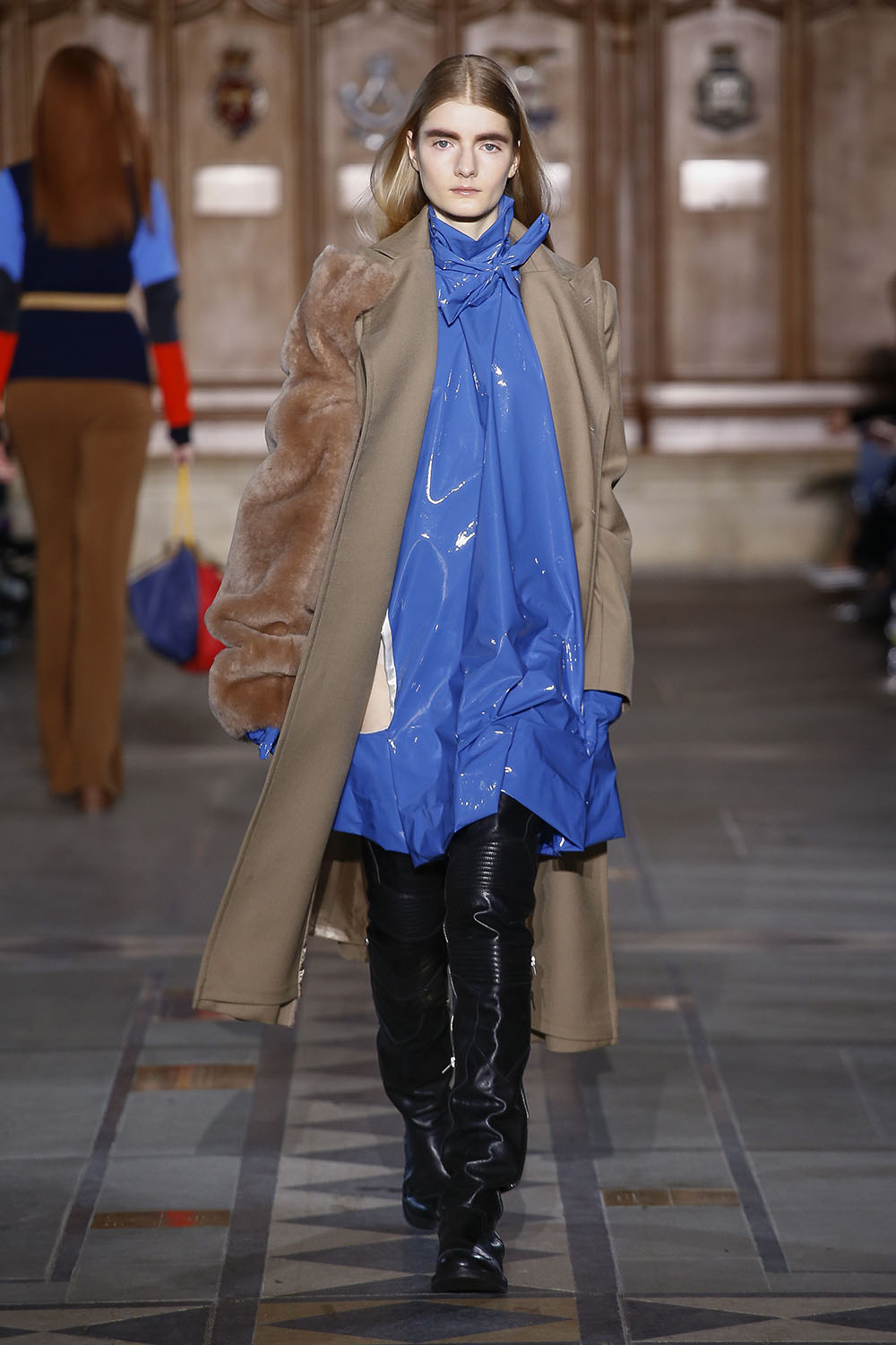 古田泰子による TOGA (トーガ) の最新2017-18年秋冬コレクションがロンドンにて発表。今季ファーストルックで幕を切ったのは、大胆な光沢感を湛えたペールブルーのセットアップ。ミニマルな仕立てのジャケットにはサッシュベルトや立体装飾のブローチがあしらわれ、どこか貴族的な印象だ。