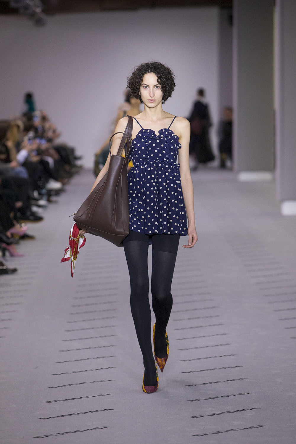 後半で登場したのはフロアレングスのドレス群。Dovima (ドヴィーマ) の時代の輝かしいクチュール黄金期を彷彿とさせるルックの中には、言わずと知れたバルーンドレスや、スペインを象徴するブラックのドレス、そしてフェザードレスのルックが含まれている。ガウンのバック部分には、オリジナルの年号とコレクションの表記、手元にはサロン形式のクチュール時代を思わせるナンバリングのクラッチバッグ。この数シーズンでモードシーンの話題をさらった Demna イズムを継承しながらも、クチュール文化をより深く再探索したコレクションは、メゾンのアニバーサリーを奥ゆかしく、それでいて力強く彩った。