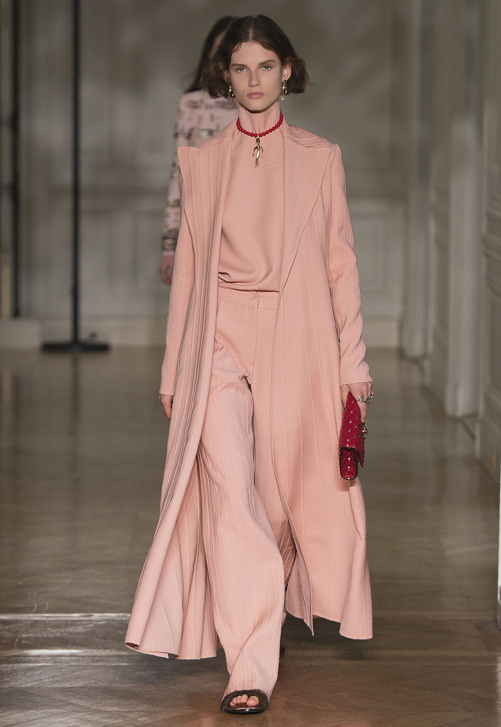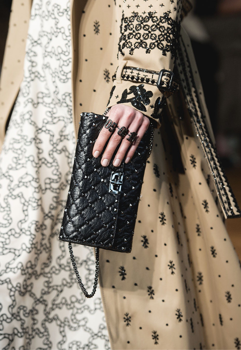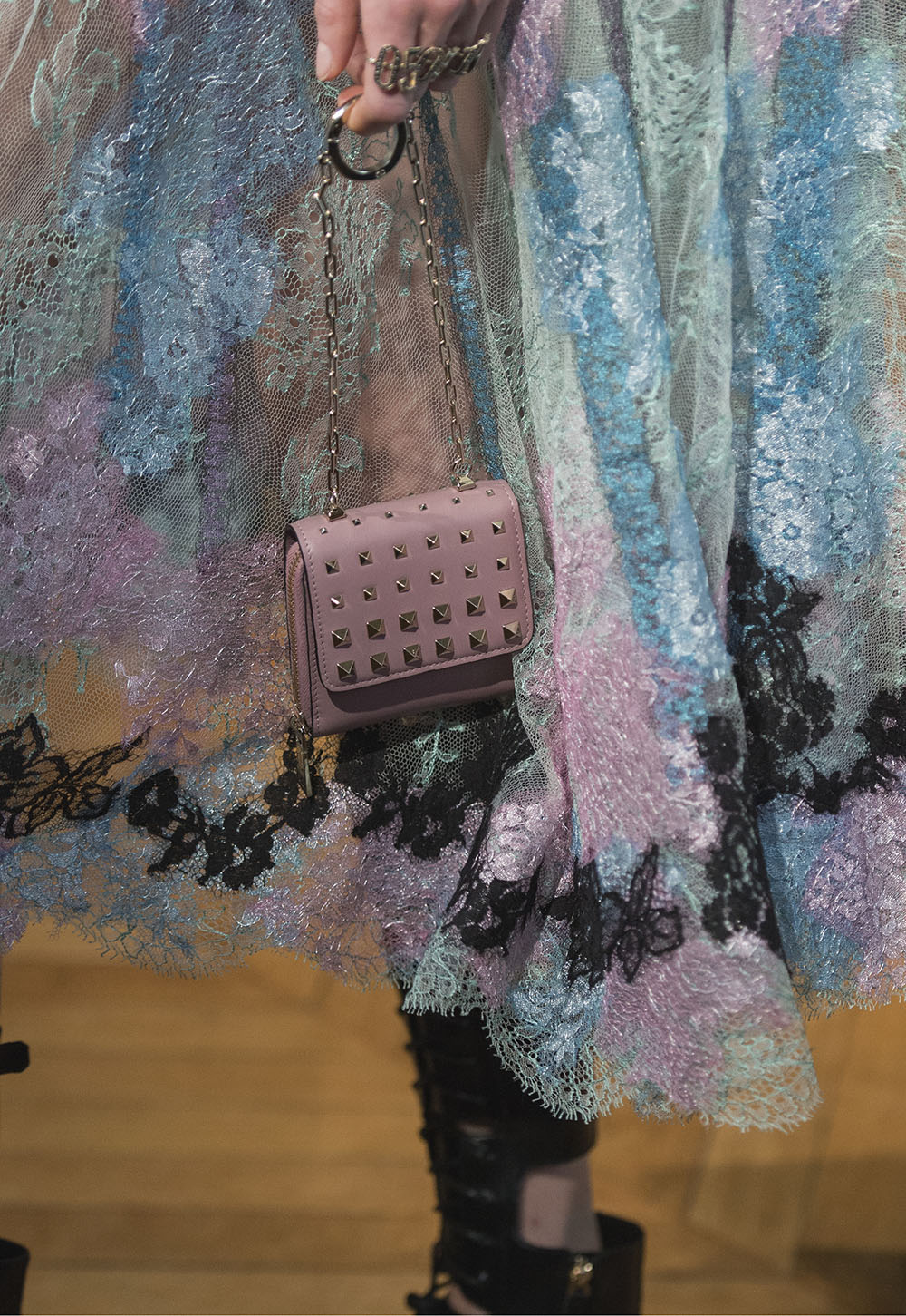 豪奢なワードローブ類に対し、コンバットブーツやアイコニックな「ロックスタッズ」をあしらったバッグなど個性的なアクセサリーがエッジの効いたスタイリングを提案。ラグジュアリーを極めた Valentino らしいスタイルに、どこかポップさとエフォートレスさが共存しているのが印象的だ。