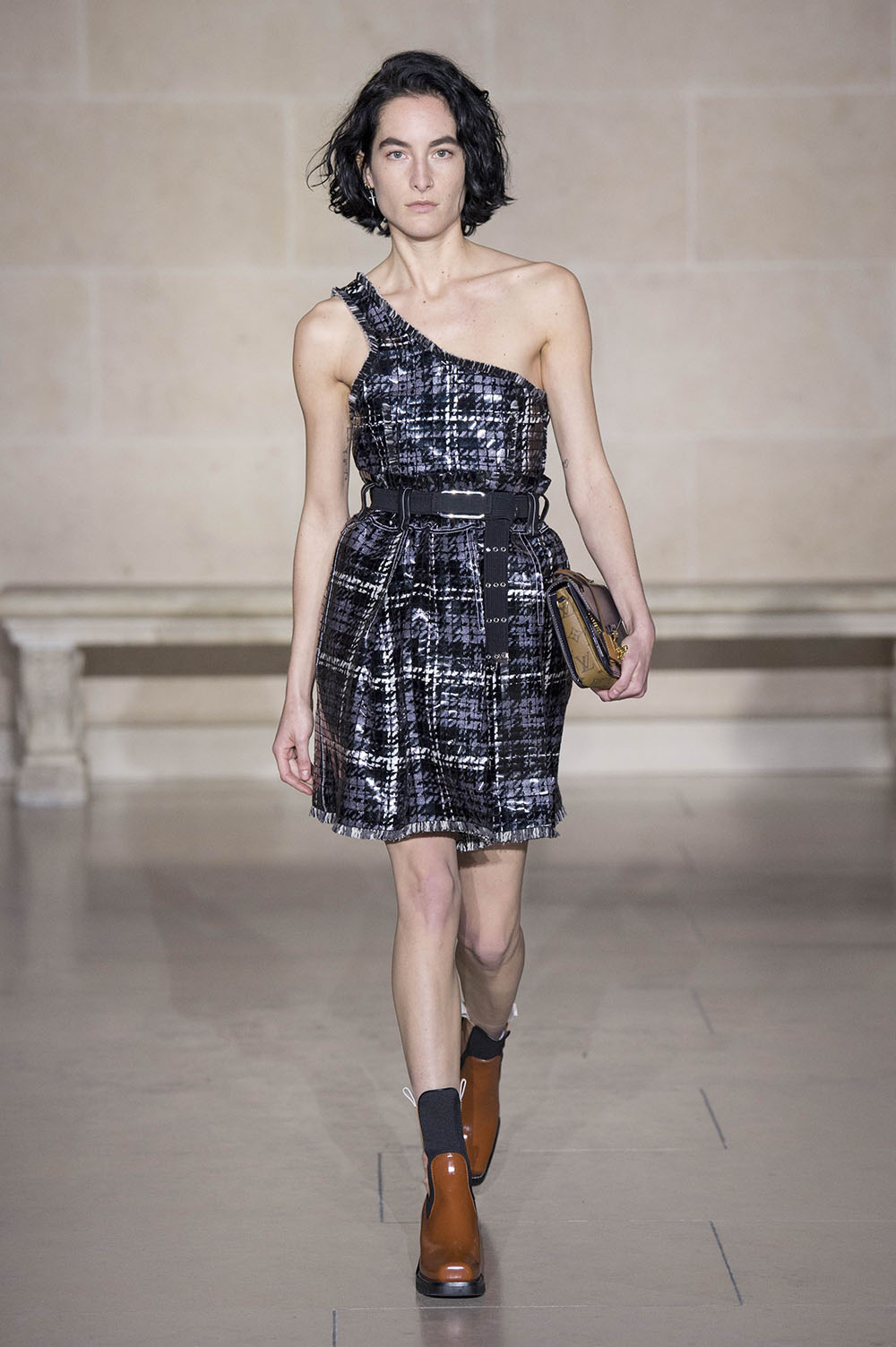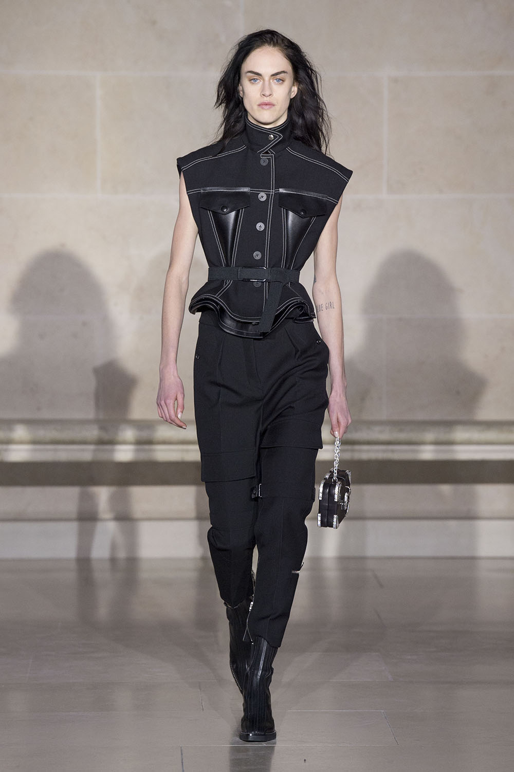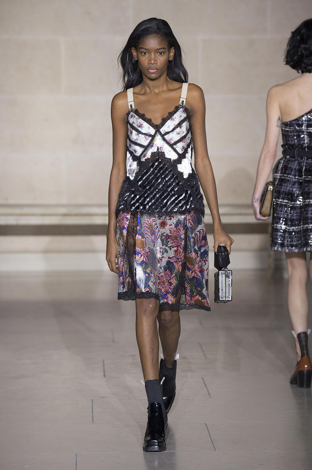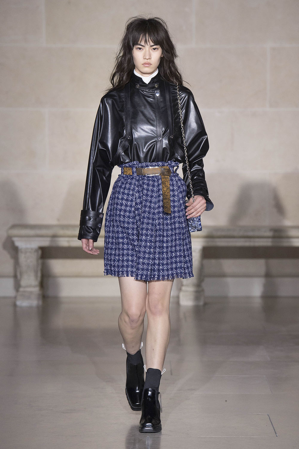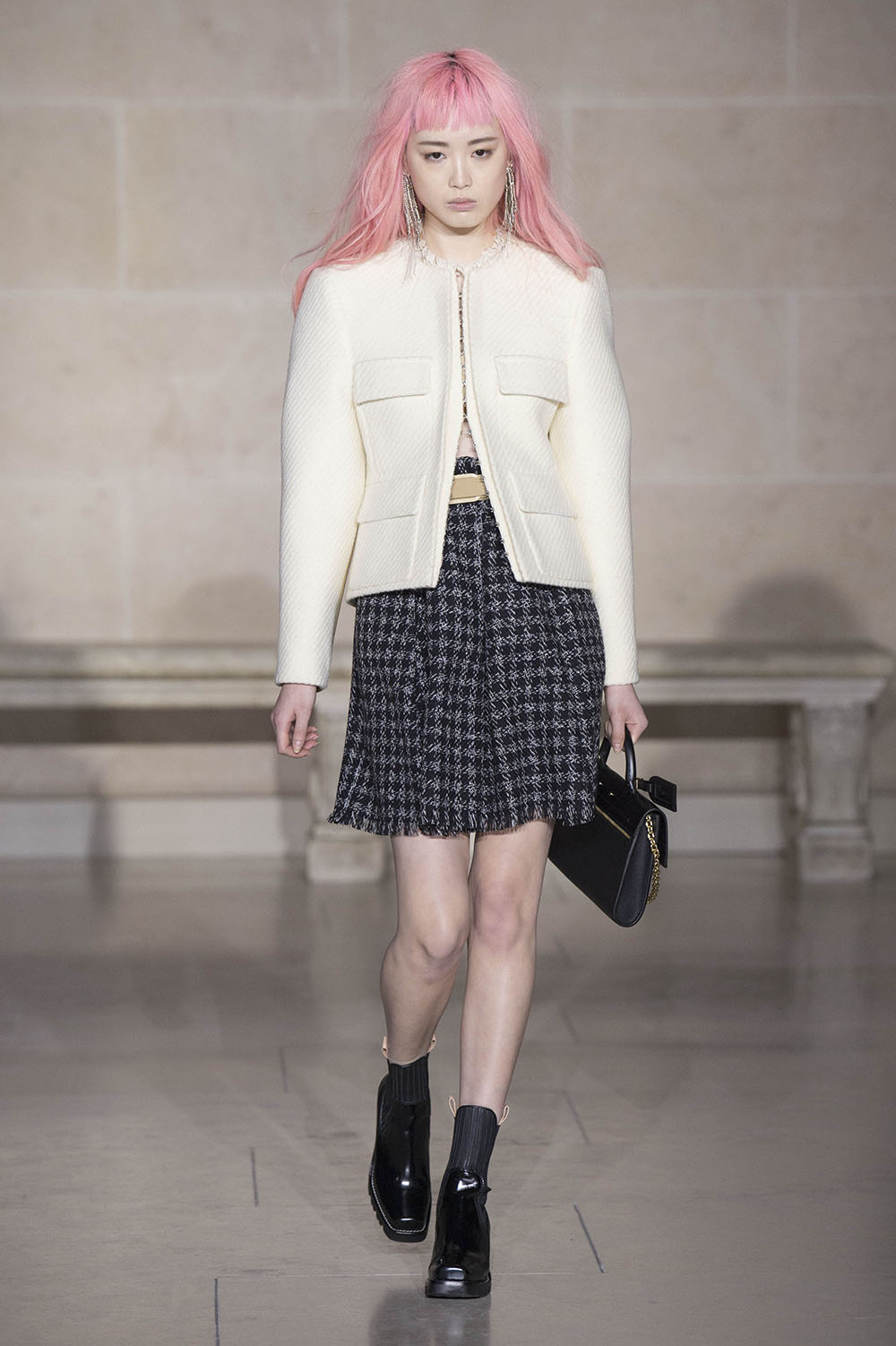 今季コレクションにおいて Nicolas Ghesquière は、フェミニ二ティとマスキュリニティ、伝統と革新、都会的なライフスタイルとノマドの感性など、相克する要素たちを融合させることでニューフロンティアを探索。ファーストルックで登場した Rianne van Rompaey (リアン・ヴァン・ロンパエイ) は、ヴィンテージ感のあるサテンドレスにシャープなブラックレザーのコート、そしてスポーティなトラウザーをレイヤー。ショー全体を通して、サテンやフローラルプリントのシフォン、ツイード、ラミネート加工を施したジャカード、オーロラのような光彩を放つオーガンザ、そしてファーやレザー、テクニカルファブリックなど、多様な素材使いとハイブリッドなスタイリングを提案している。