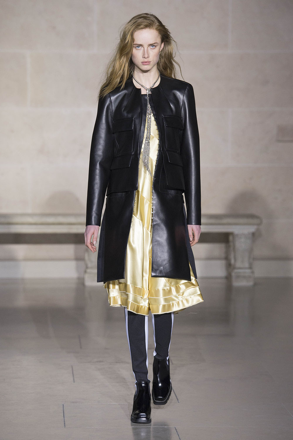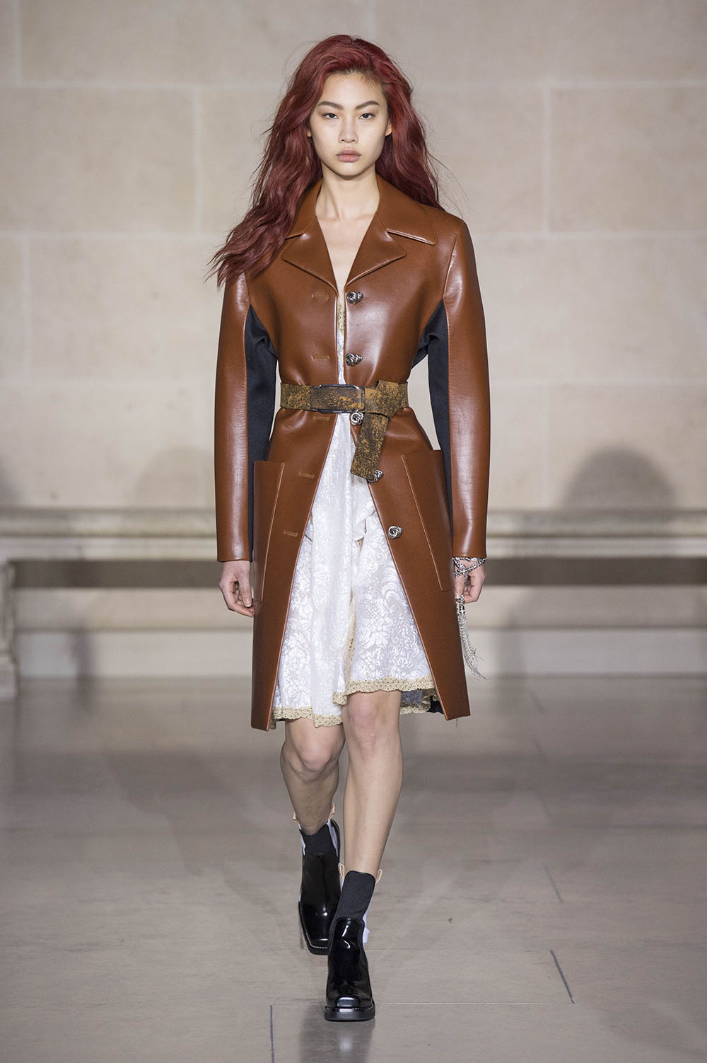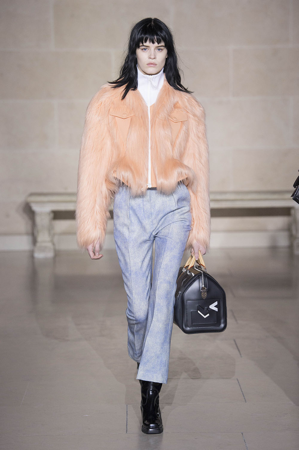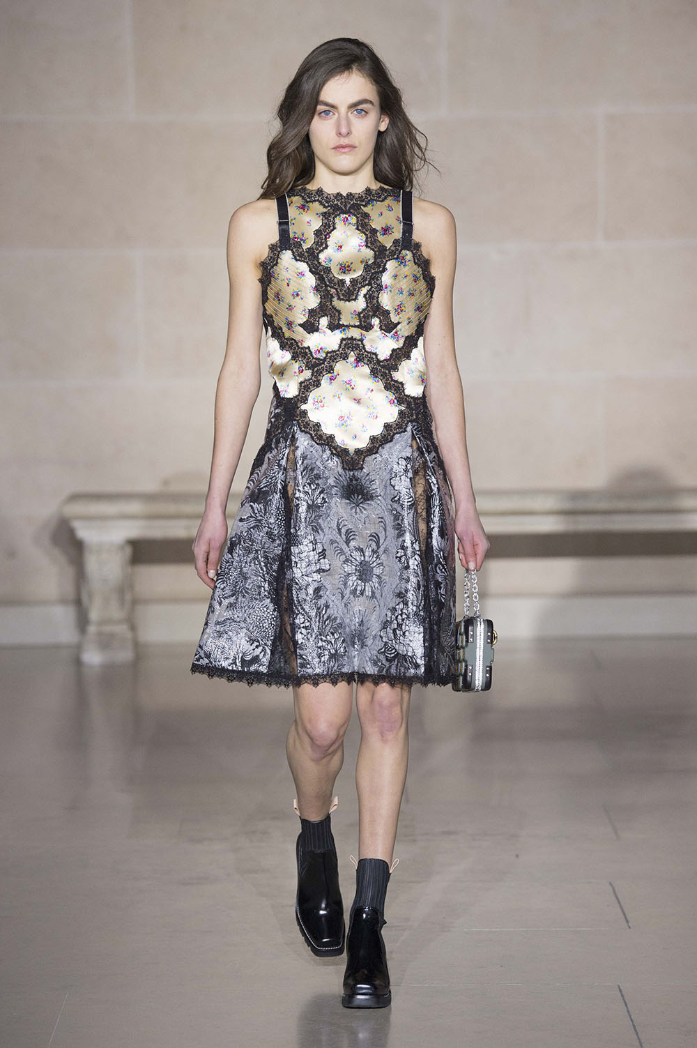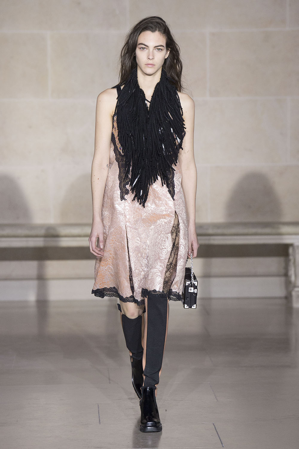 今季コレクションにおいて Nicolas Ghesquière は、フェミニ二ティとマスキュリニティ、伝統と革新、都会的なライフスタイルとノマドの感性など、相克する要素たちを融合させることでニューフロンティアを探索。ファーストルックで登場した Rianne van Rompaey (リアン・ヴァン・ロンパエイ) は、ヴィンテージ感のあるサテンドレスにシャープなブラックレザーのコート、そしてスポーティなトラウザーをレイヤー。ショー全体を通して、サテンやフローラルプリントのシフォン、ツイード、ラミネート加工を施したジャカード、オーロラのような光彩を放つオーガンザ、そしてファーやレザー、テクニカルファブリックなど、多様な素材使いとハイブリッドなスタイリングを提案している。