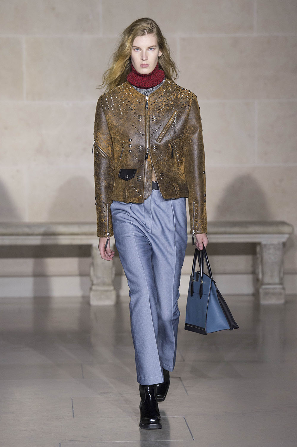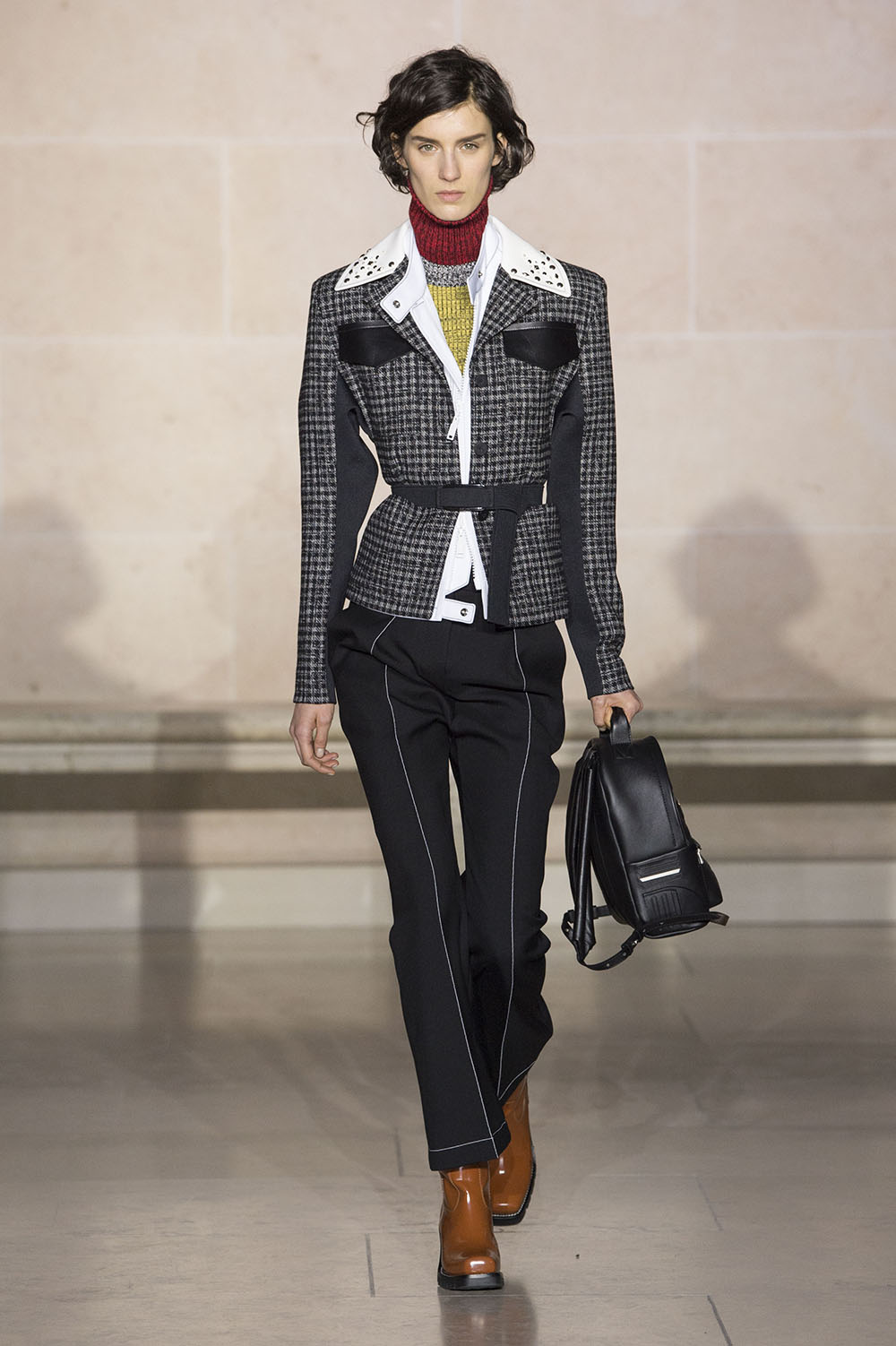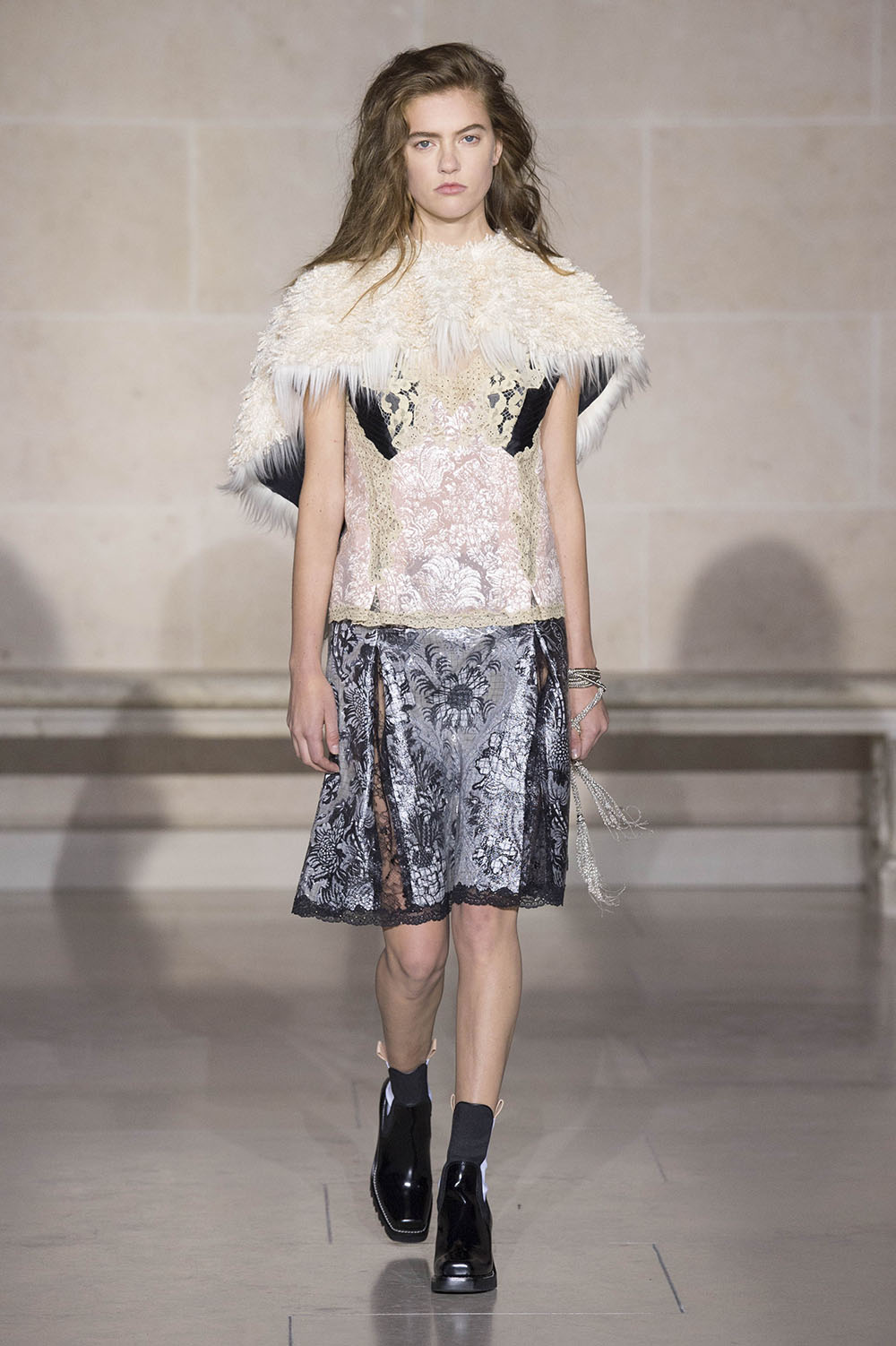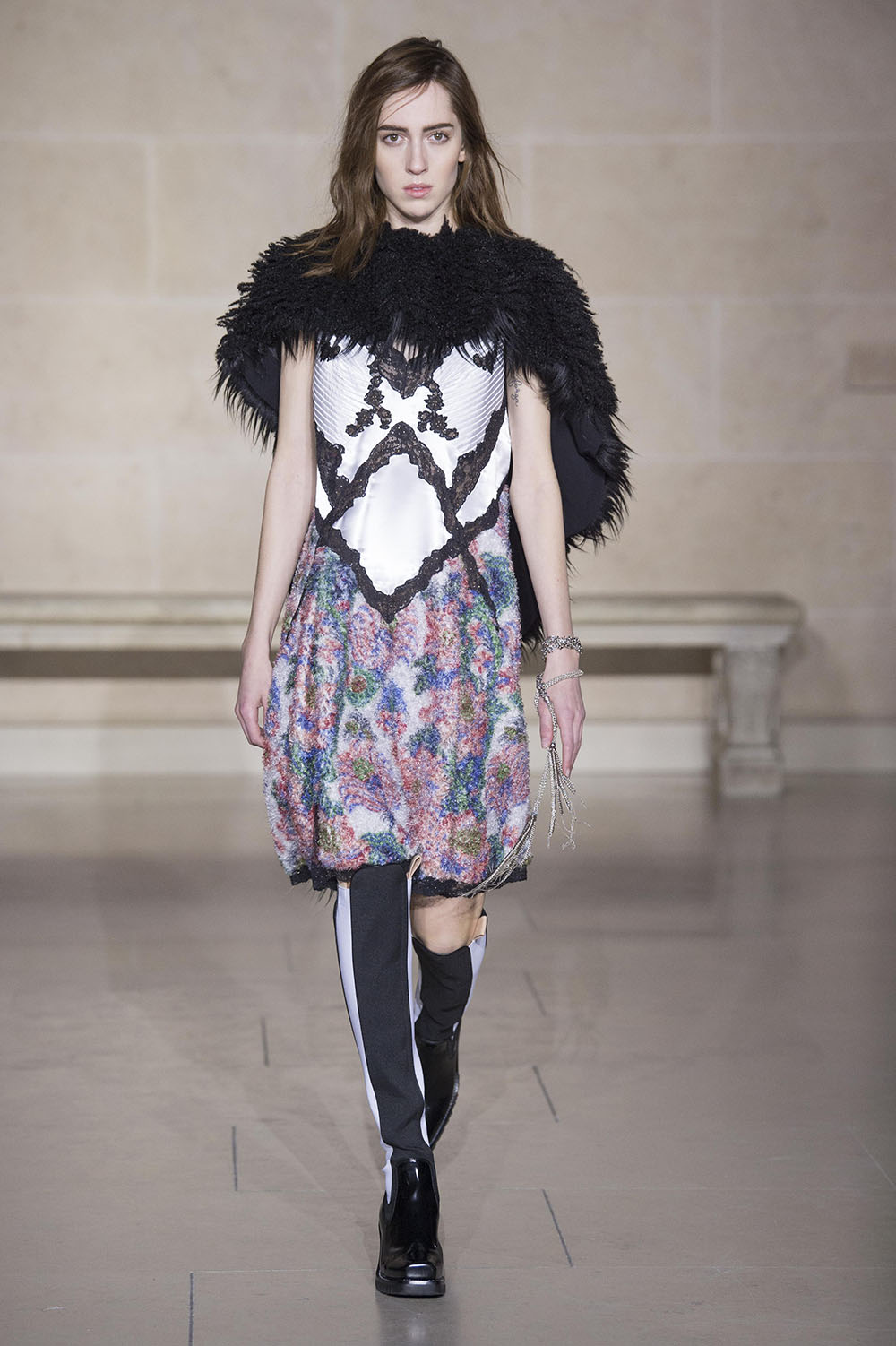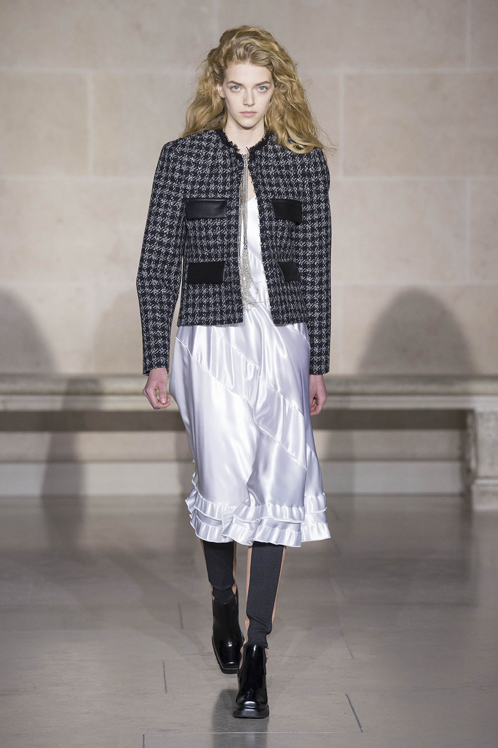 今季コレクションにおいて Nicolas Ghesquière は、フェミニ二ティとマスキュリニティ、伝統と革新、都会的なライフスタイルとノマドの感性など、相克する要素たちを融合させることでニューフロンティアを探索。ファーストルックで登場した Rianne van Rompaey (リアン・ヴァン・ロンパエイ) は、ヴィンテージ感のあるサテンドレスにシャープなブラックレザーのコート、そしてスポーティなトラウザーをレイヤー。ショー全体を通して、サテンやフローラルプリントのシフォン、ツイード、ラミネート加工を施したジャカード、オーロラのような光彩を放つオーガンザ、そしてファーやレザー、テクニカルファブリックなど、多様な素材使いとハイブリッドなスタイリングを提案している。
