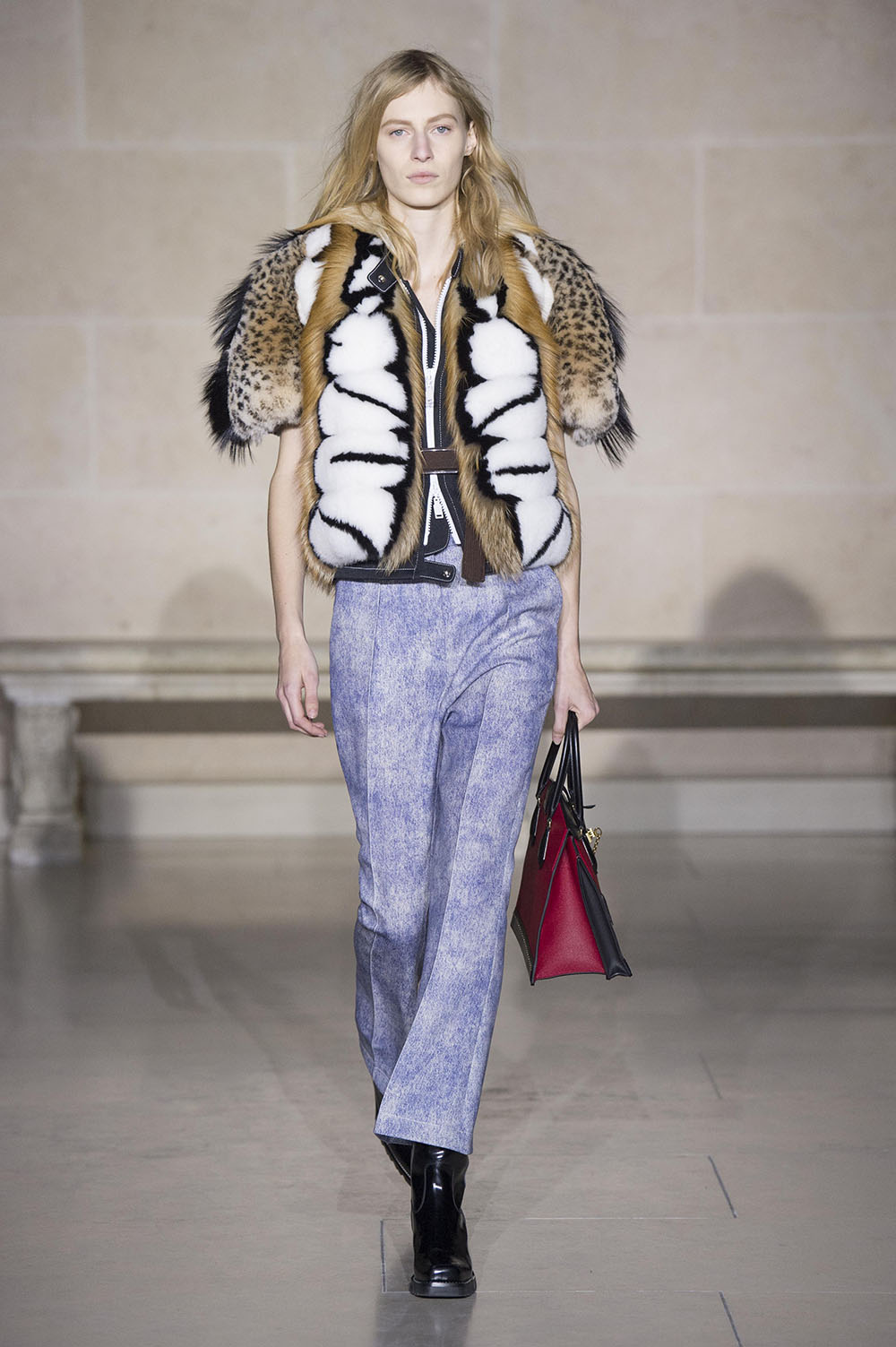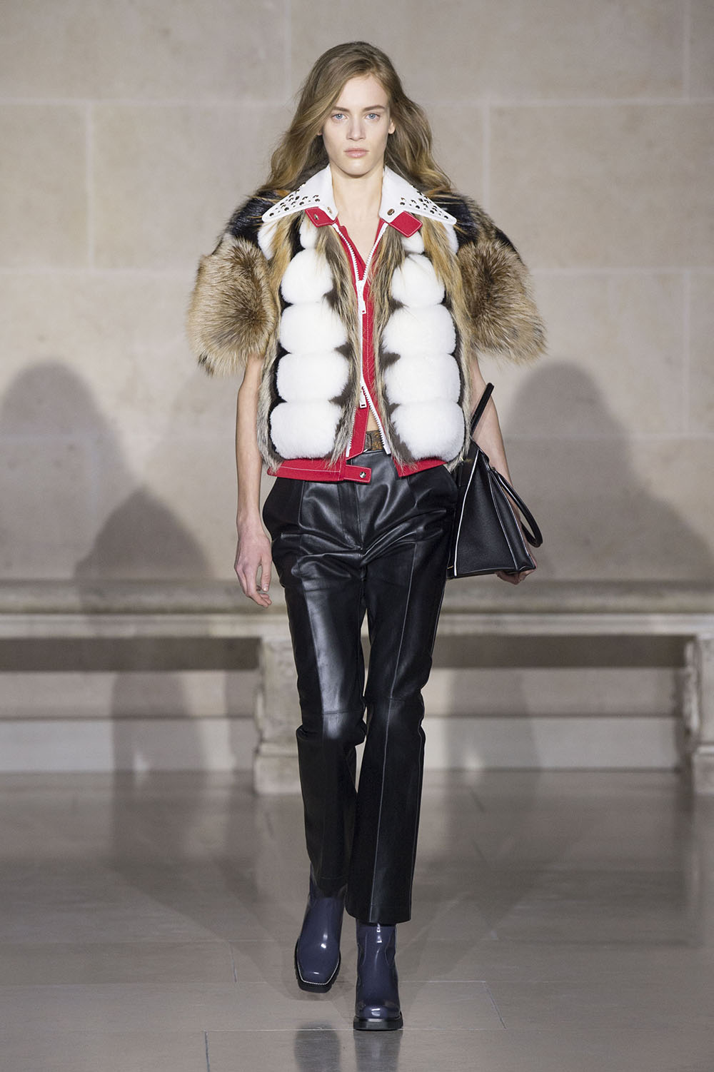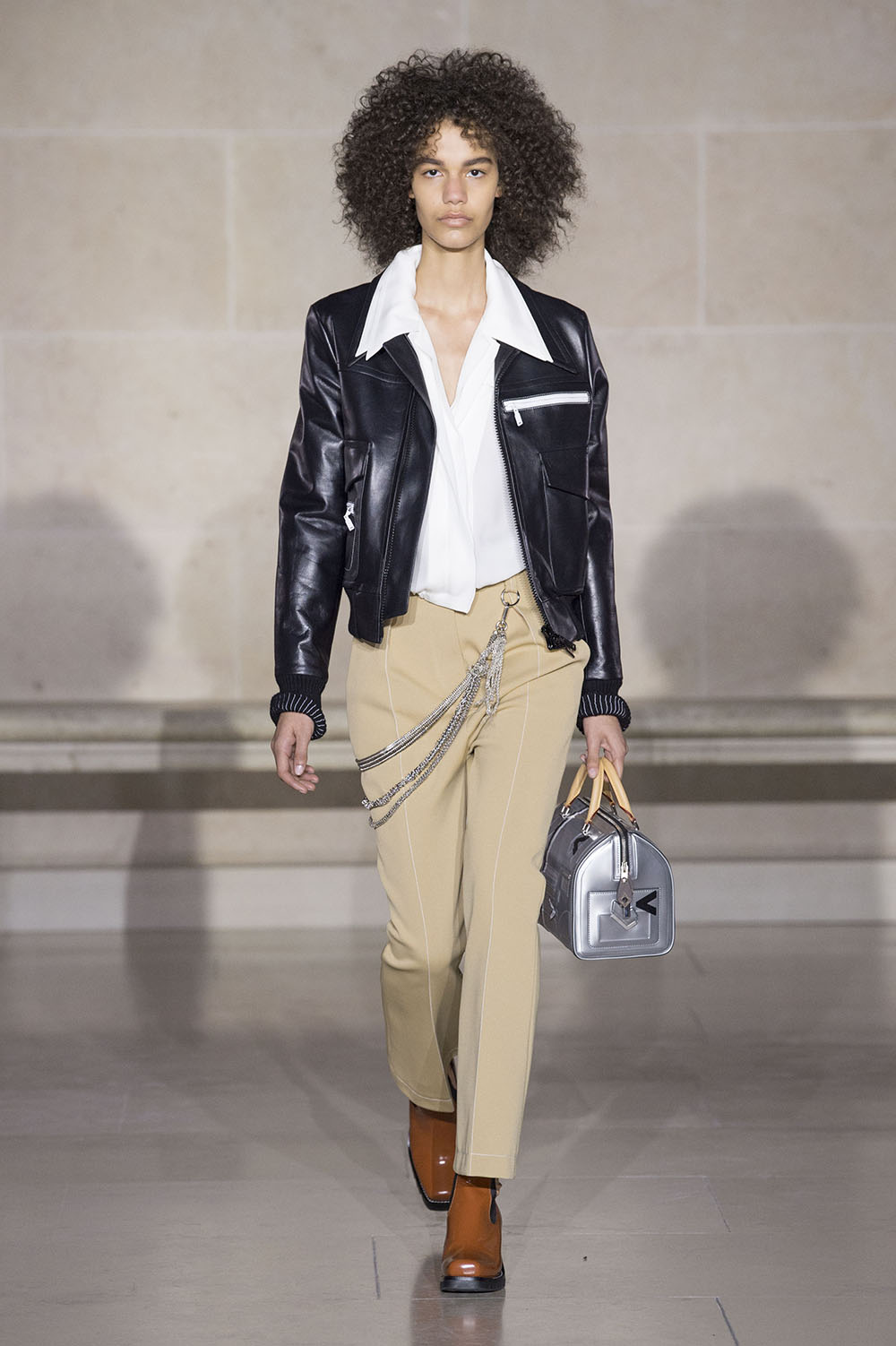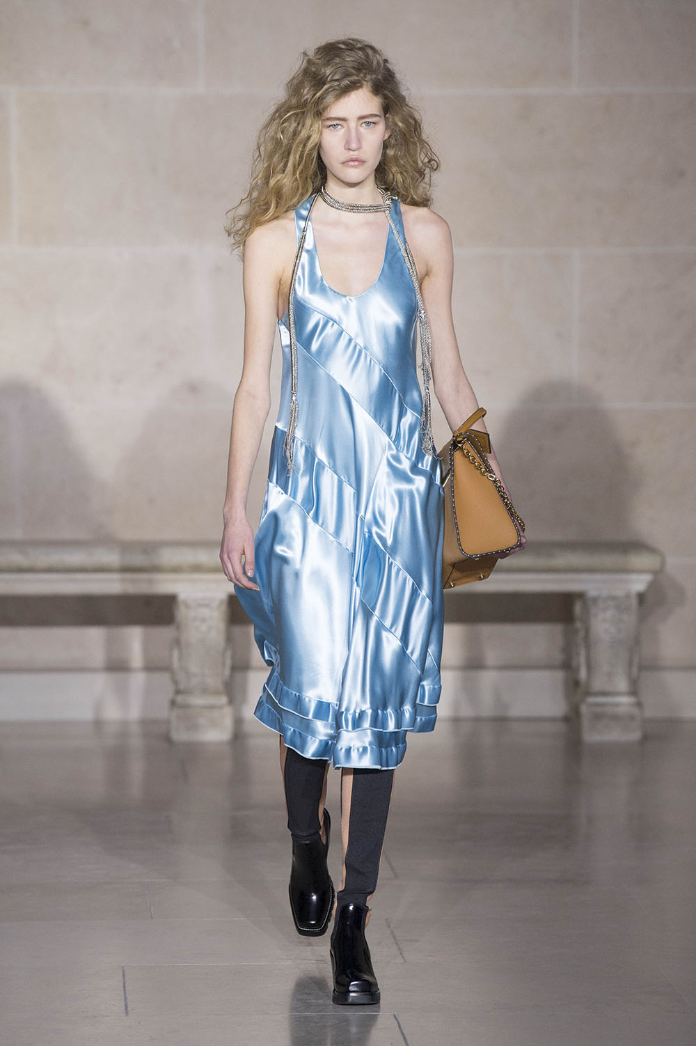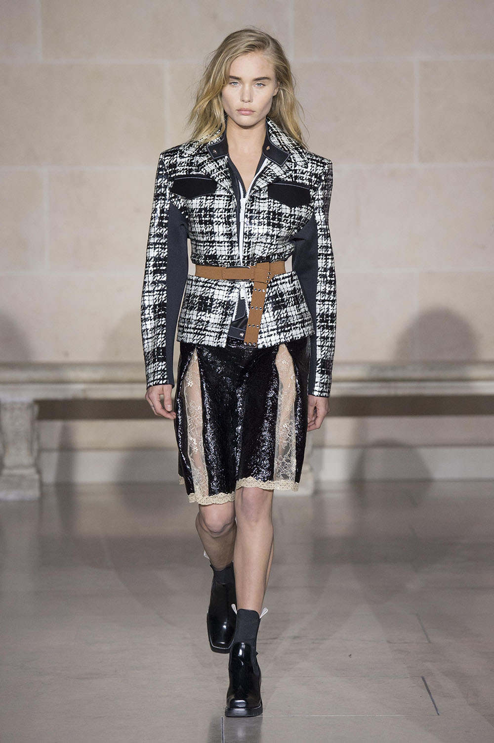 今季コレクションにおいて Nicolas Ghesquière は、フェミニ二ティとマスキュリニティ、伝統と革新、都会的なライフスタイルとノマドの感性など、相克する要素たちを融合させることでニューフロンティアを探索。ファーストルックで登場した Rianne van Rompaey (リアン・ヴァン・ロンパエイ) は、ヴィンテージ感のあるサテンドレスにシャープなブラックレザーのコート、そしてスポーティなトラウザーをレイヤー。ショー全体を通して、サテンやフローラルプリントのシフォン、ツイード、ラミネート加工を施したジャカード、オーロラのような光彩を放つオーガンザ、そしてファーやレザー、テクニカルファブリックなど、多様な素材使いとハイブリッドなスタイリングを提案している。