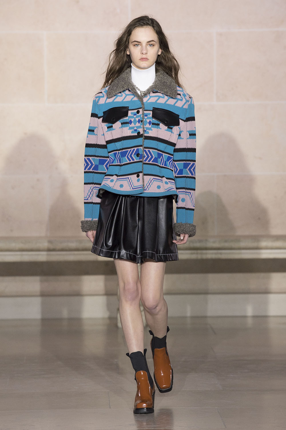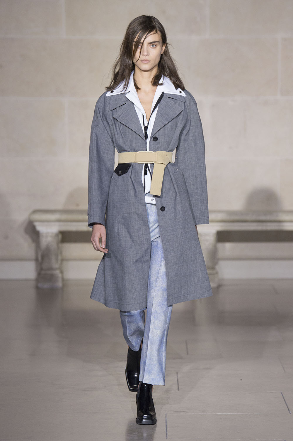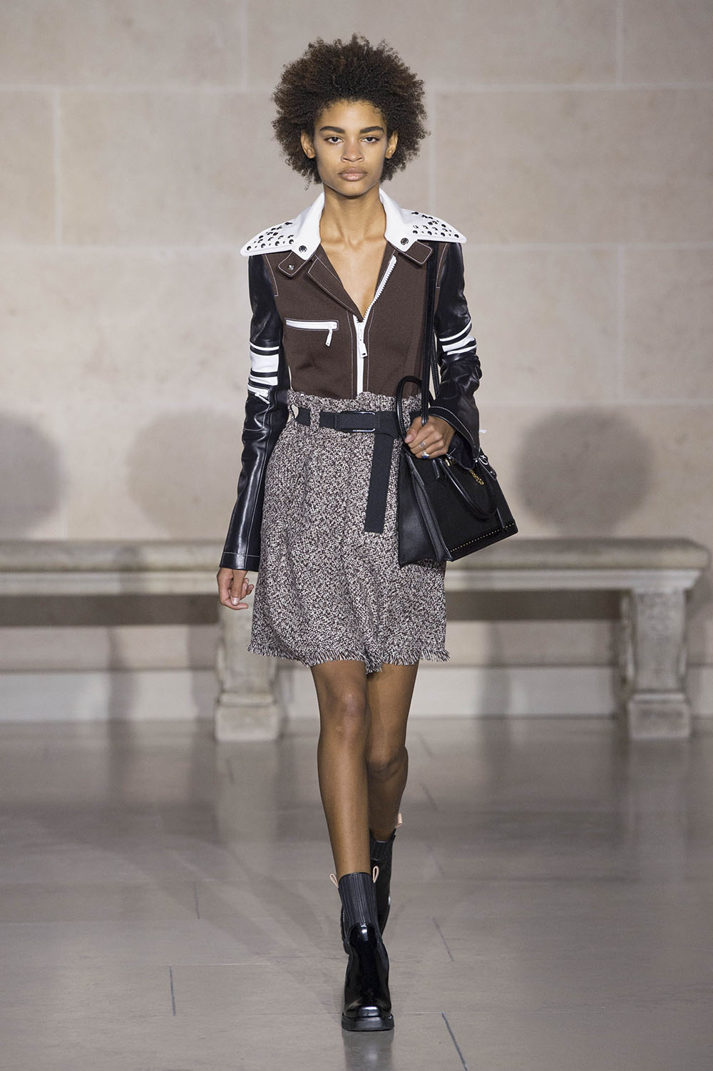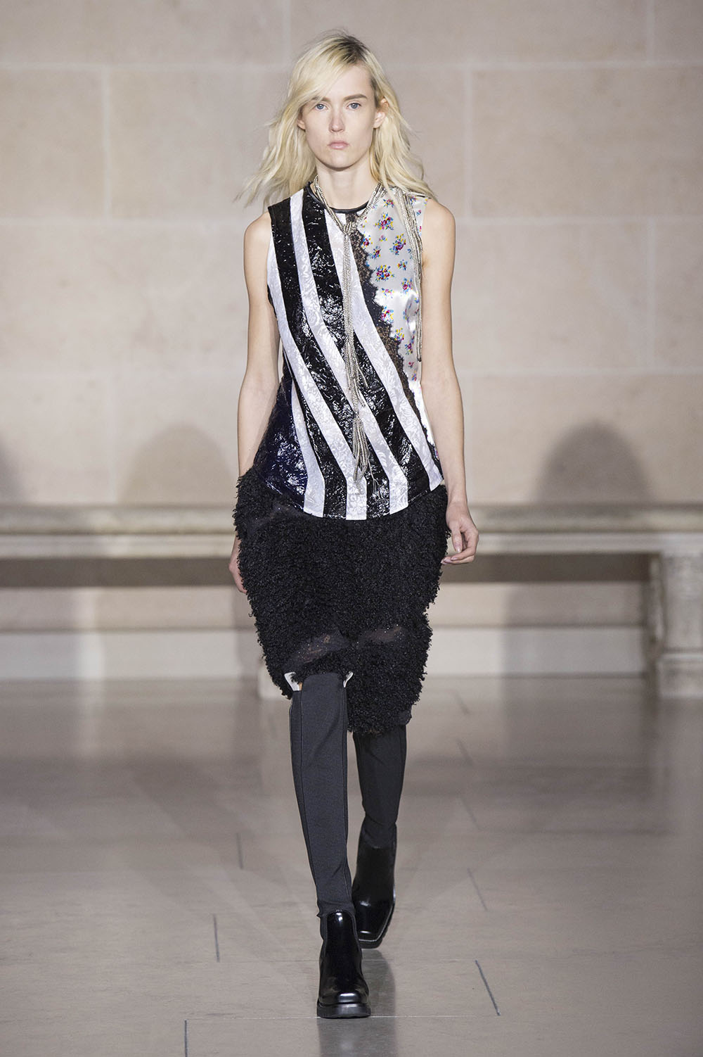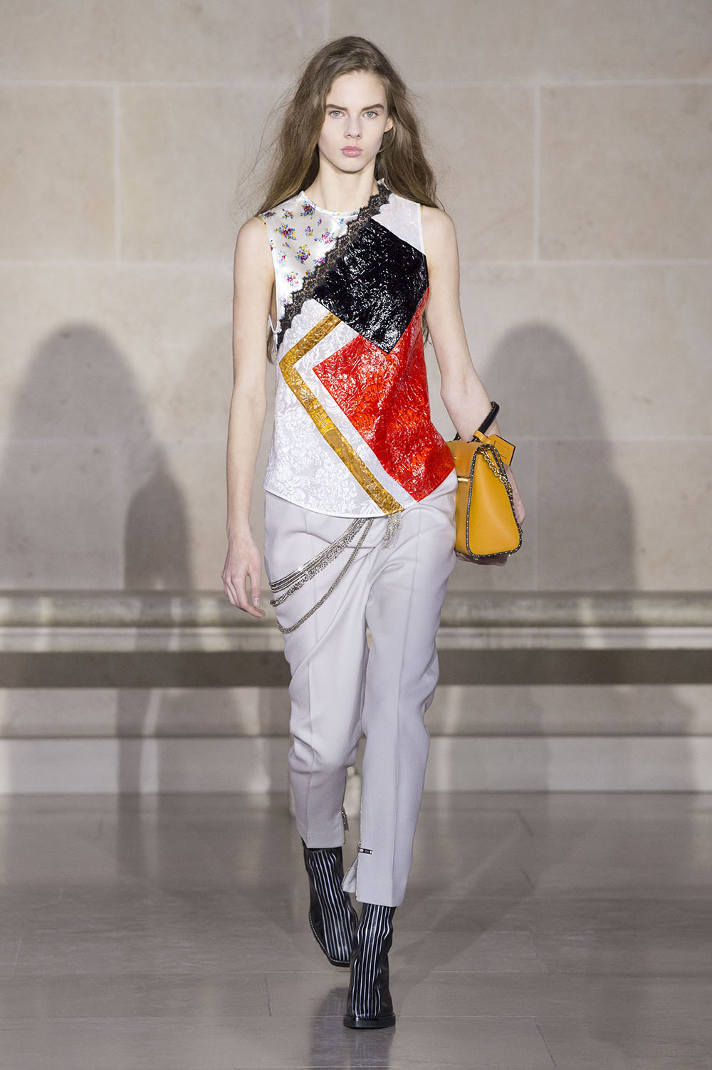 今季コレクションにおいて Nicolas Ghesquière は、フェミニ二ティとマスキュリニティ、伝統と革新、都会的なライフスタイルとノマドの感性など、相克する要素たちを融合させることでニューフロンティアを探索。ファーストルックで登場した Rianne van Rompaey (リアン・ヴァン・ロンパエイ) は、ヴィンテージ感のあるサテンドレスにシャープなブラックレザーのコート、そしてスポーティなトラウザーをレイヤー。ショー全体を通して、サテンやフローラルプリントのシフォン、ツイード、ラミネート加工を施したジャカード、オーロラのような光彩を放つオーガンザ、そしてファーやレザー、テクニカルファブリックなど、多様な素材使いとハイブリッドなスタイリングを提案している。