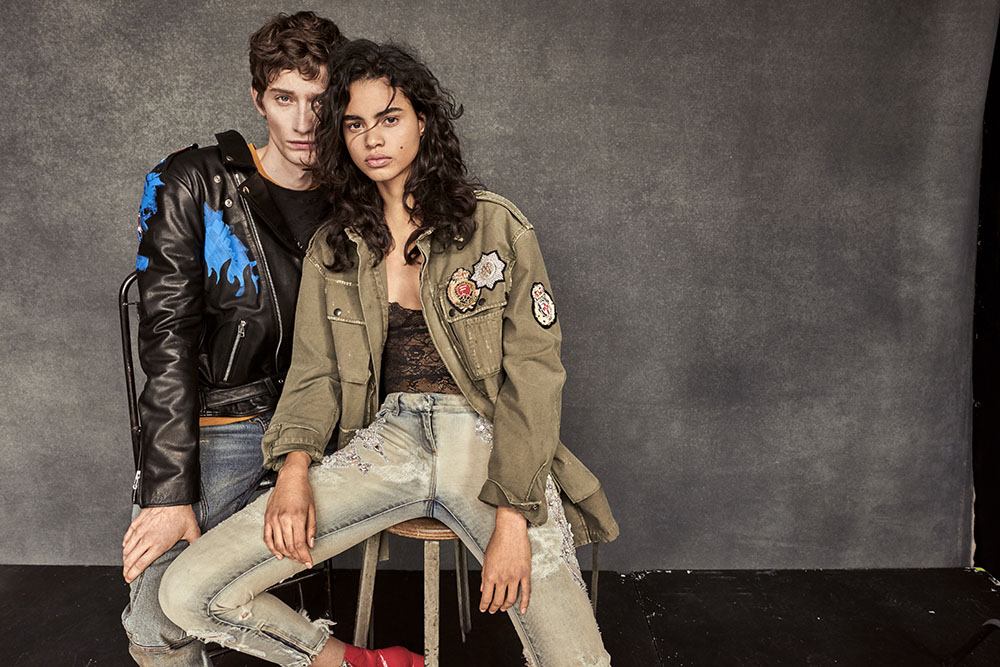 ランウェイで披露されたのは、34体のメンズ、ウィメンズルック。ネオンカラーのニット、ケミカルウォッシュのデストロイデニム、総スパンコールのトラックパンツ、そしてレースのマイクロミニドレス。コレクションの一部は、ラグジュアリー E コマースプラットフォームの Farfetch (ファーフェッチ) とのコラボにより制作され、ショーの当日よりウェブサイト限定で発売された。