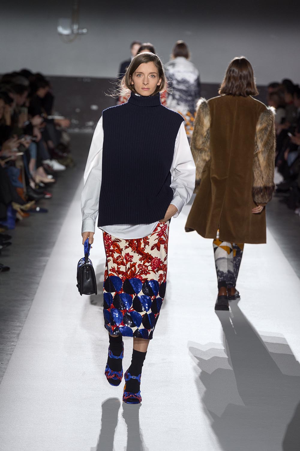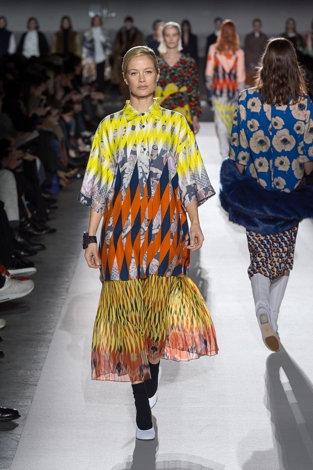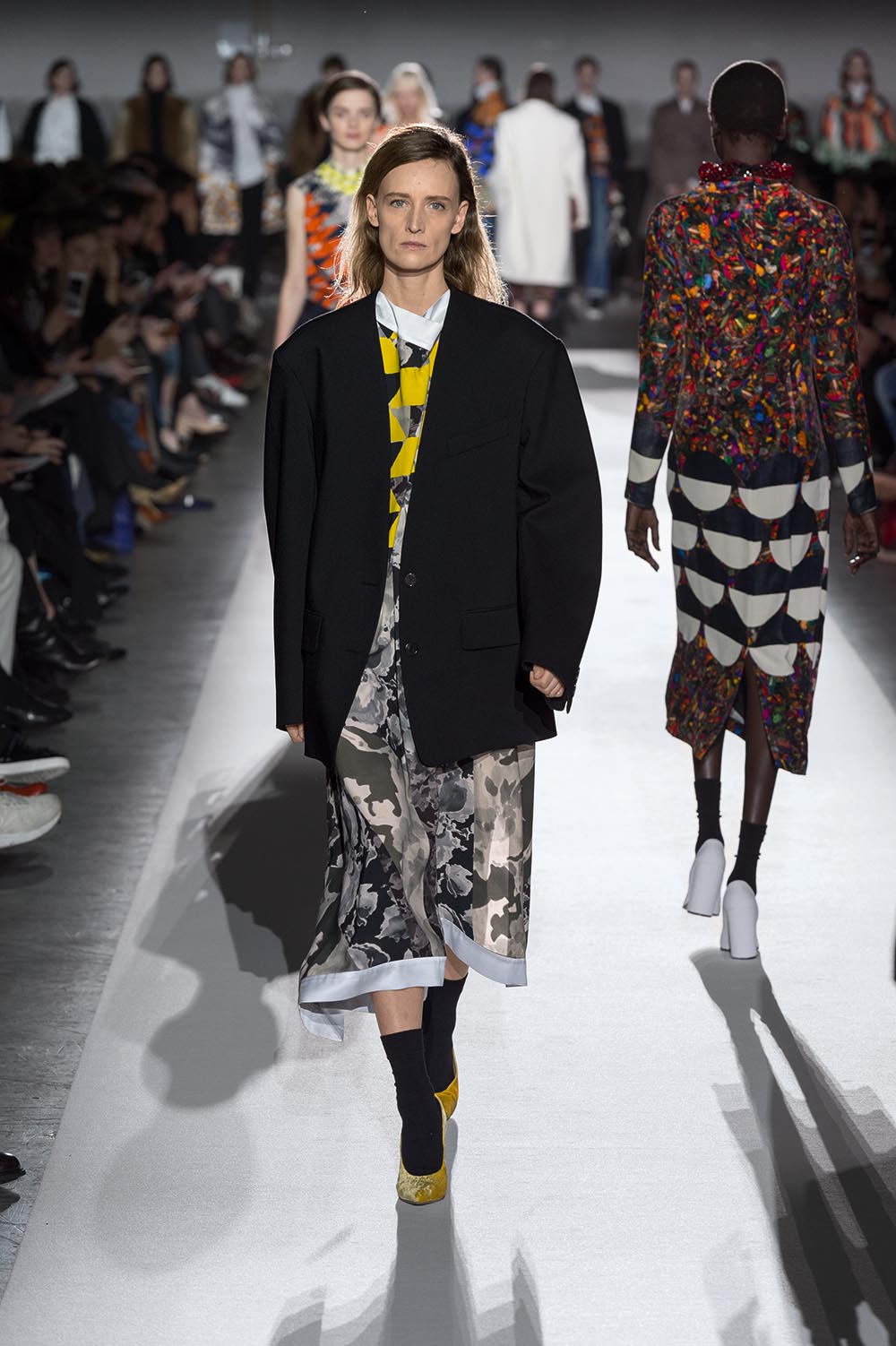 パリ、ファッショウィーク期間中に当たる1日、Dries Van Noten (ドリス ヴァン ノッテン) による2017-18年秋冬 ウィメンズウェア コレクションが発表された。1991年にパリで初めてのメンズショーを発表してから26年、通算100回目のランウェイショーとなる今季、コレクションではブランドの DNA であるプリント、シルエット、精巧なディティールワーク、サウンドトラック、そしてモデルという5つのエレメントにフォーカス。63体のルックでは、アースカラーやモノトーンのシックなテーラリングと、これまでのコレクションの中から選ばれたプリントのリワーク、そしてイリデッセントな輝きを放つメタリックファブリックなど異なる表情のマテリアルを巧みに折り合わせたスタイリングを披露。Nadja Auermann (ナジャ・アウアマン)、Amber Valletta (アンバー・ヴァレッタ)、Carolyn Murphy (キャロリン・マーフィー) など往年のトップモデルのオンパレードは、アニバーサリーを控えめに、それでいて力強く祝福した。