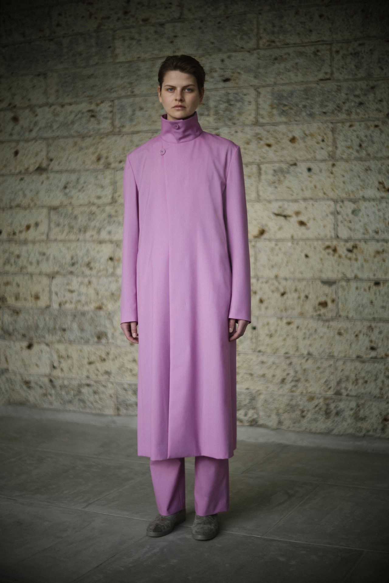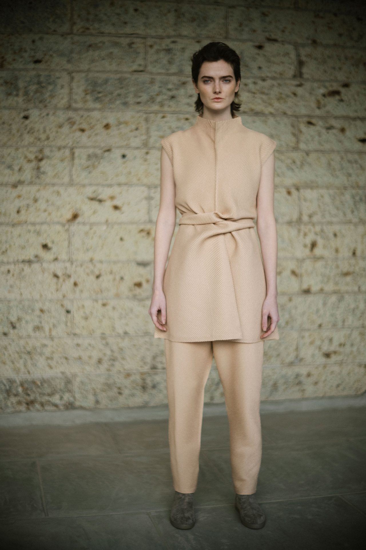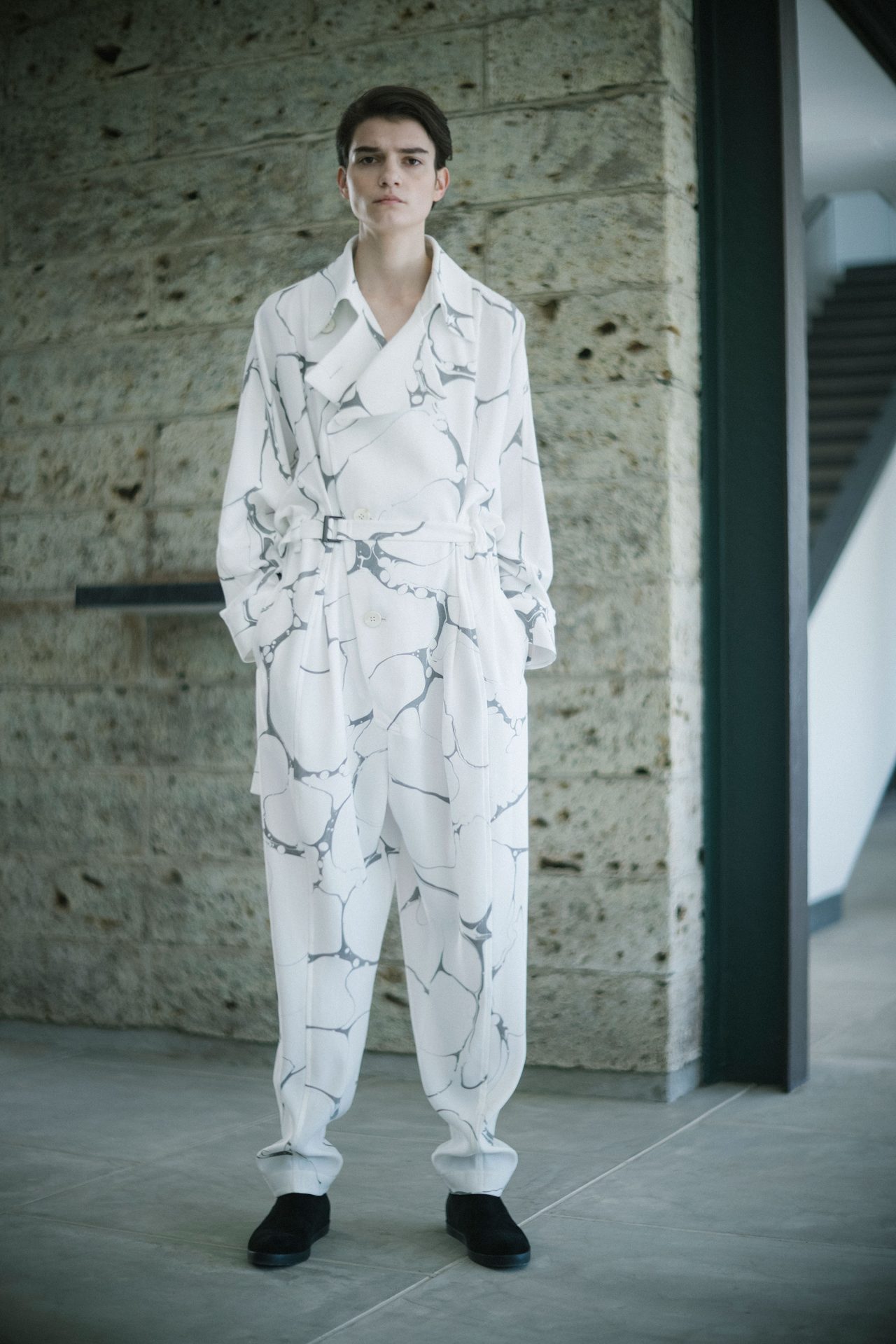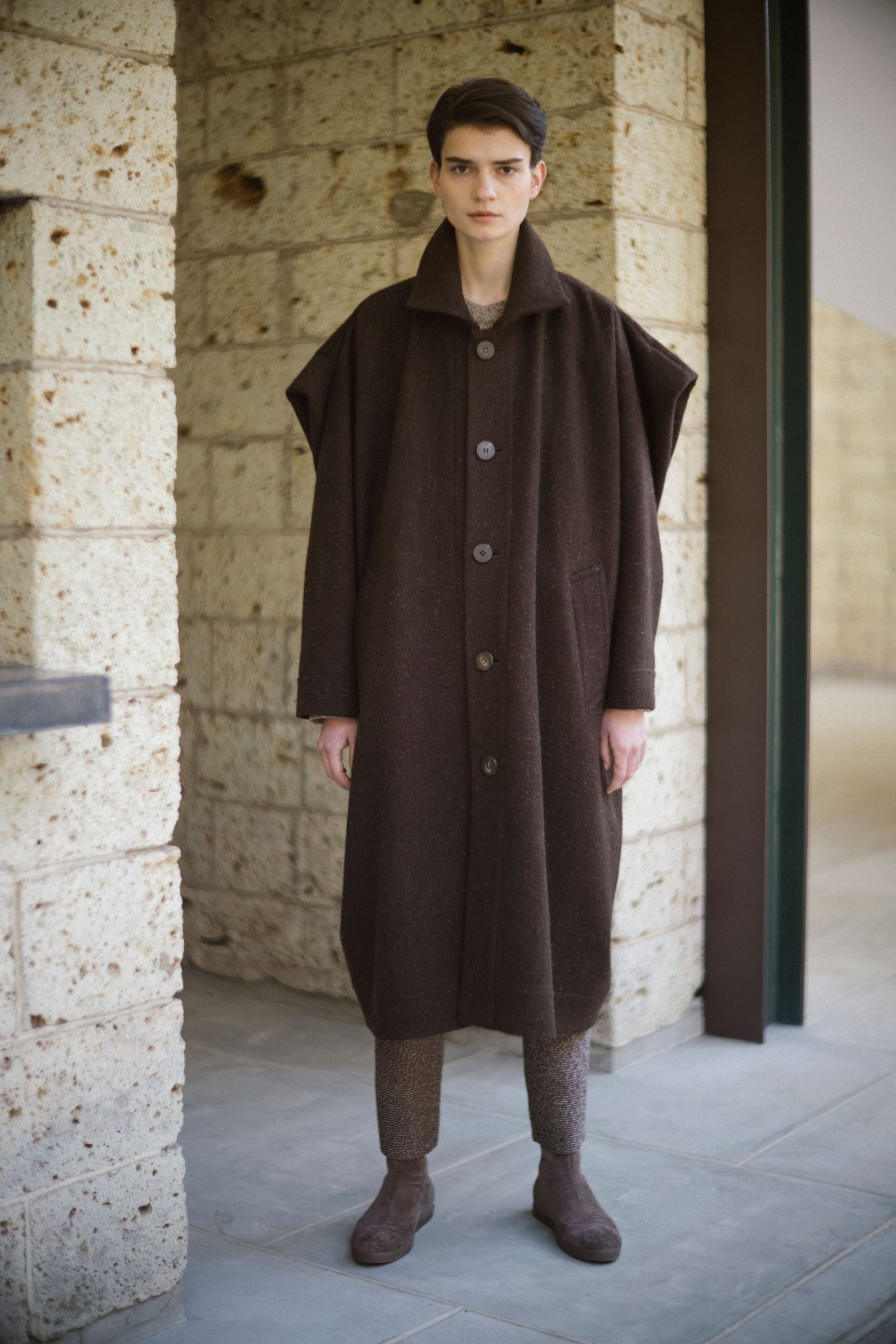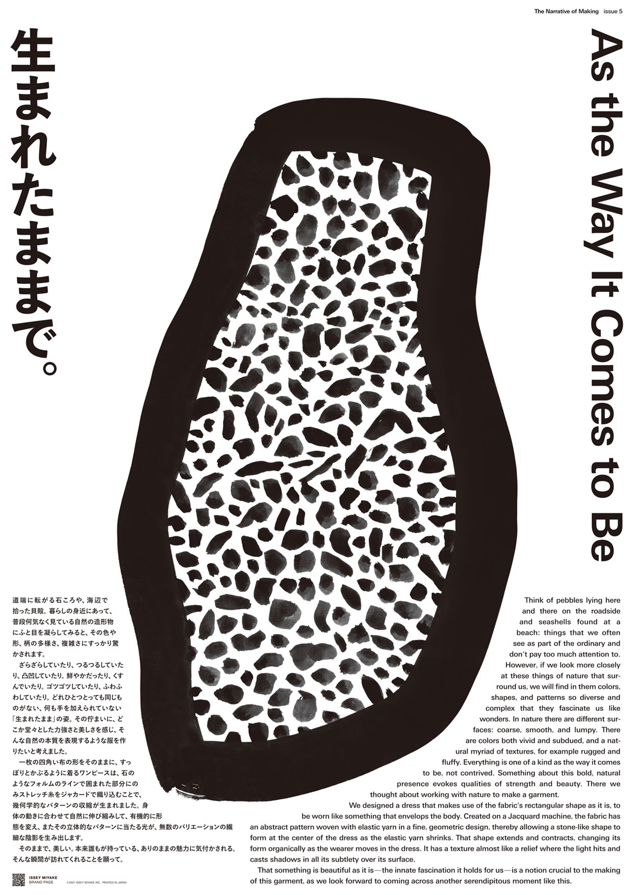そして今シーズン。これまでカラフルだったコレクションの印象はぐっと落ち着いて、静謐なムードをまとった色、柄、形。ウールやオーガニックコットンは無染色のままで服に仕立てられており、特殊な素材加工のノウハウを持つ ISSEY MIYAKE としても新鮮な提案に映る。テーマは “As the Way It Comes to Be -生まれたままで-” 。「最初のインスピレーションは、卵や石、貝殻など自然の造形物だった」 と話す近藤が2021年の秋冬に向けて描いた景色は、かつてなく静かで壮観である。