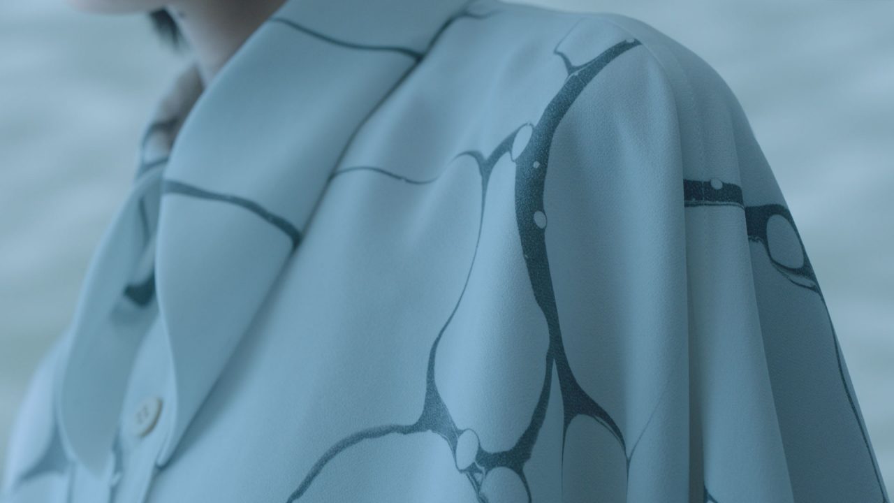 墨流しは、今回のインスピレーションのひとつである “石” を表現したくてたどり着いた京都の伝統技法です。柄の出方の検証を重ね、十数種類ほど試作した中から今回はエレガントに見える素材を選んでいます。墨流しは水面に染料を垂らしてマーブル模様をつくり、素材に写しとる手仕事なので、1枚ごとに柄が少しずつ異なります。