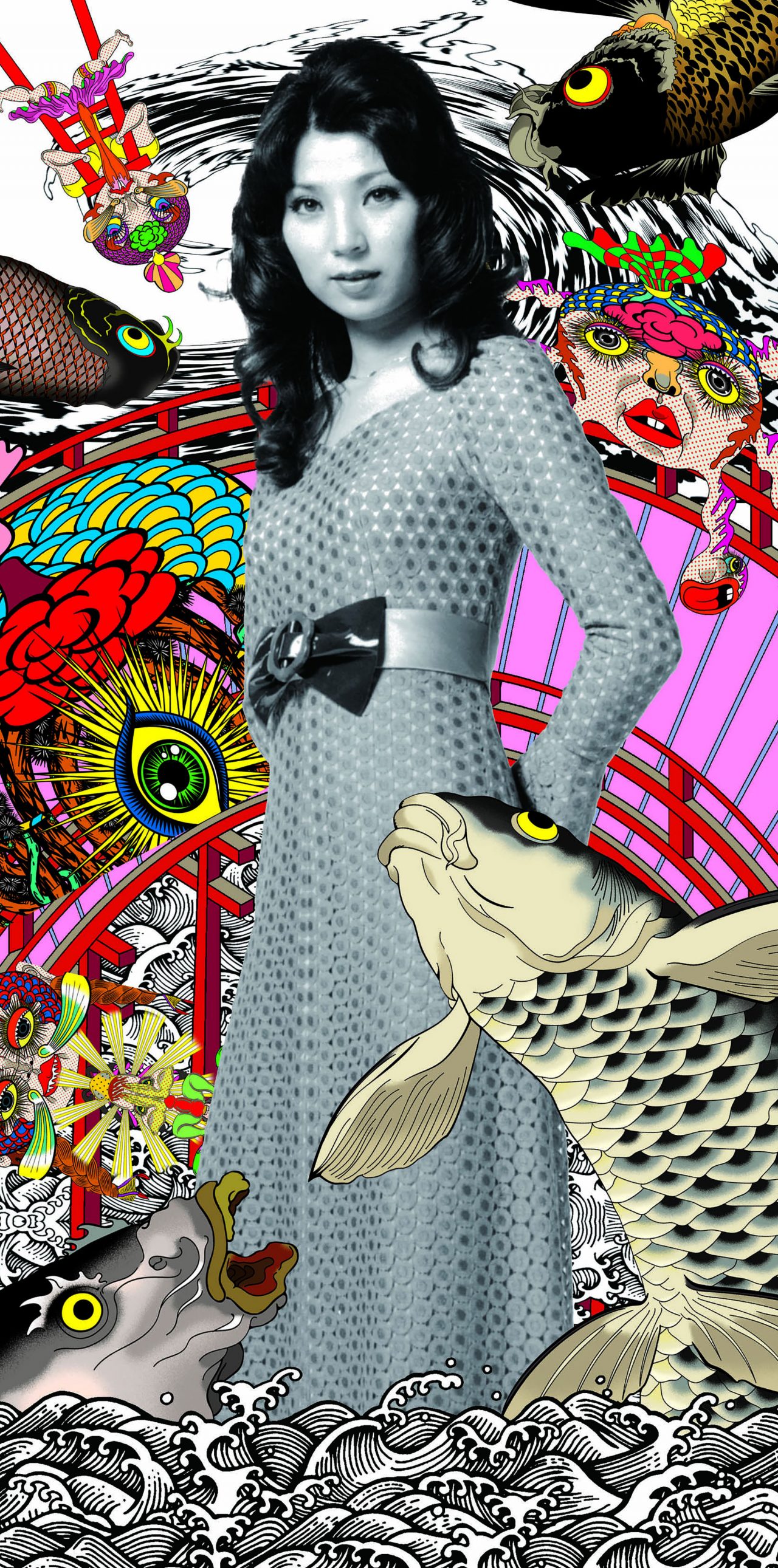宇川:コラージュって時間芸術だと思っているんですよ。例えば、『PLAYBOY』の新聞広告にハサミを入れて、プレイメイトの顔の部分だけを、70年代の自転車のカタログと合体させる。シュルレアリスムの手法にデペイズマンがありますが、ロートレアモン(伯爵)が言い当てた『マルドロールの歌』のような不意の出会いが生んだ物語ですよね。プレイメイトは理由があって其処に裸体として印刷されていたわけです。それが70年代に日本で大流行したフラッシャー自転車と時空を超えて一体化している。その歴史と文化と印刷技術と時間の経過を1フレームに収めてるのがコラージュ作品ですよね。先ほど語ったロートレアモンの詩はね、有名だから詠むのが恥ずかしいですが「解剖台の上でのミシンとこうもりがさの不意の出会いのように美しい」ですよね。だから僕がなんで今もコラージュを続けているかと言うと、今もミシン(テクノロジー)とこうもり傘(伝統)を出会わせたハサミや糊のように生きたいと思っているから(笑)。だから田名網敬一師匠と GENERATIONS や Nina Kraviz、八代亜紀さんを媒介して、今もグラフィック手術をしてるんですよ。