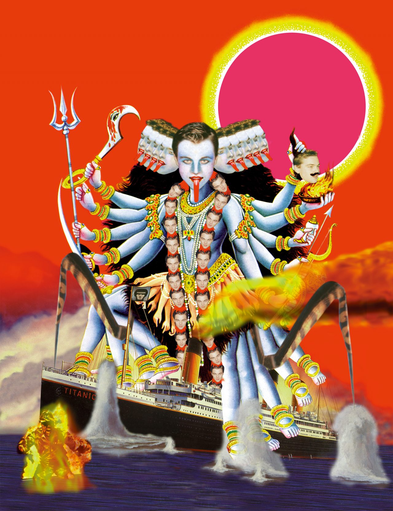 宇川:そう、まさに今、河村くんが実践しているような鋏と糊の世界です。1回貼ったあとは戻れないし、さっきも話したけどタトゥーの世界です。DTPなので、つまり手彫りじゃなくて機械彫り(笑)。そしてあの頃の Mac はよく落ちてたんですよ。今の Photoshop は自動で保存してくれるのでたとえ落ちても直前まで戻れますよね。なので、この頃は大量のイメージが1枚のフレームに入っているっていうこと自体がまだまだ目新しかった時代だと考えられますね。そういう意味では、横尾(忠則)さんのコラージュには影響受けていると思います。あの森羅万象全てを1フレームに閉じ込めようとする意思。田名網先生を筆頭に、60年代の先輩方の隔世遺伝的な細胞は確実に今の自分に宿っています。