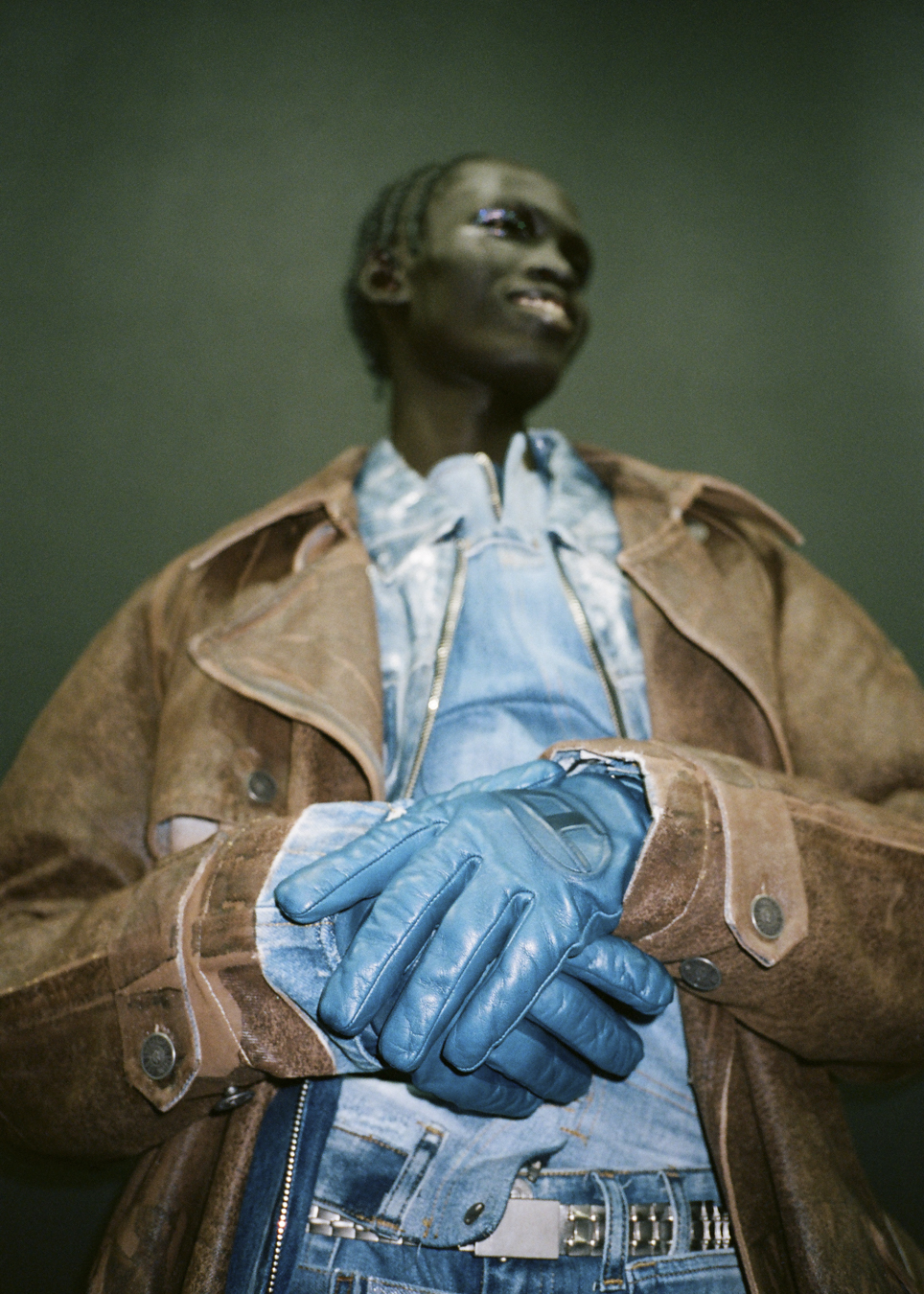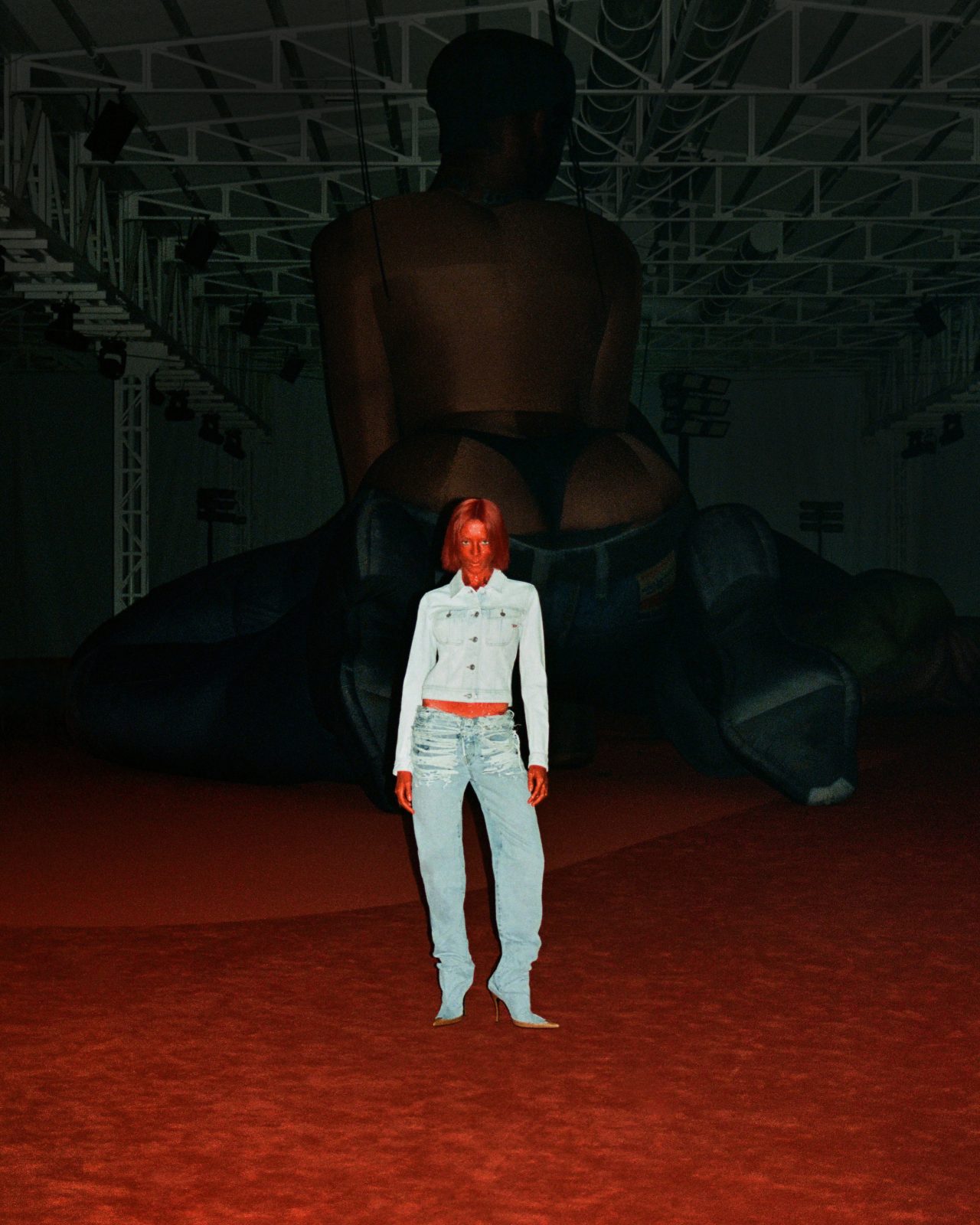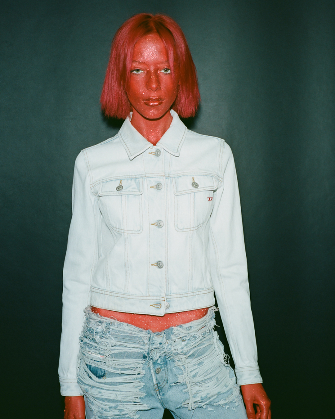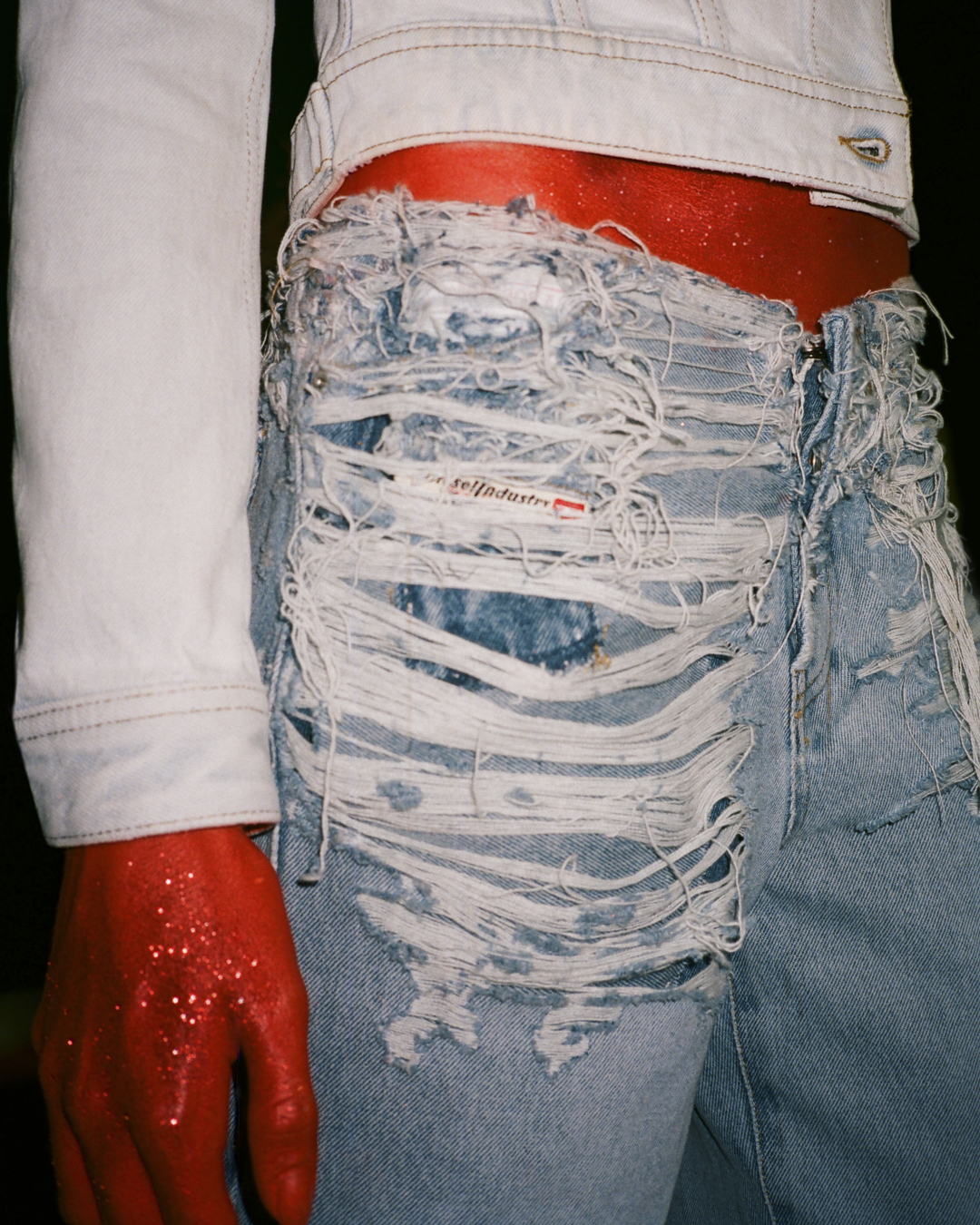 「このテイストは私のルーツも大いに関係しています。地元のブルージュは素晴らしい建築物に囲まれているのですが、同時にとても工業的で、イタリアや南フランスの街とは明らかに違う。ですから、『予想外のものの中に美しさを探す』必要があるんです。コレクションのテーマ的なことでいえば、DIESEL の DNA はもともとポップカルチャーやユーティリティウェアに組み込まれているので、そのブランドの価値を称えることにフォーカスしました。それに、DIESEL は『デニムという言語』を持っているので、今回のコレクションはすべてデニムに関するものにしたくて。 私たちがデニムを使って何をするか、どう作るか、それをどう着こなすか。具体的には、ジーンズのウエスト部分やジャケットのネックラインなど普段は触れないような場所にディストーションを施したり、超大型のデニムベルトでミニスカートを作ったり、あるいは、セカンドスキンやカチューシャにジャカードでデニムのトロンプルイユ (だまし絵) を描いたり。つまり私がここで実践しているのは、デニムに対する既存のイメージをどう覆すか、ということなんです。」