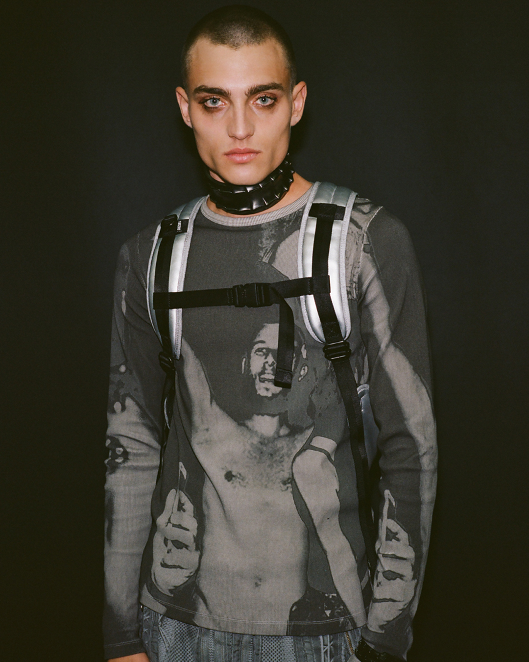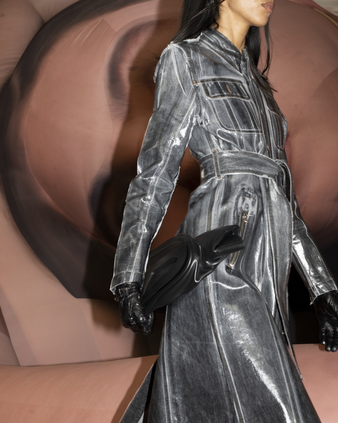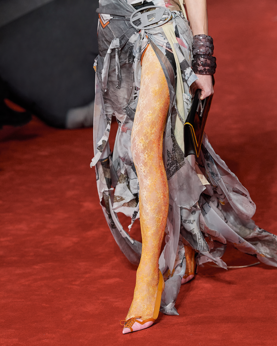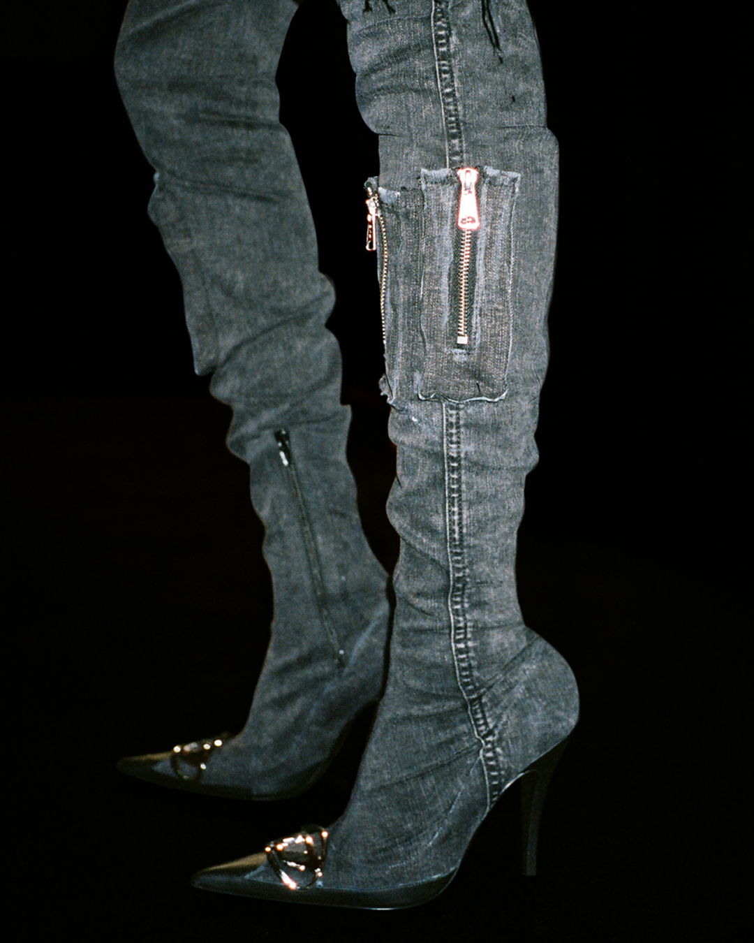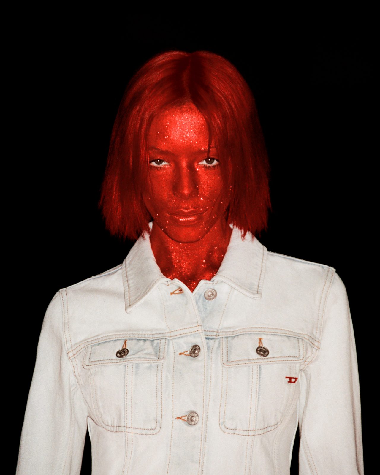「このテイストは私のルーツも大いに関係しています。地元のブルージュは素晴らしい建築物に囲まれているのですが、同時にとても工業的で、イタリアや南フランスの街とは明らかに違う。ですから、『予想外のものの中に美しさを探す』必要があるんです。コレクションのテーマ的なことでいえば、DIESEL の DNA はもともとポップカルチャーやユーティリティウェアに組み込まれているので、そのブランドの価値を称えることにフォーカスしました。それに、DIESEL は『デニムという言語』を持っているので、今回のコレクションはすべてデニムに関するものにしたくて。 私たちがデニムを使って何をするか、どう作るか、それをどう着こなすか。具体的には、ジーンズのウエスト部分やジャケットのネックラインなど普段は触れないような場所にディストーションを施したり、超大型のデニムベルトでミニスカートを作ったり、あるいは、セカンドスキンやカチューシャにジャカードでデニムのトロンプルイユ (だまし絵) を描いたり。つまり私がここで実践しているのは、デニムに対する既存のイメージをどう覆すか、ということなんです。」