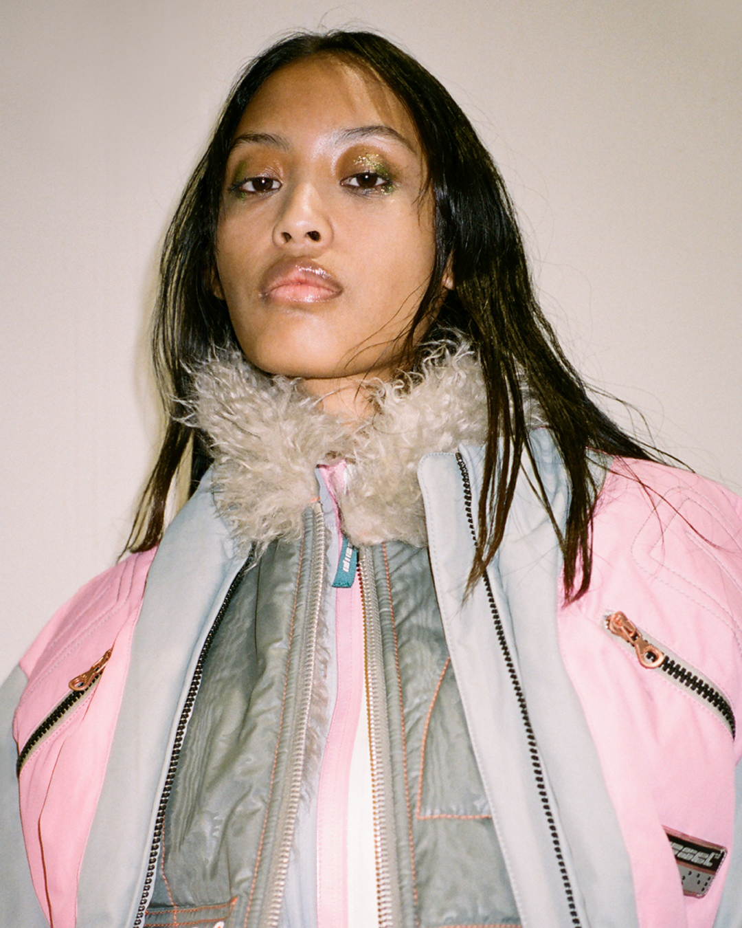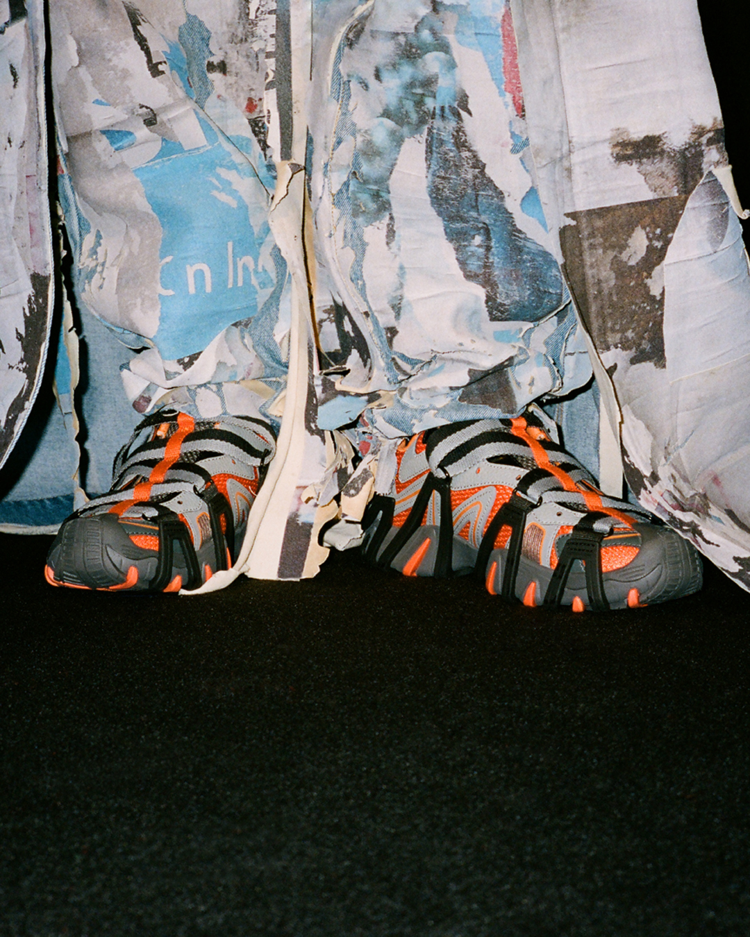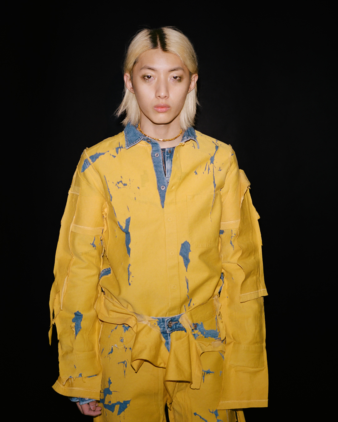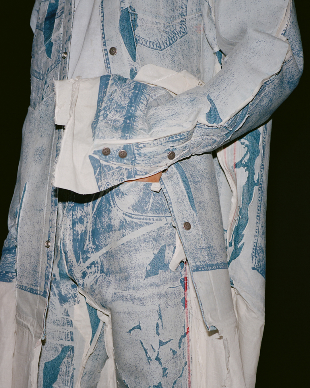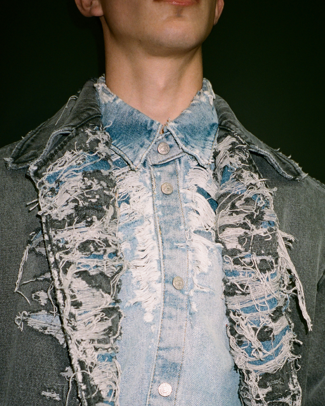 「私はものごとを概念化し、コンセプトを発展させ、推し進めることがとても好きなんです。2022年秋冬コレクションでは、テクスチャーや素材の面で実験的な試みを行いました。例えば、デニムをフィルムで加工することでアイテムに構造と深みのある色合いを与えたり、デッドストックのジャージーをデニムに接着し、そのあとレーザーカットでジャージーが剥がれたように見せる『ピールオフ』という新しい手法を編み出したりしています。」