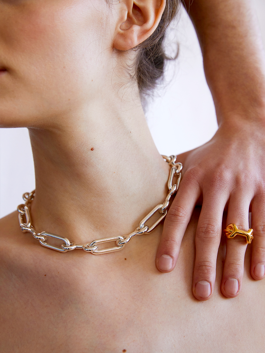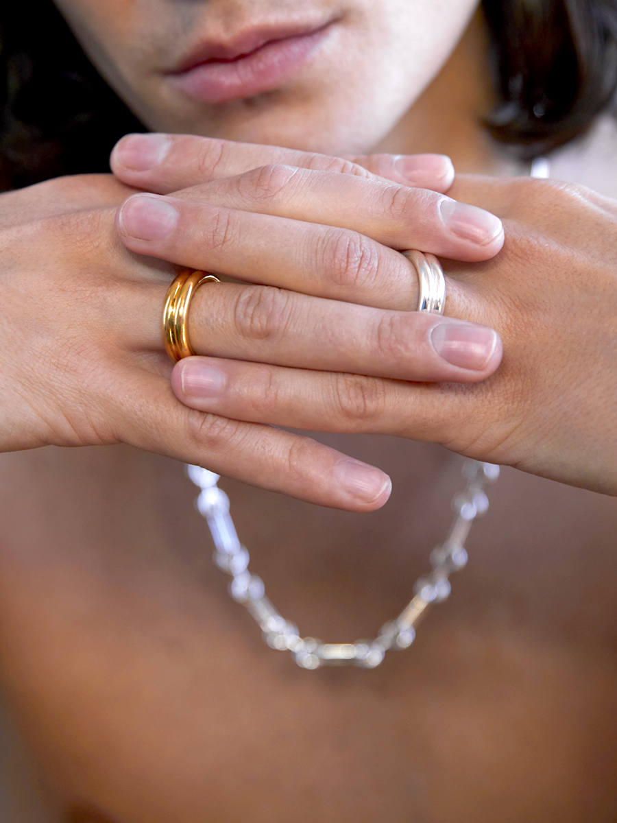 新しいコレクションで提案しているのは、ジェンダレスなチェーンのスタイル。さらに、ルーツに立ち返るようなステートメントジュエリーも展開しています。クラシックでありながら、美しいウェーブを描くブレスレットが特徴的です。クラシックでアイコニックな Charlotte Chesnais として、タイムレスなピースを提案し続けながら、新たな取り組みも続けています。