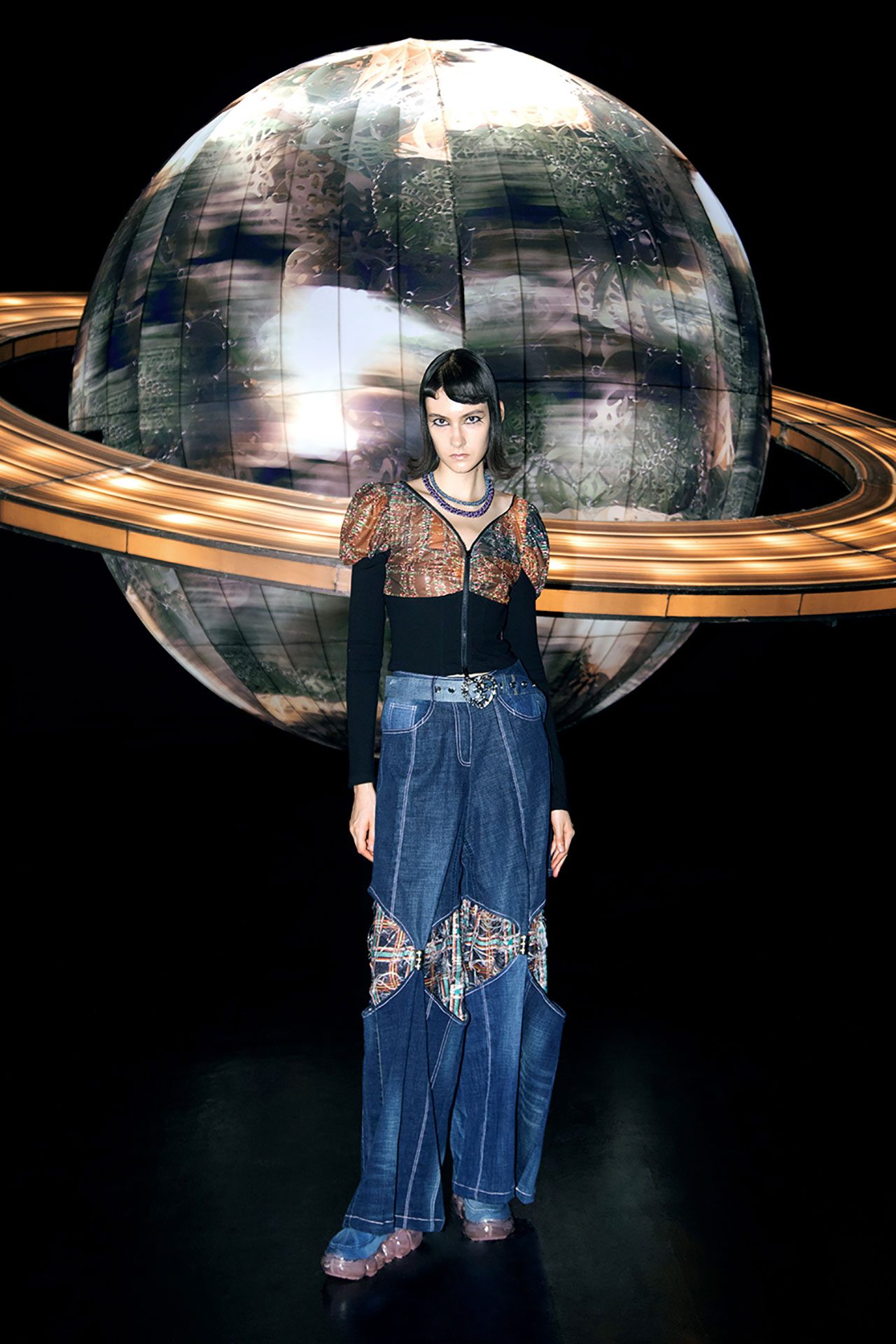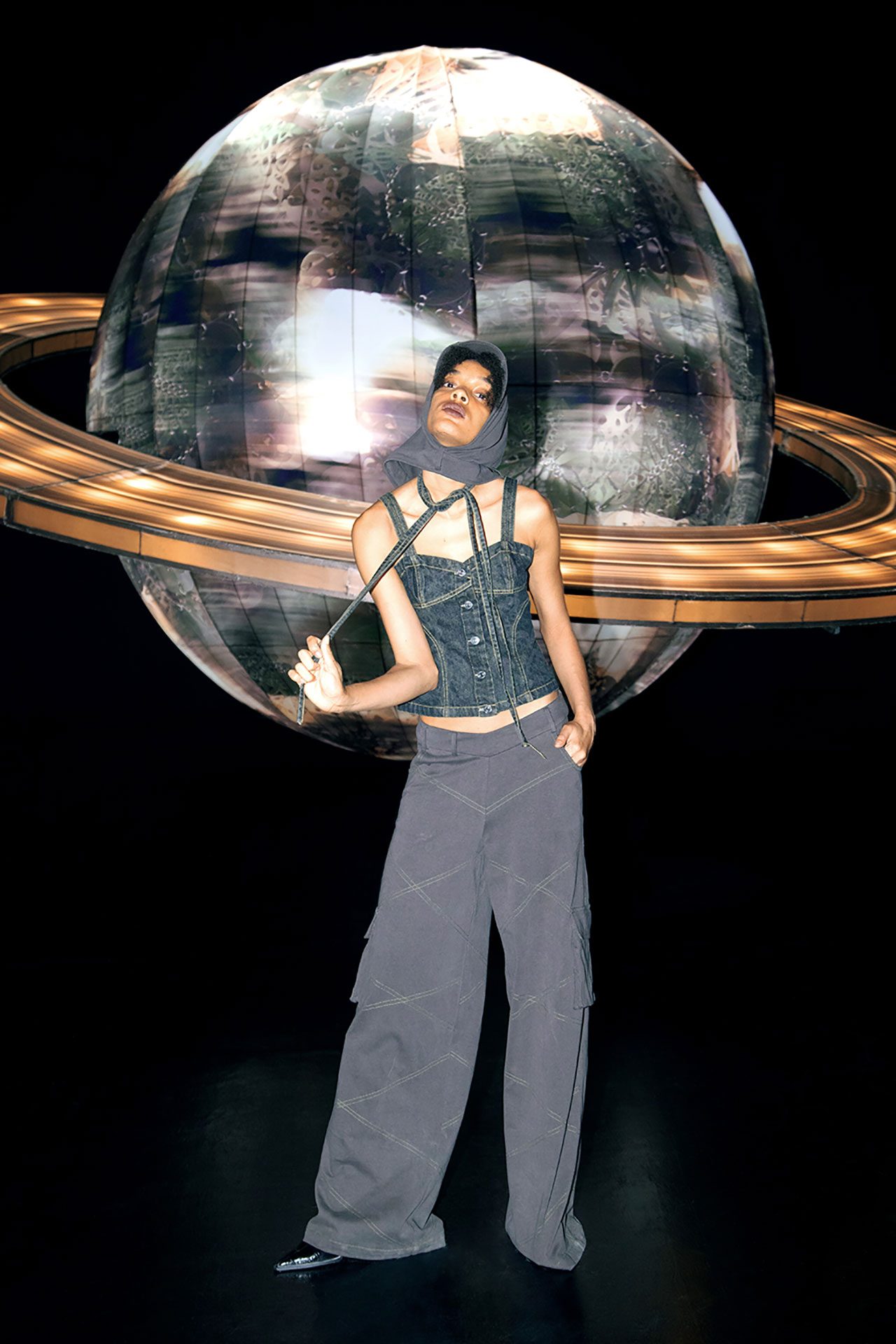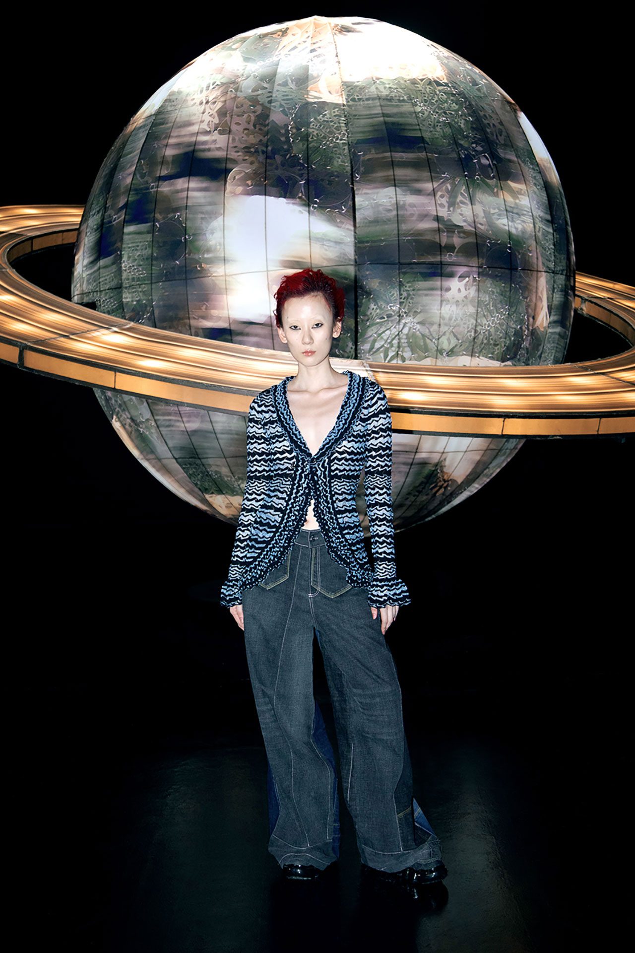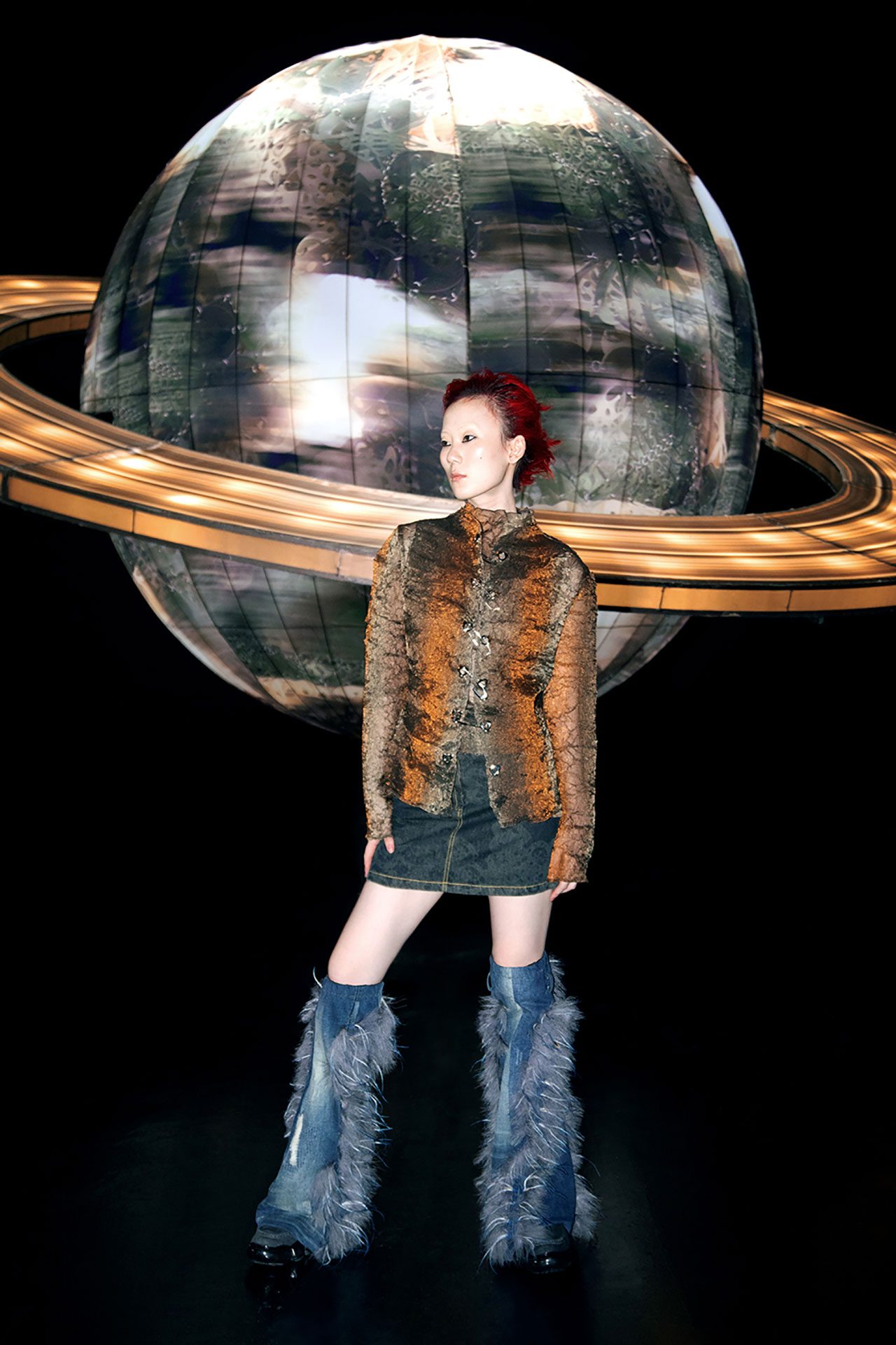 そう(笑)!このシーズンでは、自分自身の宇宙を創造してみたいと思ったから土星と未来がテーマなの。元々のアイデアは宇宙飛行士だったんだけど、トーマスとテーマについて話しているときに、テキサスには多くの引退した宇宙飛行士達が住んでいて彼らはウェスタンミュージックを聴きながらデニムを履いて暮らしているって知って。それでアップサイクルデニムを使うことにしたの。それから個人的な話としては、私の住む広州にはデニムの工場がたくさんあるんだけど、そこでほんのすこし欠陥があるだけのデニムが大量に捨てられているのを目にして、環境に優しくないと思って。工場にそういったデニムをもらえないか聞いたんだ。だから全てのデニムはアップサイクルデニム。今まで生産をアップサイクルの手法でやったことはなかったから難しいプロセスだったけれど、デニムを一つ一つ手に取って選んで、どうやってそれぞれの独特さを活かすことができるかを考えるのはすごく面白かった。一つ一つのデニムのパターンが、ユニークで美しいのがとても気に入ってる。