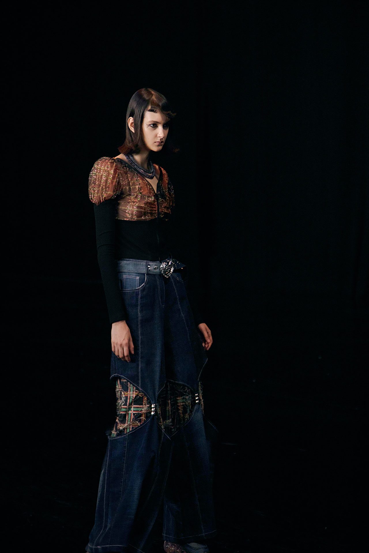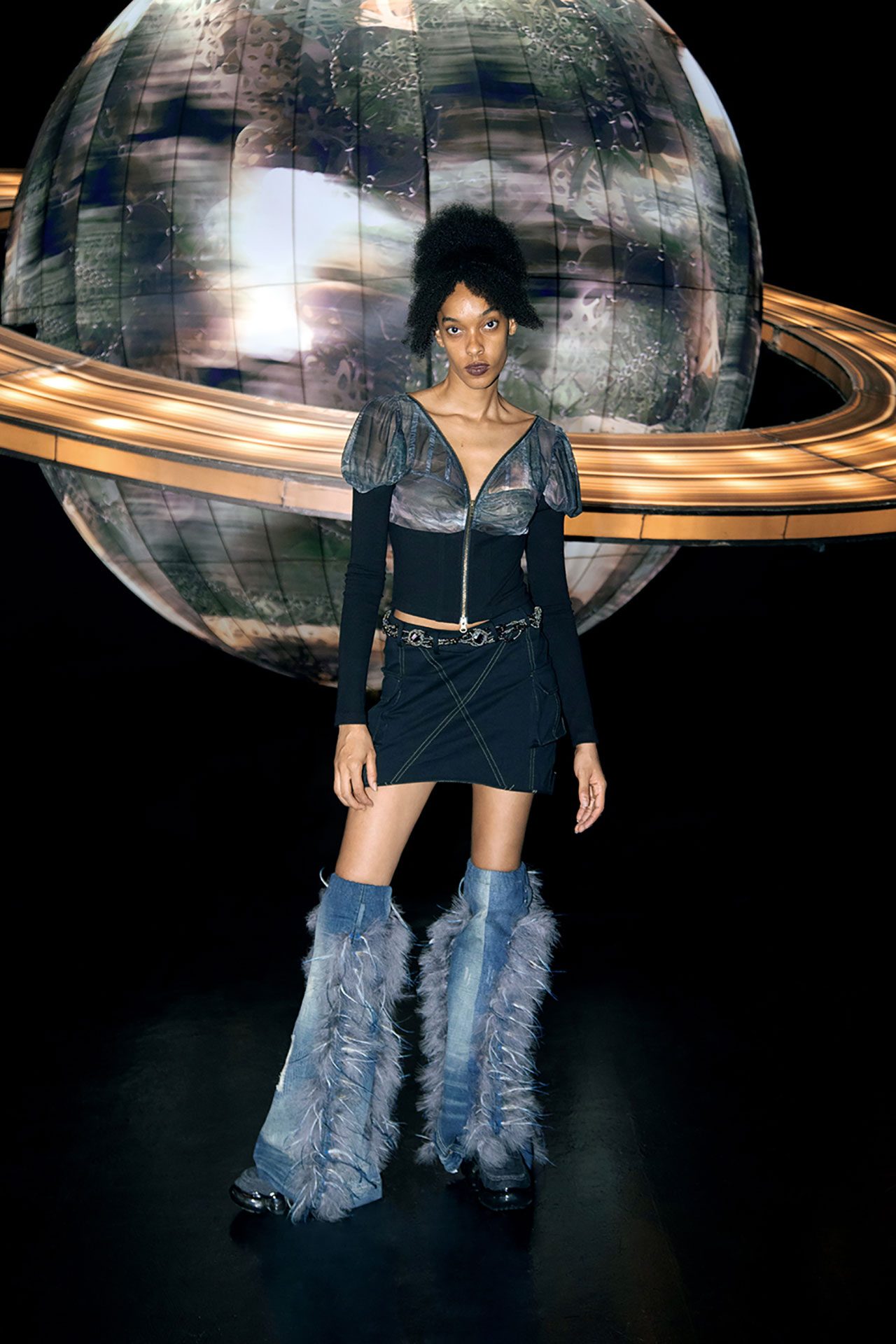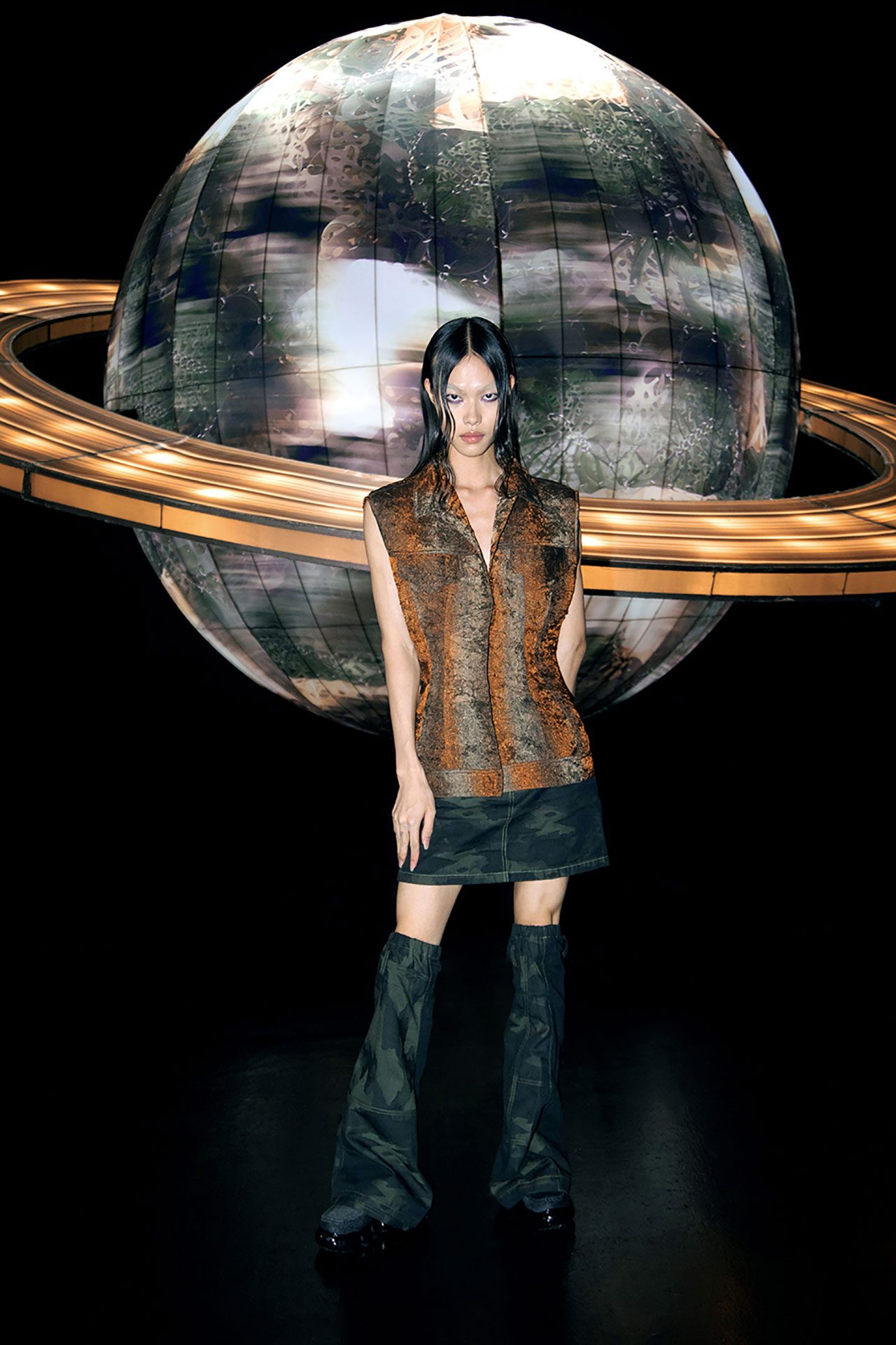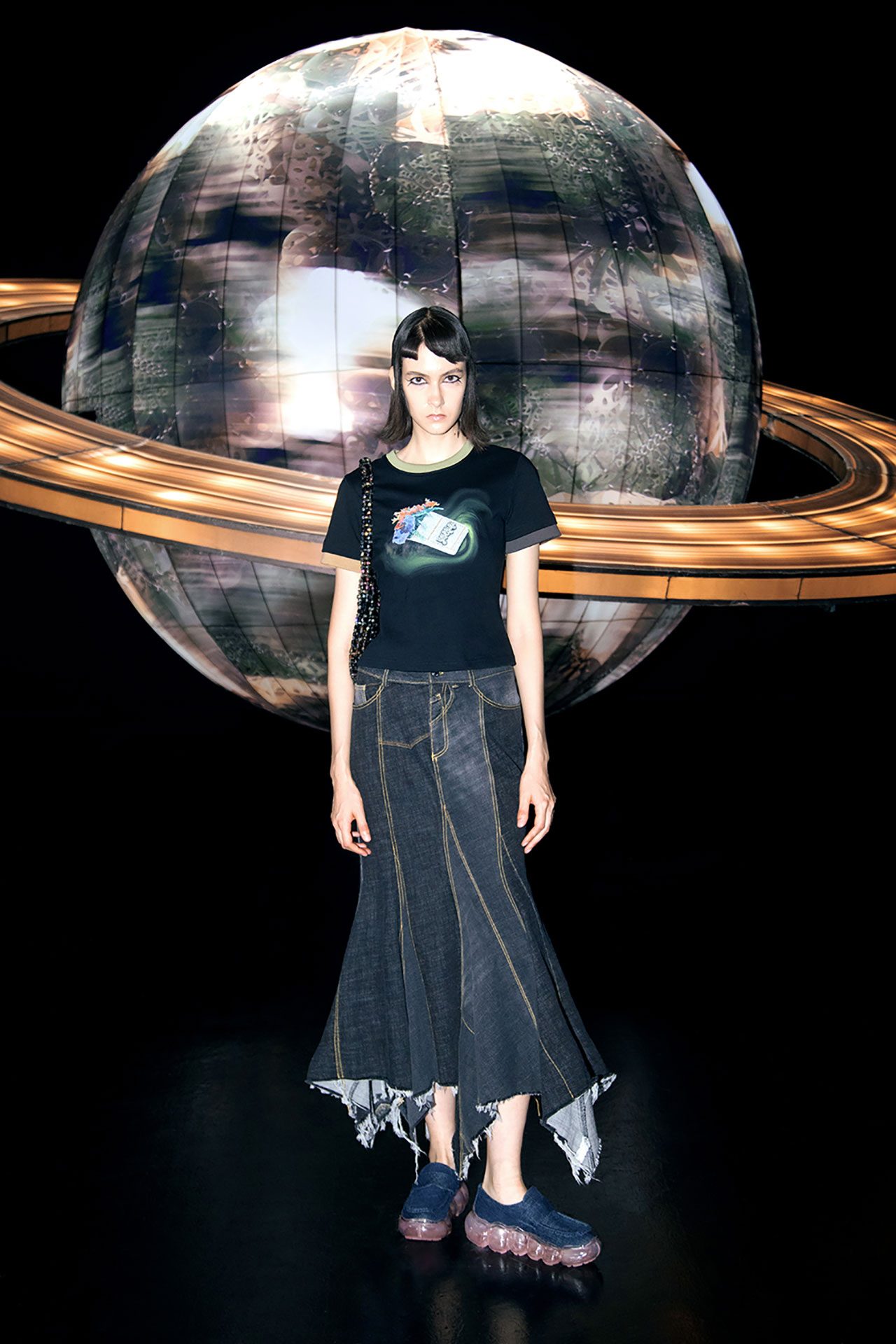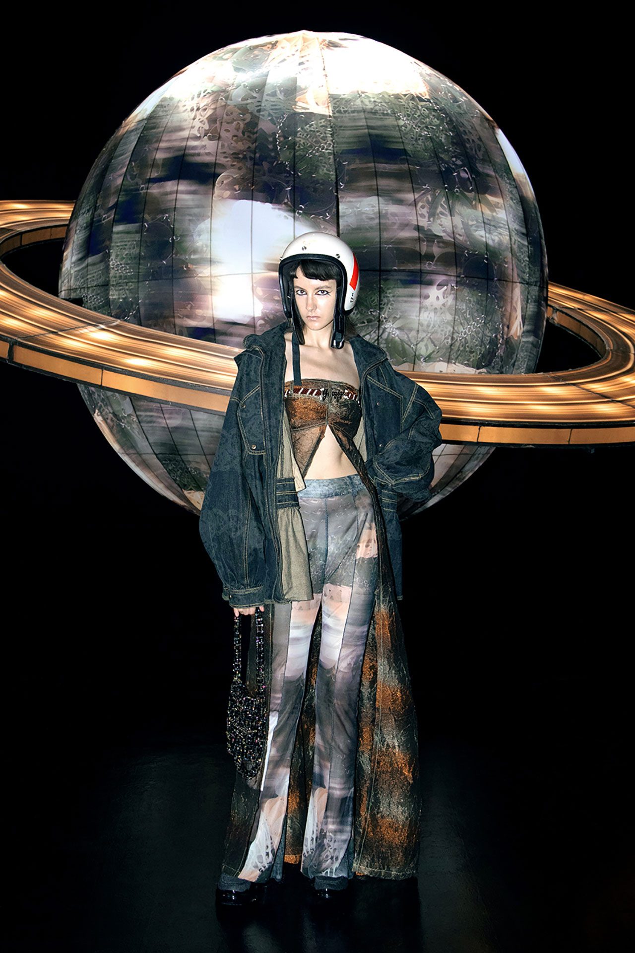 そう(笑)!このシーズンでは、自分自身の宇宙を創造してみたいと思ったから土星と未来がテーマなの。元々のアイデアは宇宙飛行士だったんだけど、トーマスとテーマについて話しているときに、テキサスには多くの引退した宇宙飛行士達が住んでいて彼らはウェスタンミュージックを聴きながらデニムを履いて暮らしているって知って。それでアップサイクルデニムを使うことにしたの。それから個人的な話としては、私の住む広州にはデニムの工場がたくさんあるんだけど、そこでほんのすこし欠陥があるだけのデニムが大量に捨てられているのを目にして、環境に優しくないと思って。工場にそういったデニムをもらえないか聞いたんだ。だから全てのデニムはアップサイクルデニム。今まで生産をアップサイクルの手法でやったことはなかったから難しいプロセスだったけれど、デニムを一つ一つ手に取って選んで、どうやってそれぞれの独特さを活かすことができるかを考えるのはすごく面白かった。一つ一つのデニムのパターンが、ユニークで美しいのがとても気に入ってる。