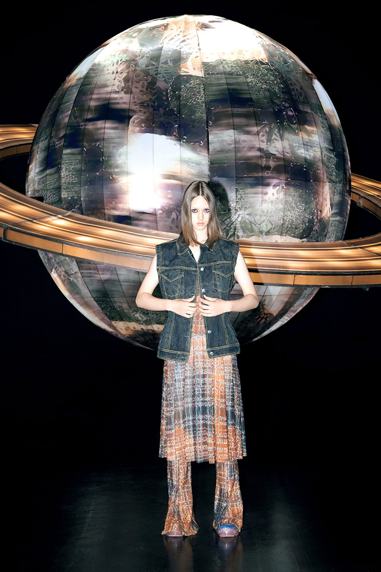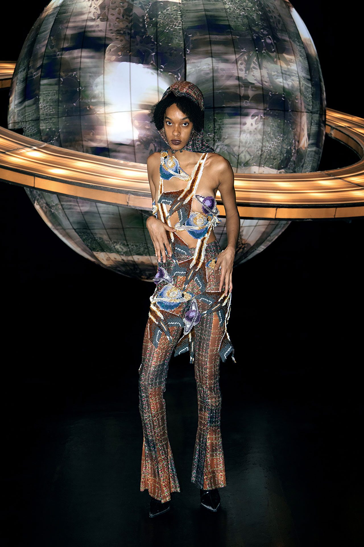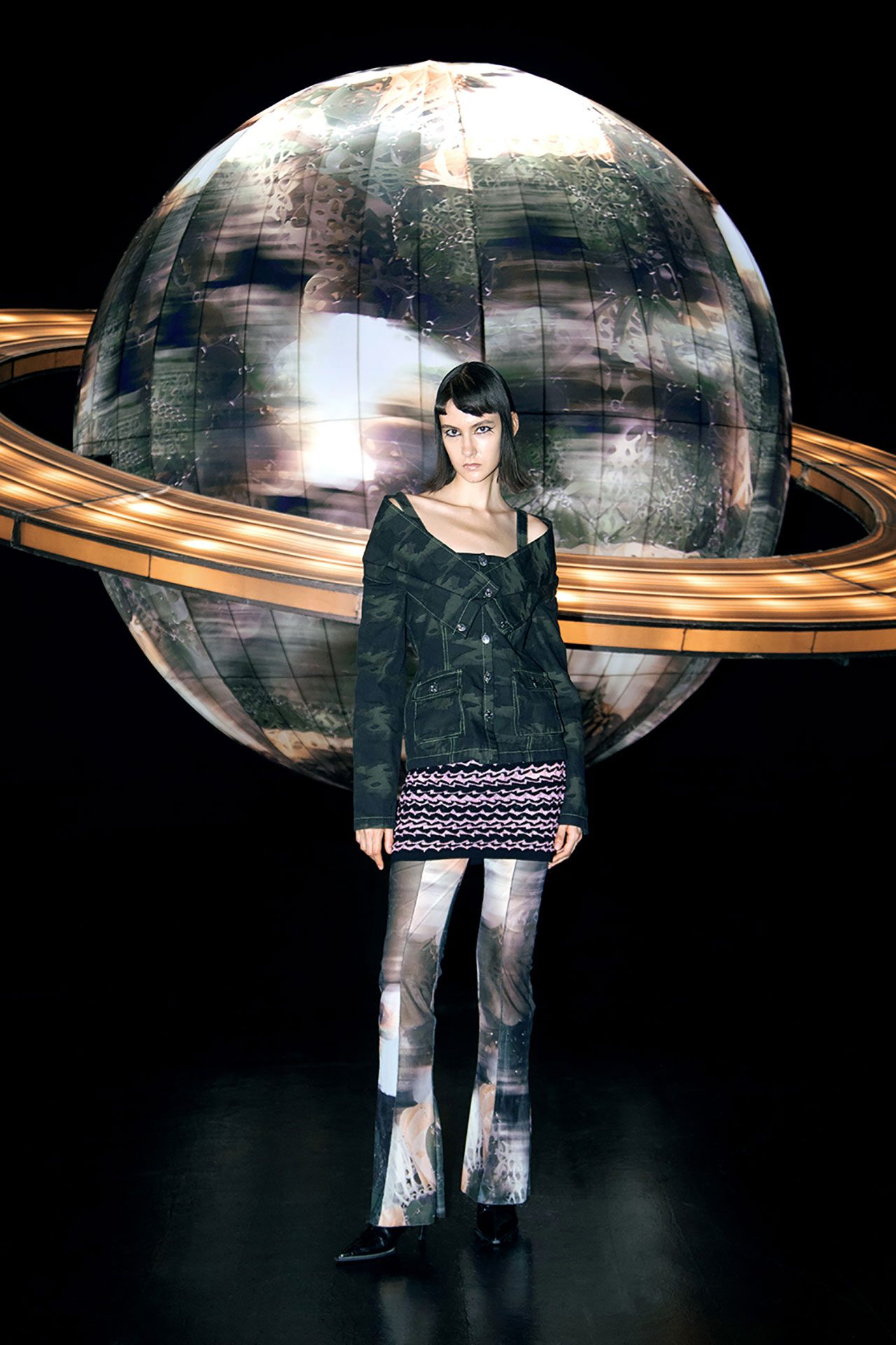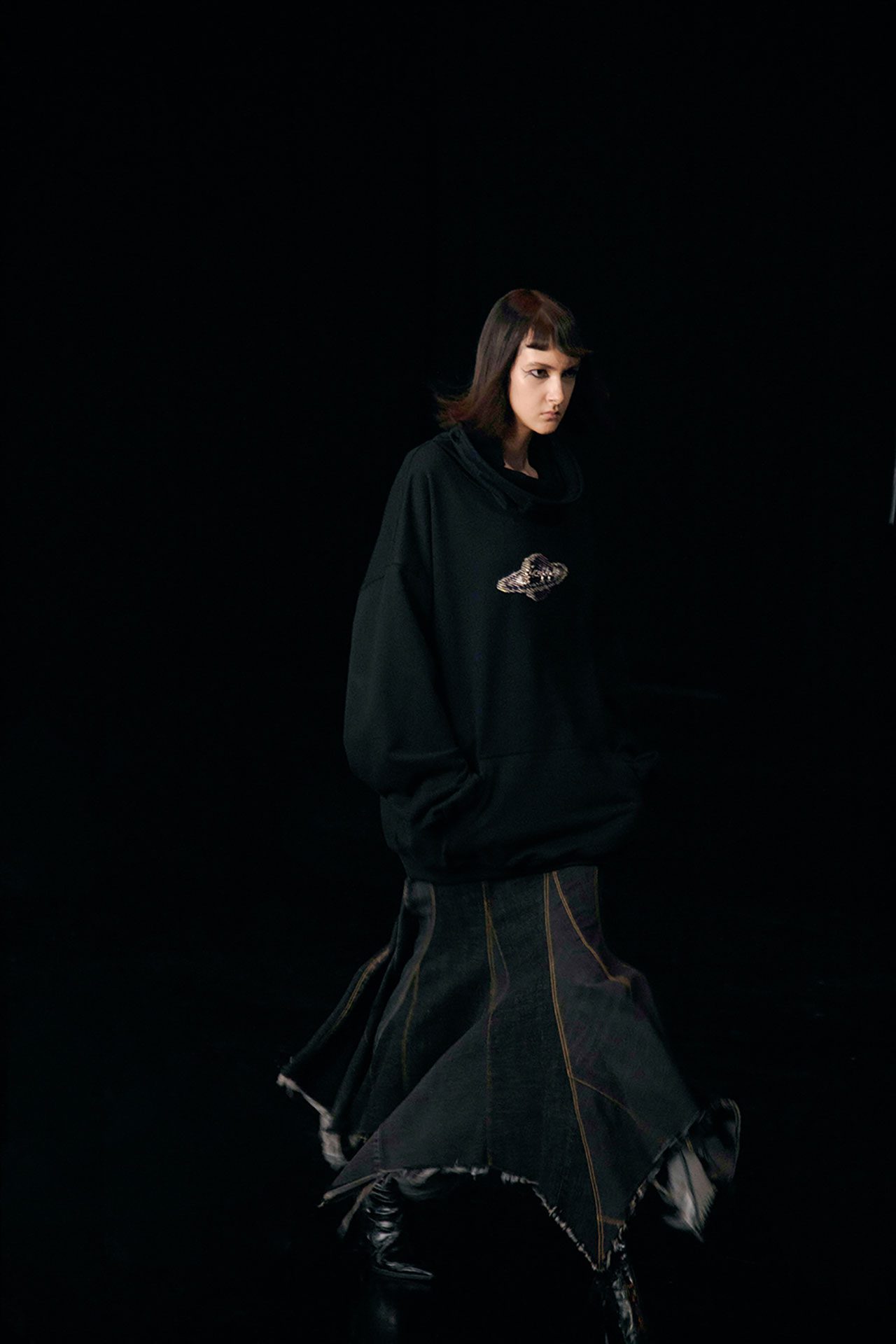 そう(笑)!このシーズンでは、自分自身の宇宙を創造してみたいと思ったから土星と未来がテーマなの。元々のアイデアは宇宙飛行士だったんだけど、トーマスとテーマについて話しているときに、テキサスには多くの引退した宇宙飛行士達が住んでいて彼らはウェスタンミュージックを聴きながらデニムを履いて暮らしているって知って。それでアップサイクルデニムを使うことにしたの。それから個人的な話としては、私の住む広州にはデニムの工場がたくさんあるんだけど、そこでほんのすこし欠陥があるだけのデニムが大量に捨てられているのを目にして、環境に優しくないと思って。工場にそういったデニムをもらえないか聞いたんだ。だから全てのデニムはアップサイクルデニム。今まで生産をアップサイクルの手法でやったことはなかったから難しいプロセスだったけれど、デニムを一つ一つ手に取って選んで、どうやってそれぞれの独特さを活かすことができるかを考えるのはすごく面白かった。一つ一つのデニムのパターンが、ユニークで美しいのがとても気に入ってる。