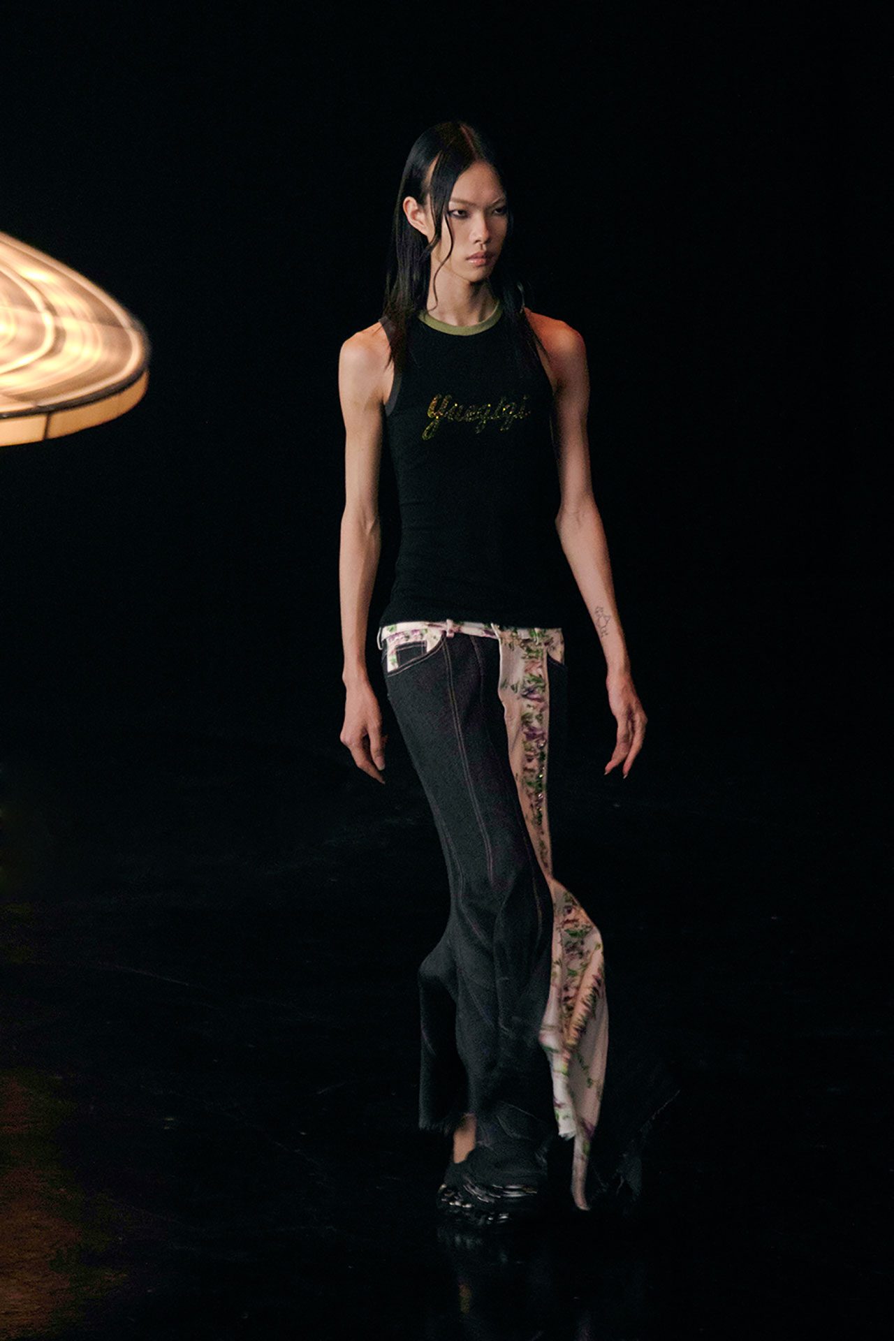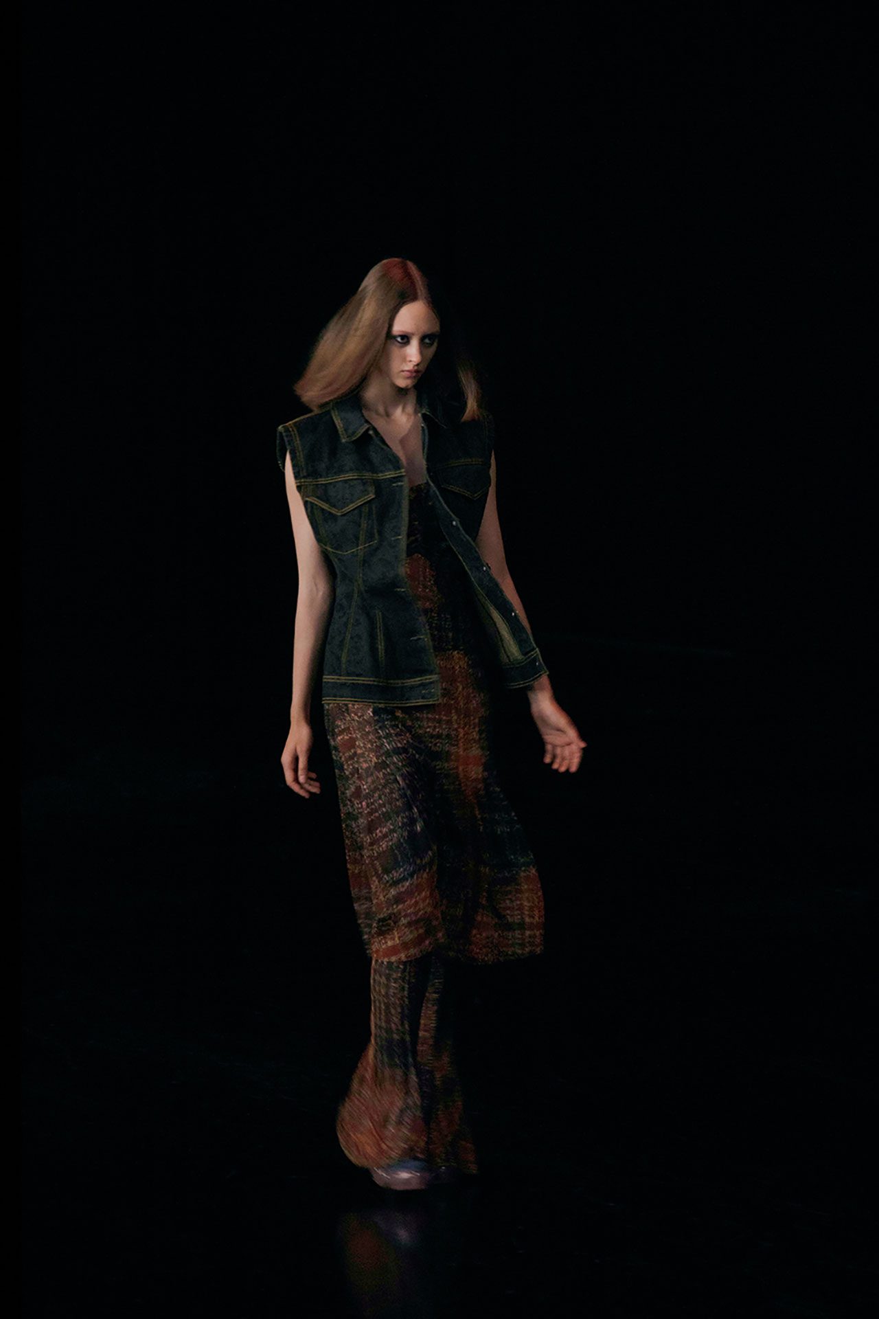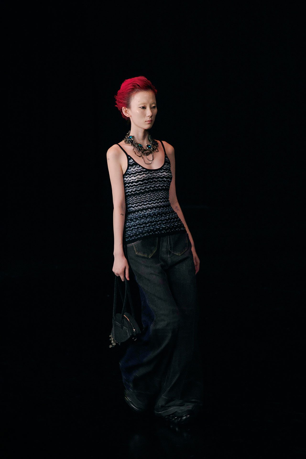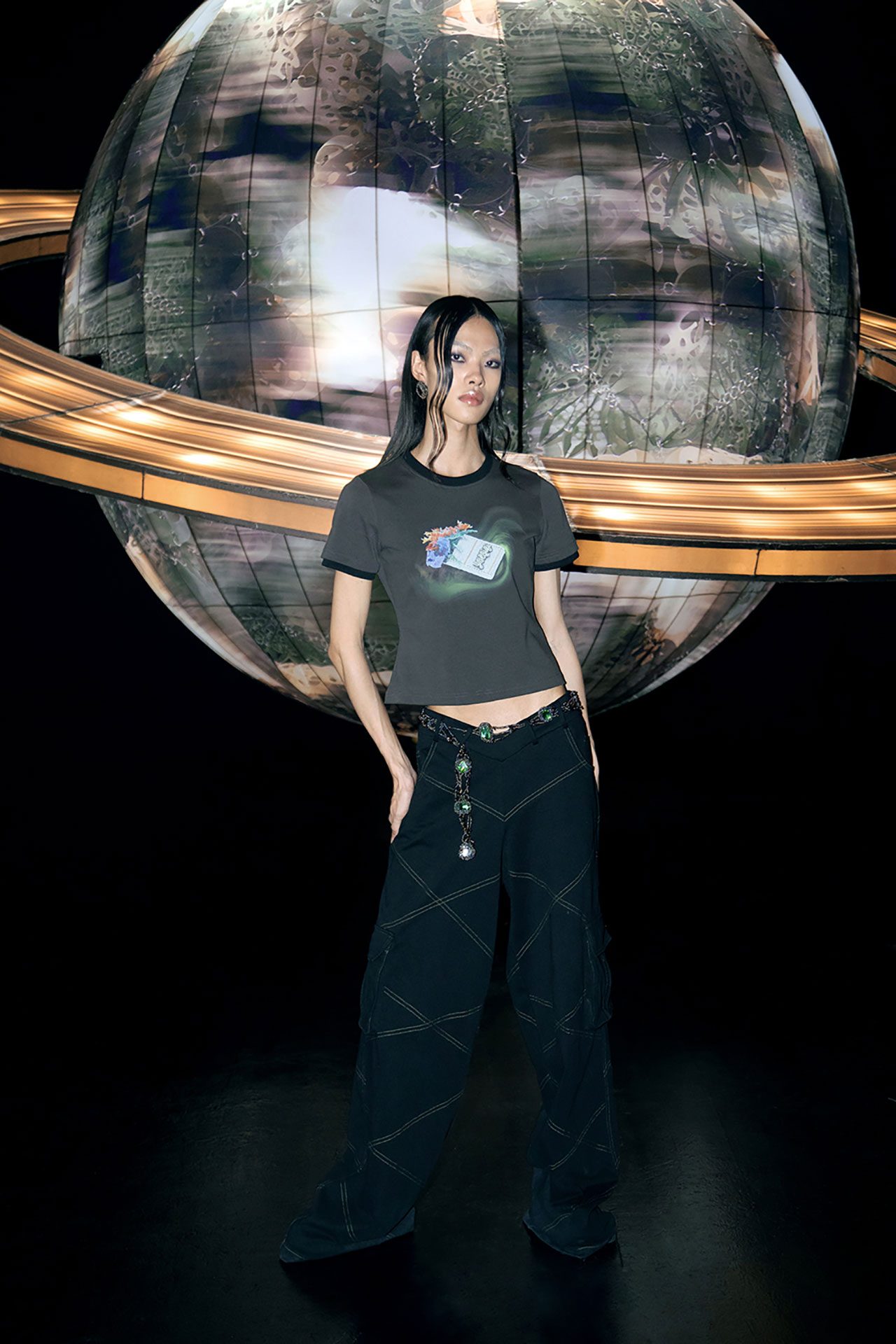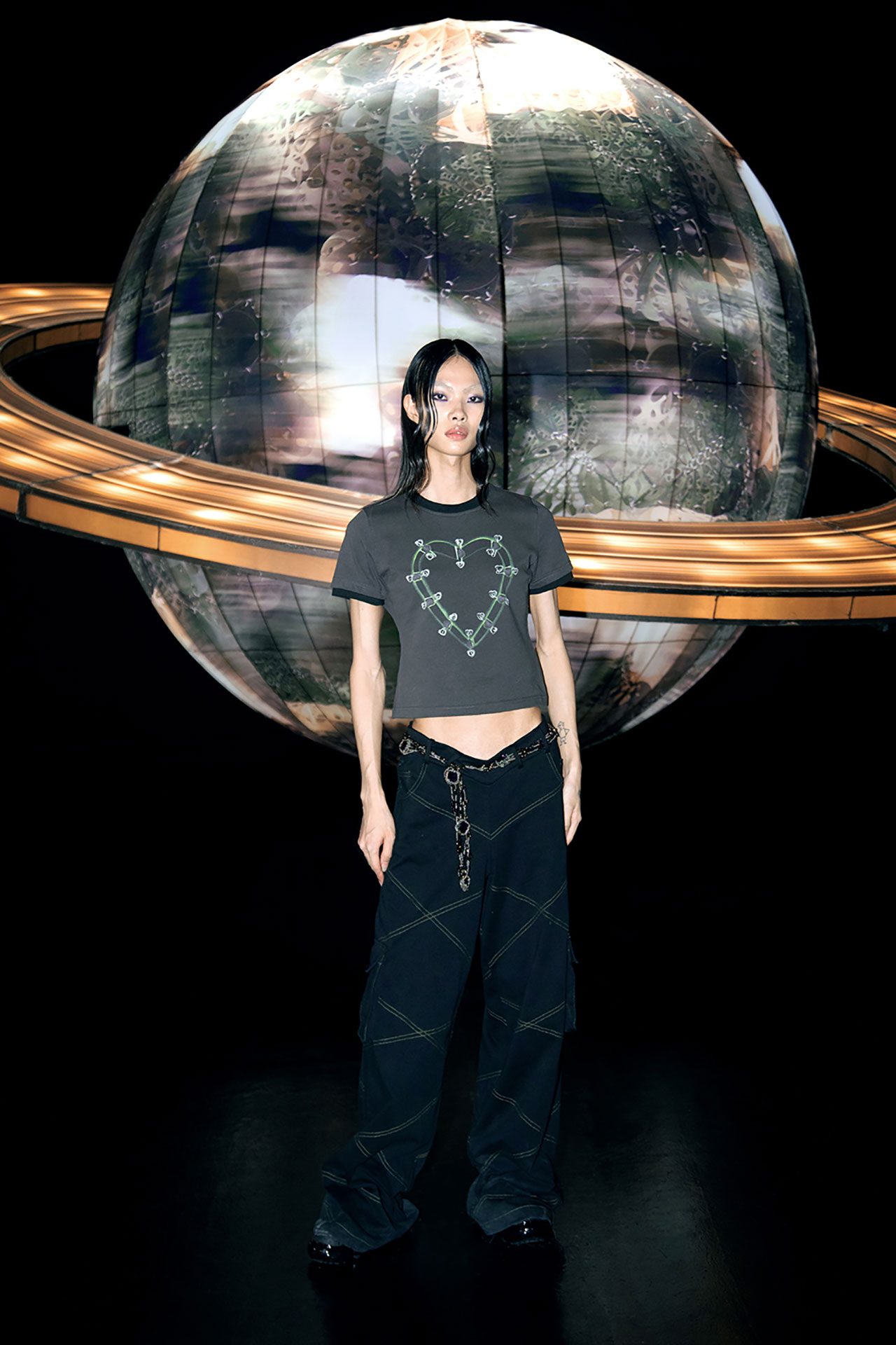 そう(笑)!このシーズンでは、自分自身の宇宙を創造してみたいと思ったから土星と未来がテーマなの。元々のアイデアは宇宙飛行士だったんだけど、トーマスとテーマについて話しているときに、テキサスには多くの引退した宇宙飛行士達が住んでいて彼らはウェスタンミュージックを聴きながらデニムを履いて暮らしているって知って。それでアップサイクルデニムを使うことにしたの。それから個人的な話としては、私の住む広州にはデニムの工場がたくさんあるんだけど、そこでほんのすこし欠陥があるだけのデニムが大量に捨てられているのを目にして、環境に優しくないと思って。工場にそういったデニムをもらえないか聞いたんだ。だから全てのデニムはアップサイクルデニム。今まで生産をアップサイクルの手法でやったことはなかったから難しいプロセスだったけれど、デニムを一つ一つ手に取って選んで、どうやってそれぞれの独特さを活かすことができるかを考えるのはすごく面白かった。一つ一つのデニムのパターンが、ユニークで美しいのがとても気に入ってる。
