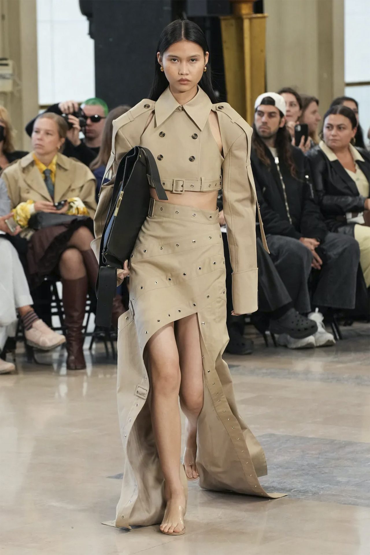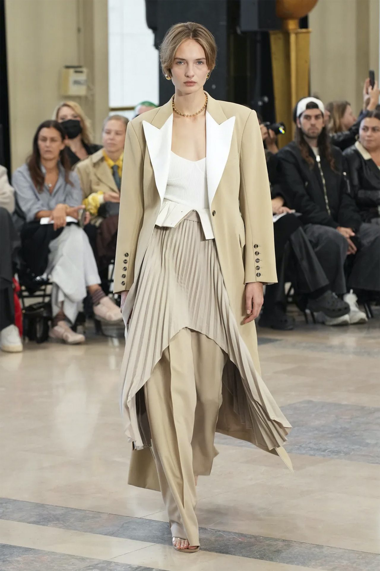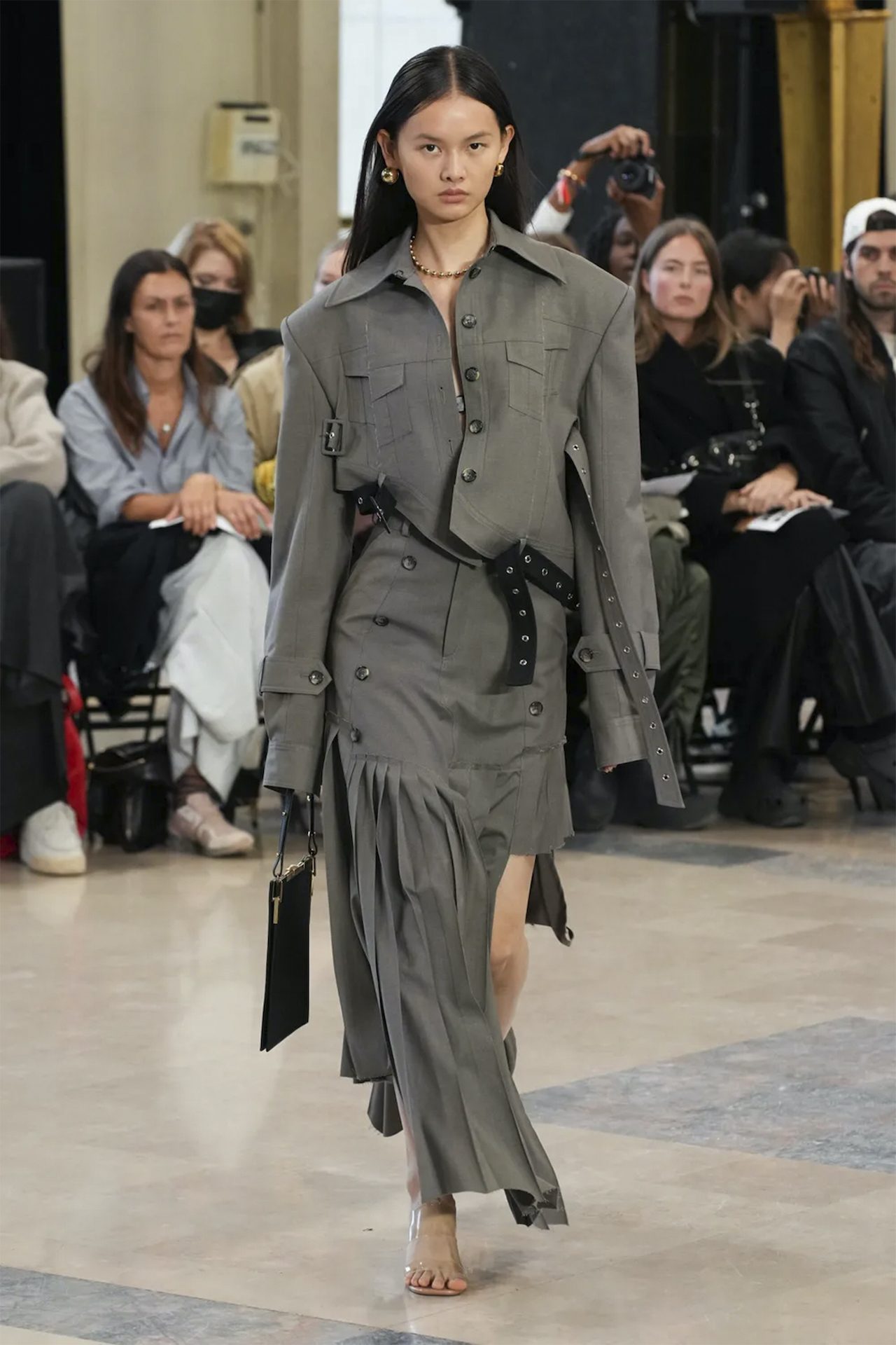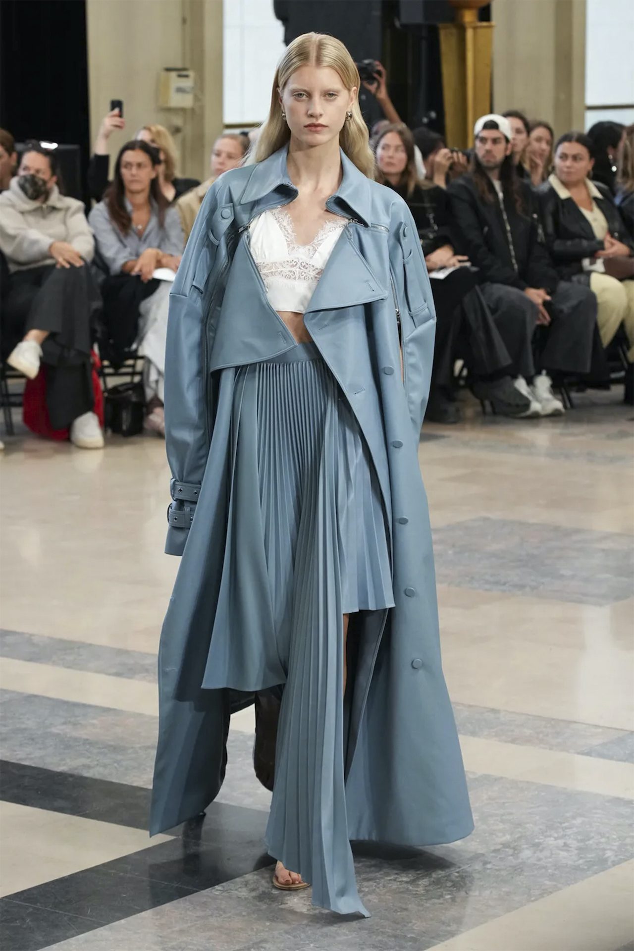 毎シーズン新しい試みを行っているのですが、特に今シーズンは実用性のある要素を女性的なフォルムへ変容させる努力をしました。注目してもらいたいのはプリーツ要素を融合したトレンチコートです。一つのアイテムに大きさや形の異なるプリーツを加えました。例えば、左側には細いプリーツを施し、真ん中には少しフラットで丸みのあるものを施すなど、同じ服に4~5種類ほどのプリーツを加えました。ディテールに注目するとトレンチ素材を使った様々なテクニックが用いられています。一目見ただけではわかりづらいですが、細かいところまで着目してもらうとその技術に気づいてもらえると思います。