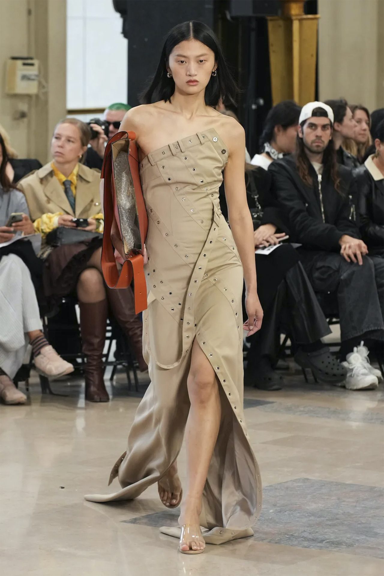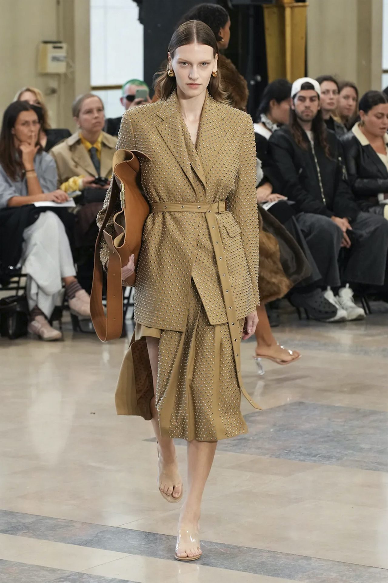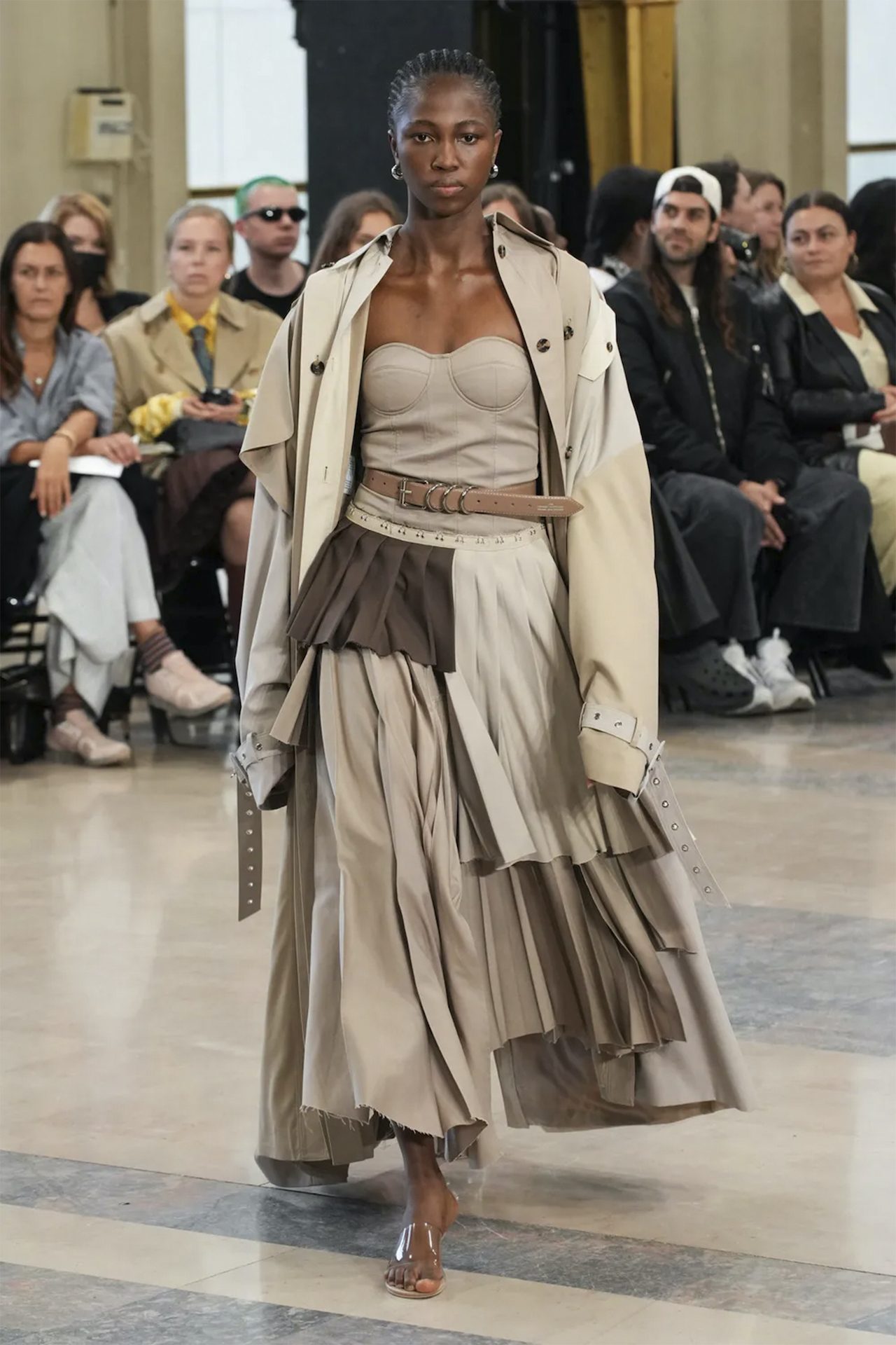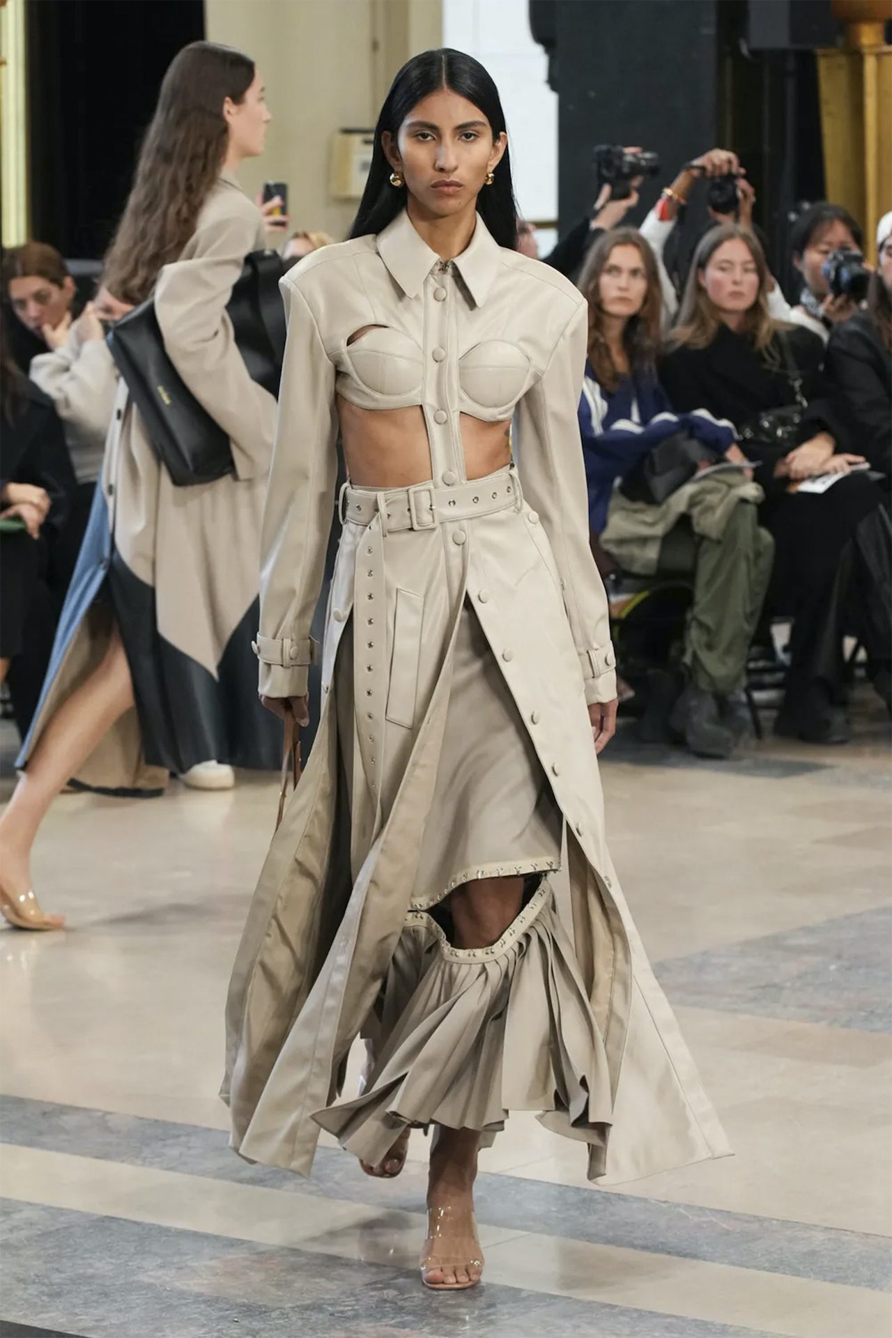 毎シーズン新しい試みを行っているのですが、特に今シーズンは実用性のある要素を女性的なフォルムへ変容させる努力をしました。注目してもらいたいのはプリーツ要素を融合したトレンチコートです。一つのアイテムに大きさや形の異なるプリーツを加えました。例えば、左側には細いプリーツを施し、真ん中には少しフラットで丸みのあるものを施すなど、同じ服に4~5種類ほどのプリーツを加えました。ディテールに注目するとトレンチ素材を使った様々なテクニックが用いられています。一目見ただけではわかりづらいですが、細かいところまで着目してもらうとその技術に気づいてもらえると思います。