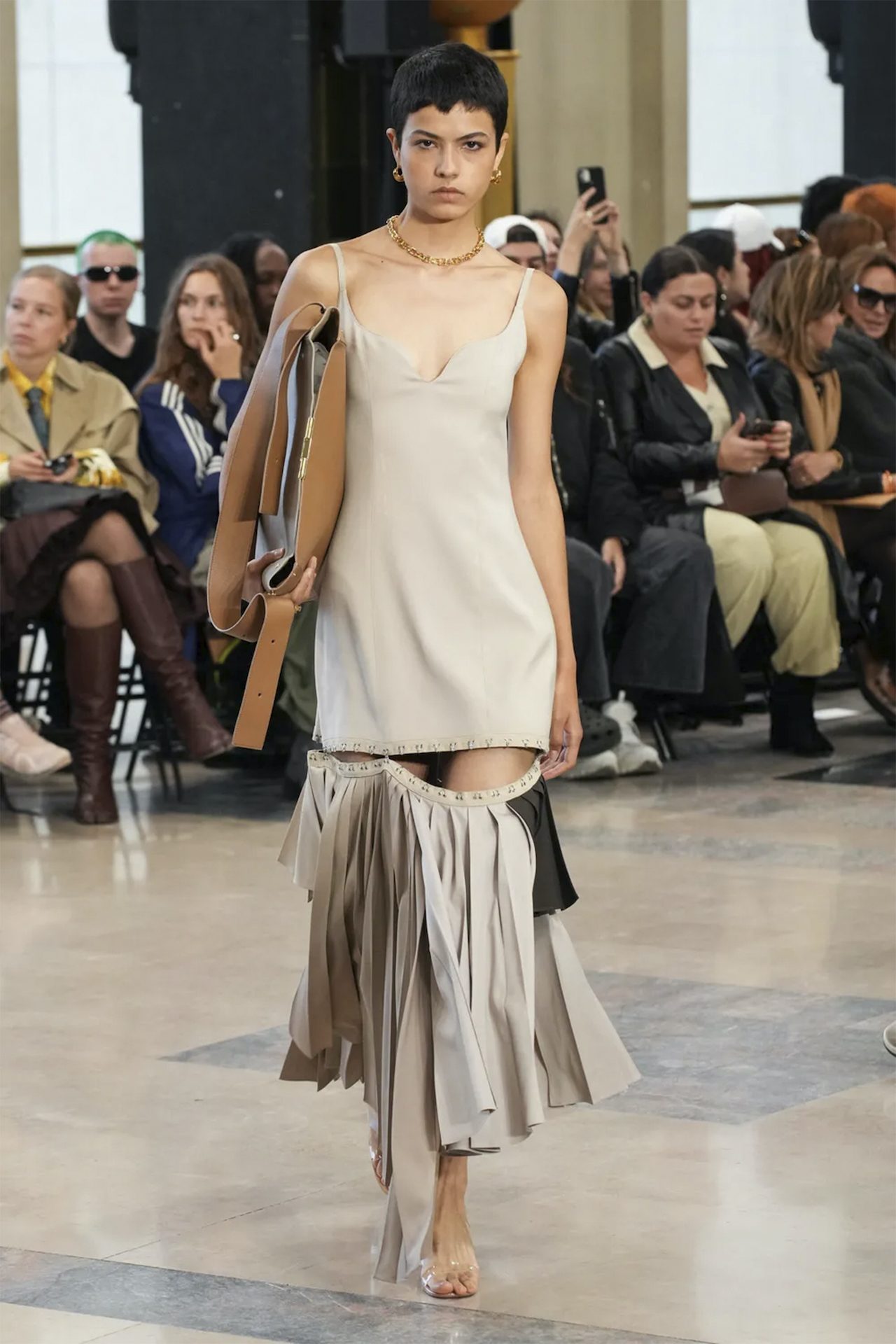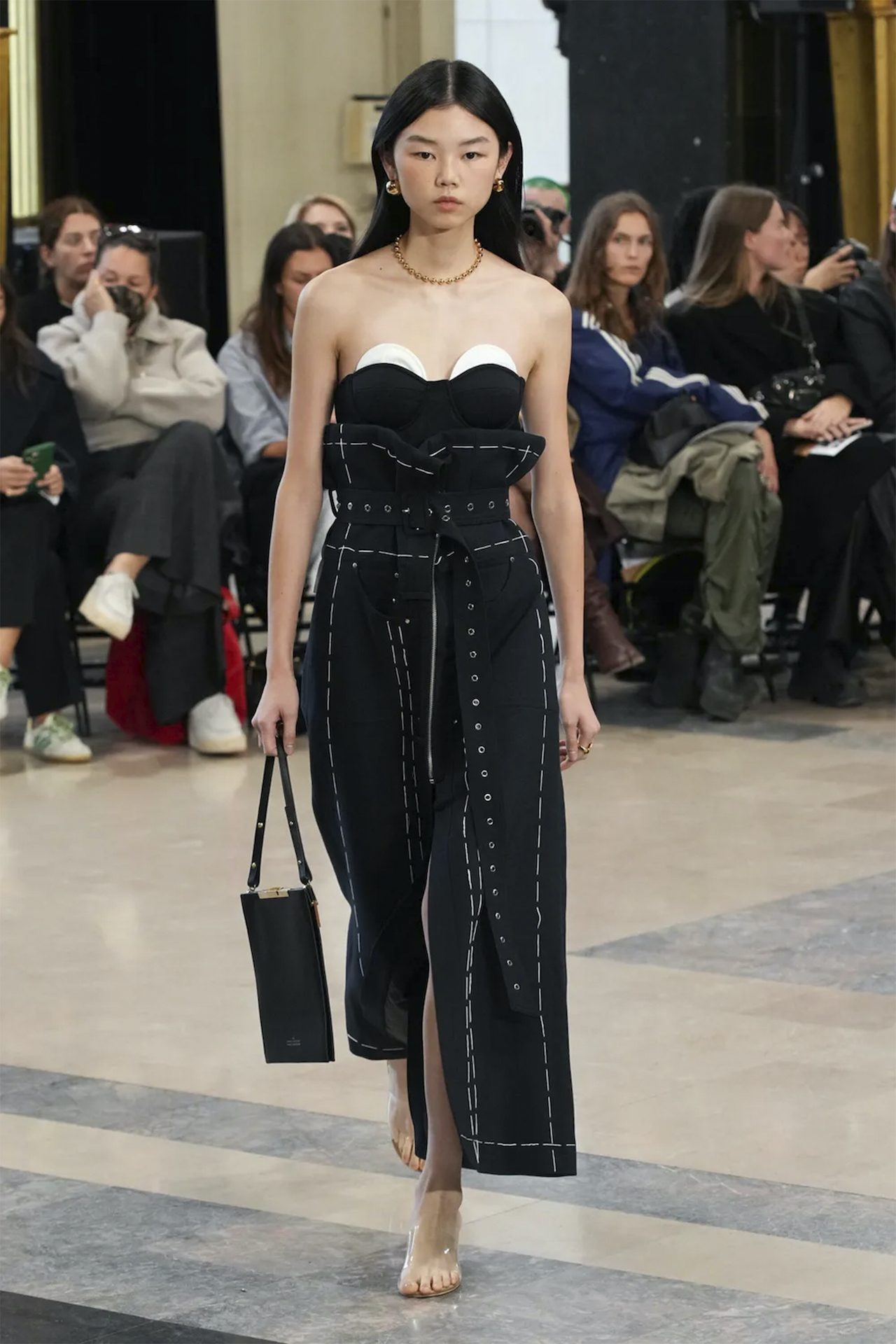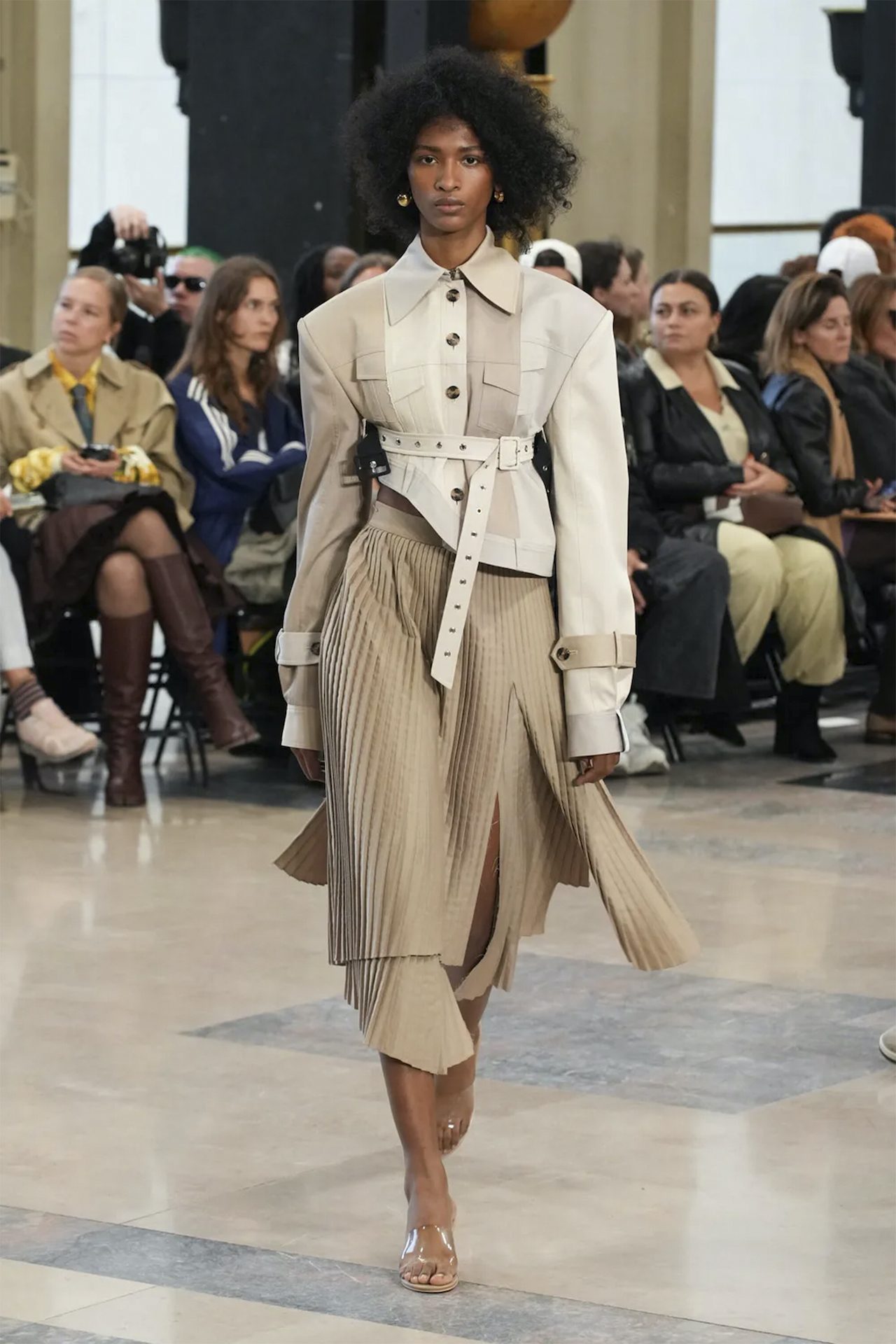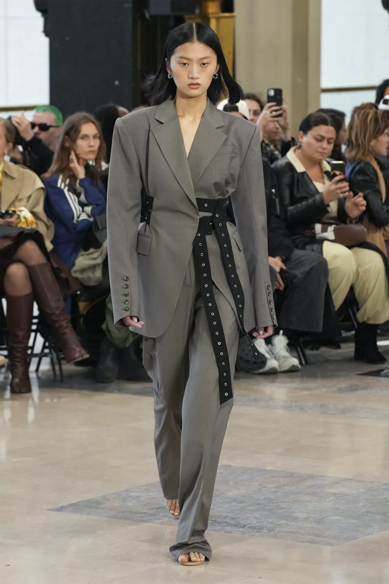 毎シーズン新しい試みを行っているのですが、特に今シーズンは実用性のある要素を女性的なフォルムへ変容させる努力をしました。注目してもらいたいのはプリーツ要素を融合したトレンチコートです。一つのアイテムに大きさや形の異なるプリーツを加えました。例えば、左側には細いプリーツを施し、真ん中には少しフラットで丸みのあるものを施すなど、同じ服に4~5種類ほどのプリーツを加えました。ディテールに注目するとトレンチ素材を使った様々なテクニックが用いられています。一目見ただけではわかりづらいですが、細かいところまで着目してもらうとその技術に気づいてもらえると思います。