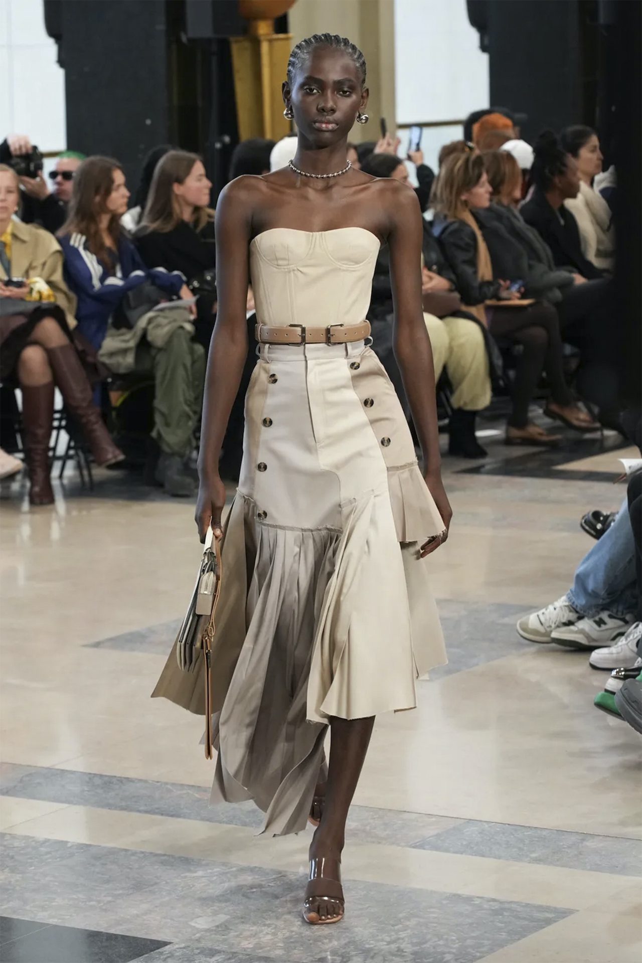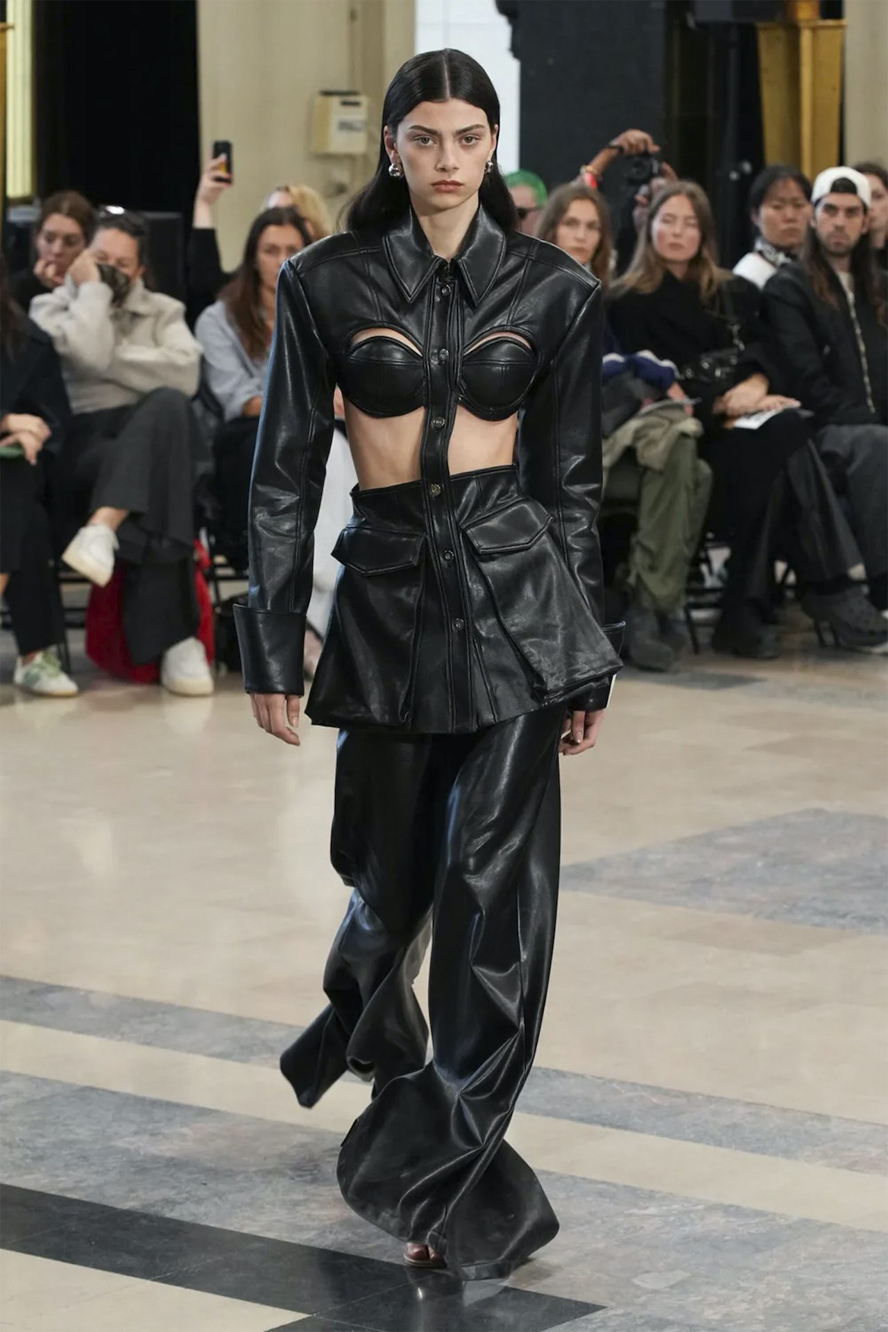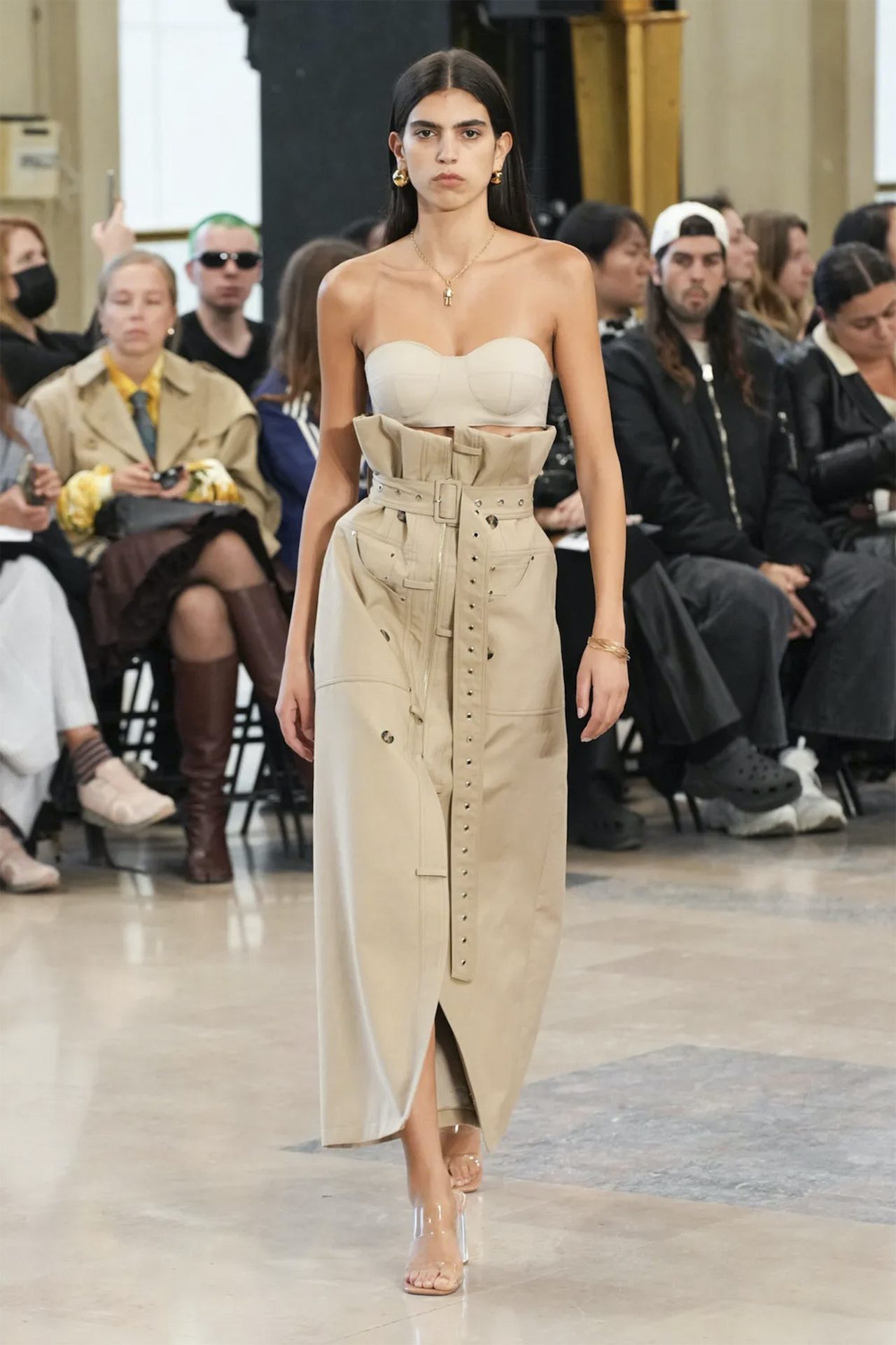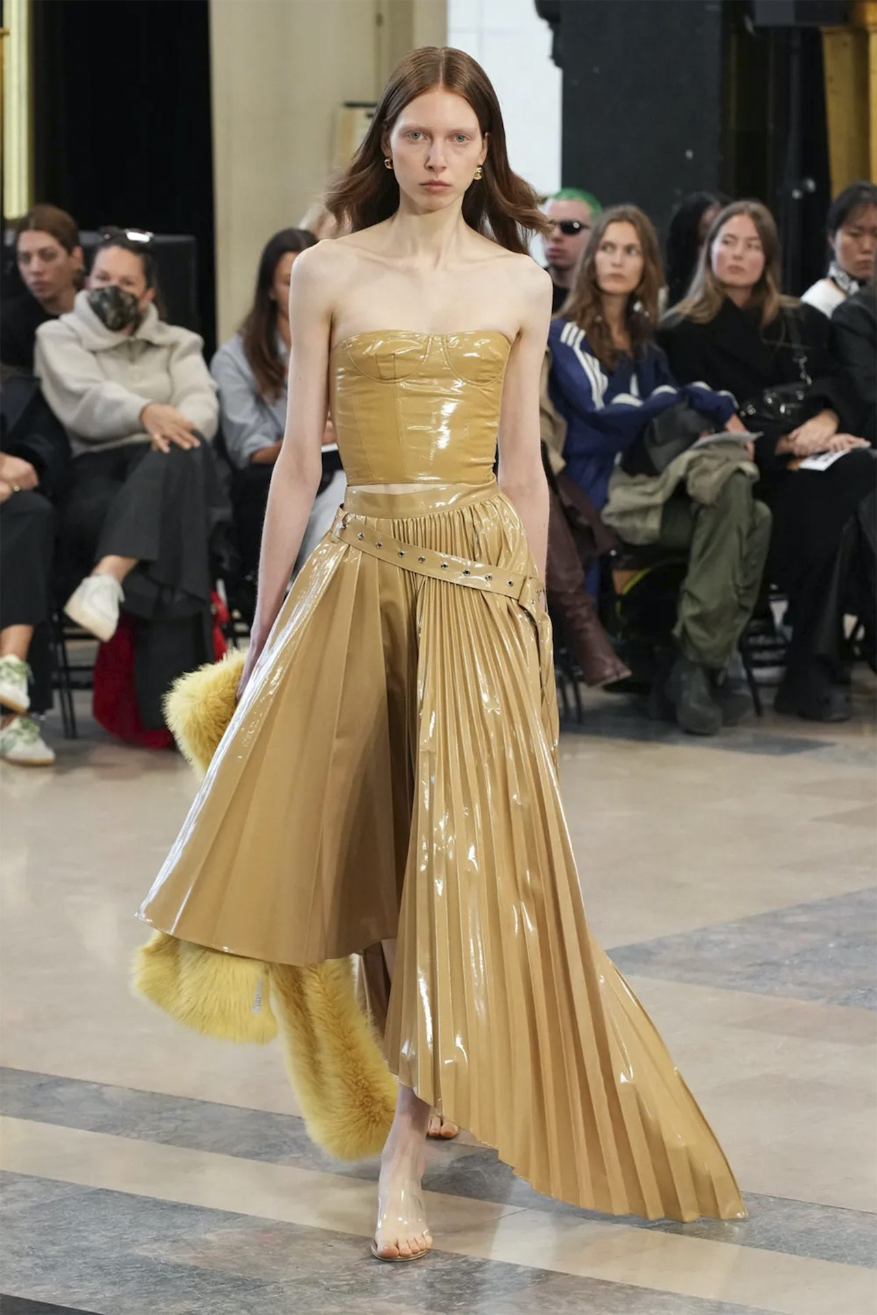毎シーズン新しい試みを行っているのですが、特に今シーズンは実用性のある要素を女性的なフォルムへ変容させる努力をしました。注目してもらいたいのはプリーツ要素を融合したトレンチコートです。一つのアイテムに大きさや形の異なるプリーツを加えました。例えば、左側には細いプリーツを施し、真ん中には少しフラットで丸みのあるものを施すなど、同じ服に4~5種類ほどのプリーツを加えました。ディテールに注目するとトレンチ素材を使った様々なテクニックが用いられています。一目見ただけではわかりづらいですが、細かいところまで着目してもらうとその技術に気づいてもらえると思います。