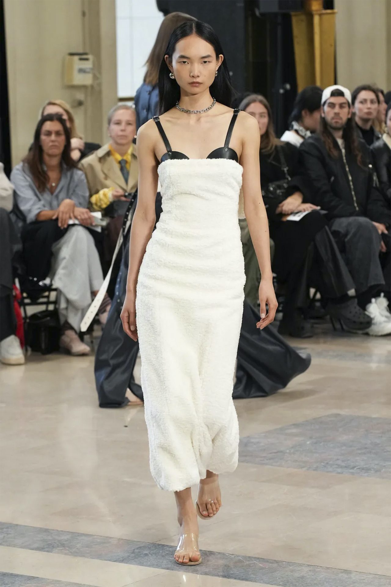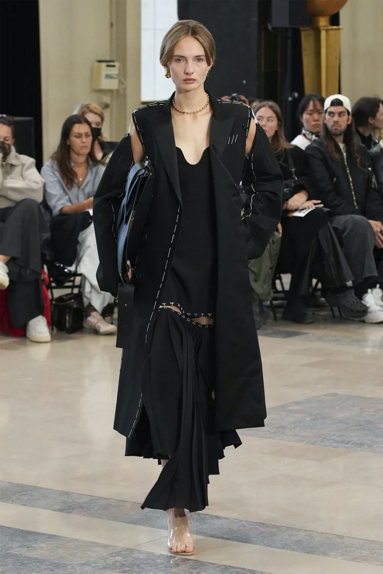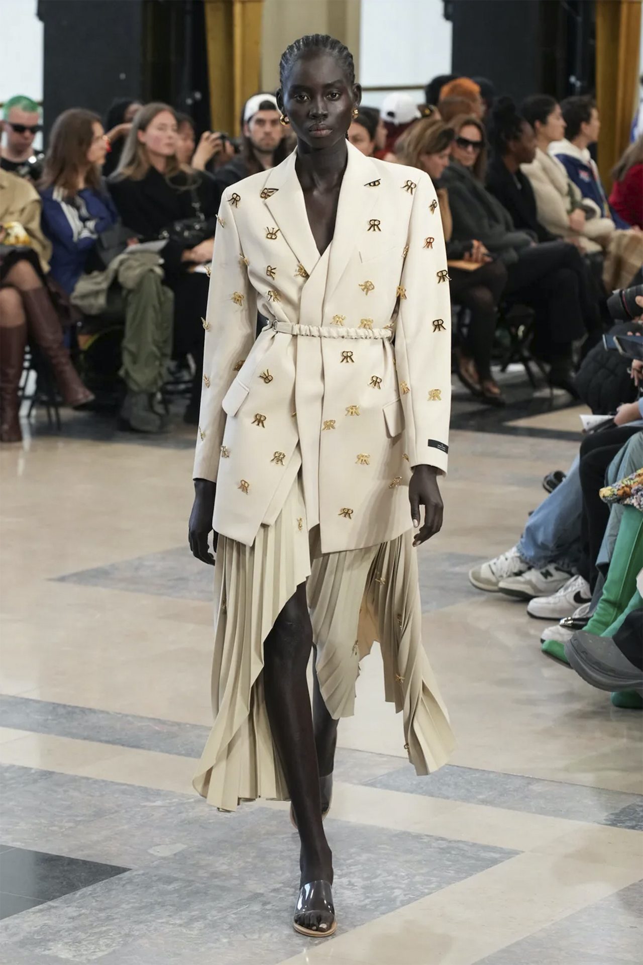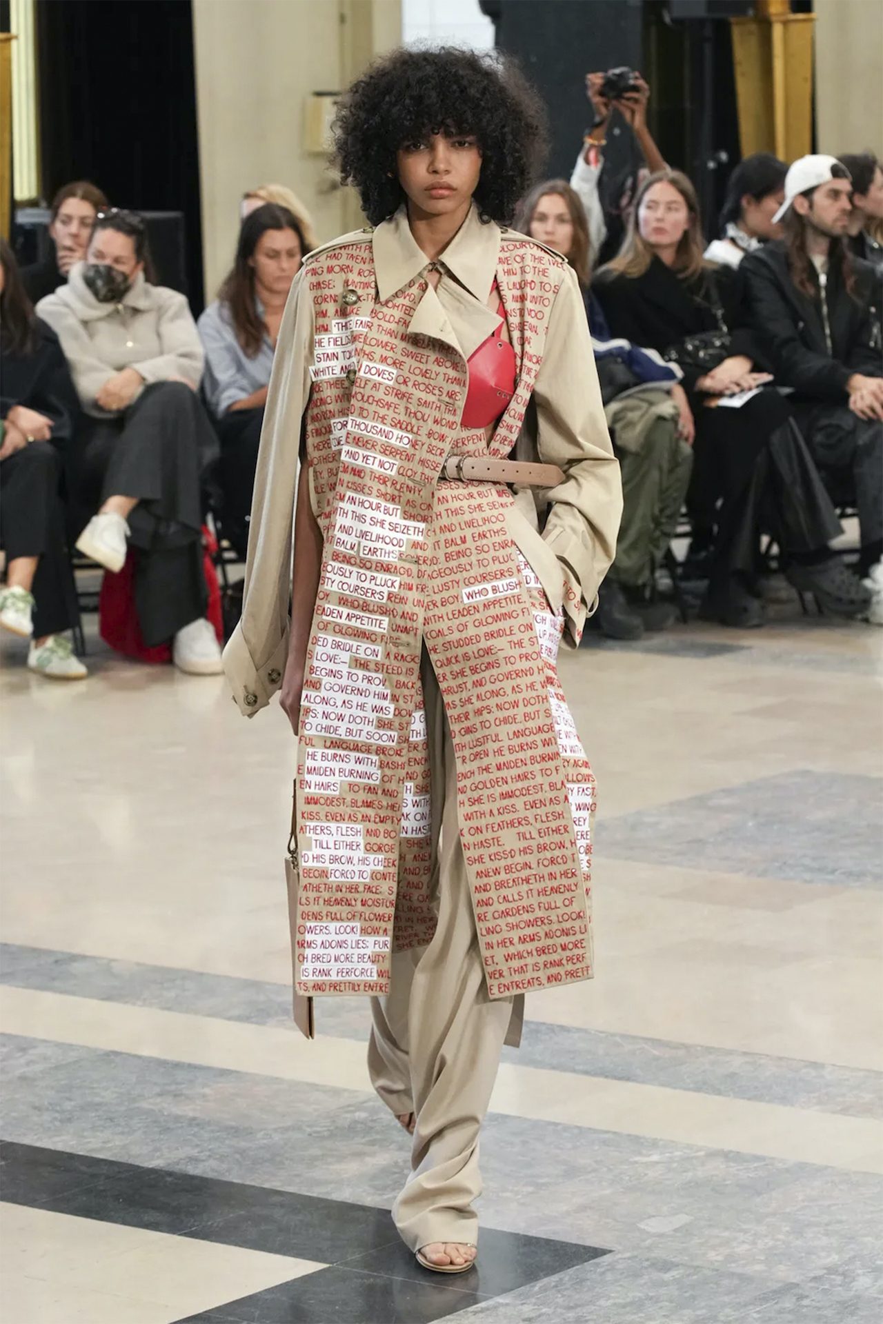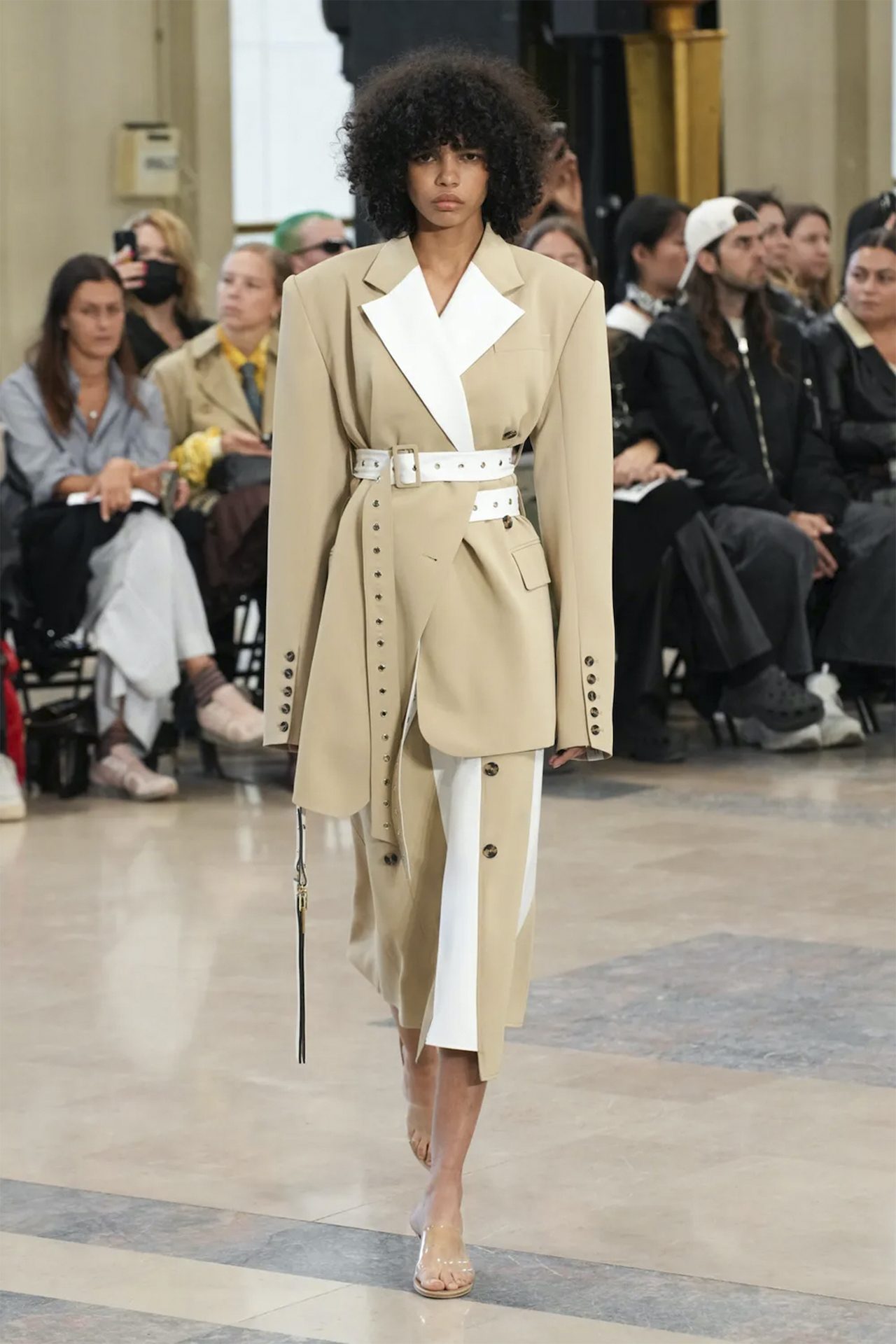 まず今回の CONVERSE のデザインについて話すと、「チャックテイラー」は子供の頃から大好きなモデルでした。その昔懐かしい気持ちや思い出などそれぞれの要素を複数のブロックとして組み立てるようにデザインしました。ダブルソールを制作し、そこからアッパー素材のレイヤーに取り掛かりました。靴の中に4つのレイヤーがあり、様々な種類とトーンのスエードやレザーなどパズルのように組み立て構築された細かなレイヤーを楽しめる設計にたどり着きました。ベースの色はホワイトですが、異なるシェードのホワイトやグレーが用いてヴィンテージにも見えるニュートラルトーンで作ろうと決めていました。自然なフェードを新しい方法で取り入れることができたと思っています。質問に戻りますが、コレクションで発表したこのコートは一般的なフォーマルコートよりもしっかりとした作りになっています。テクニカルファブリックを用いてキルティング製法で制作しました。さらにレイヤーを追加し遊び心あふれるデザインにして、それが CONVERSE をデザインした過程とリンクし、双方の“遊び心”に繋げたいという思いから、このルックが完成しました。とても気に入ってるルックの一つです。
