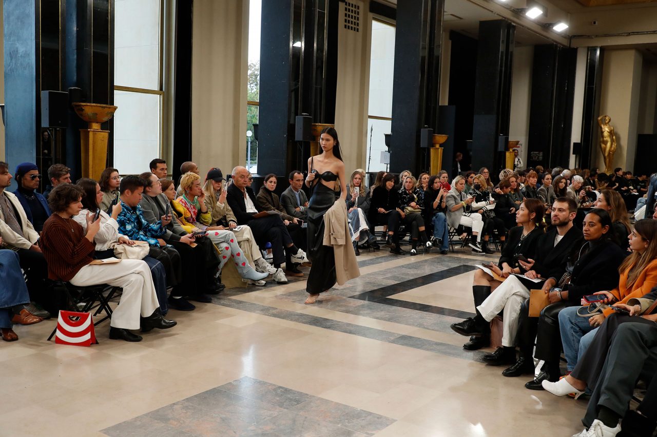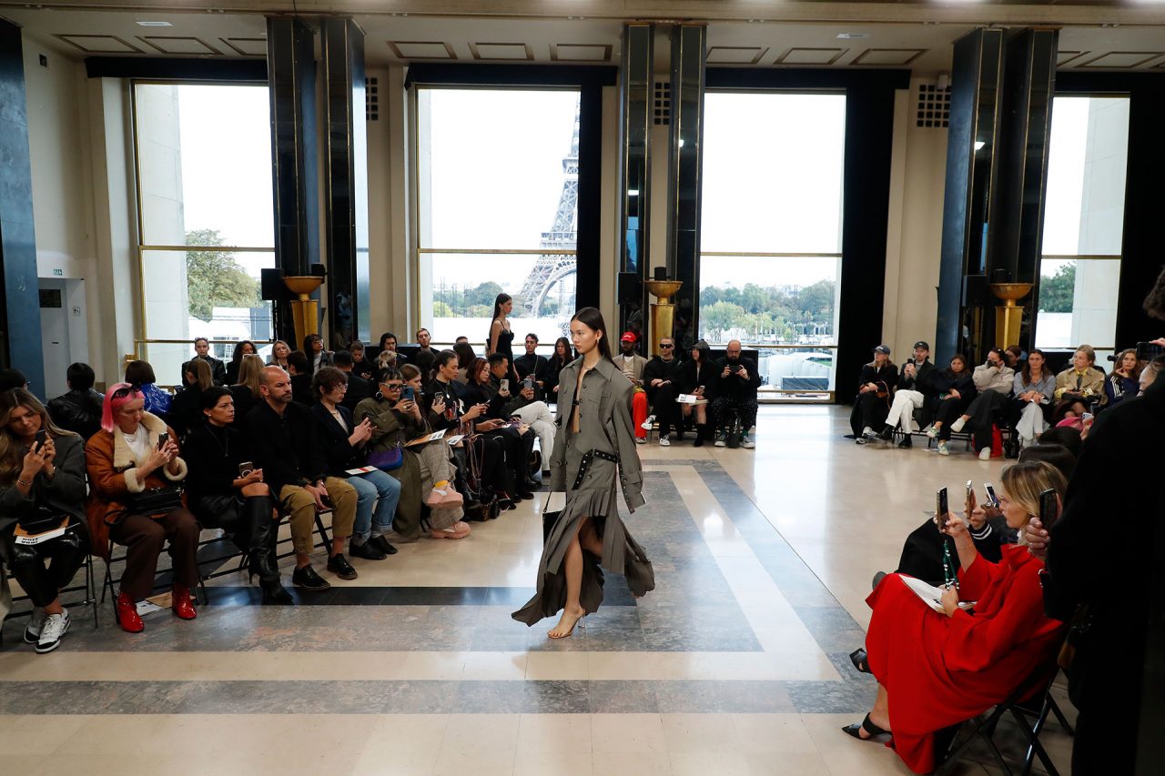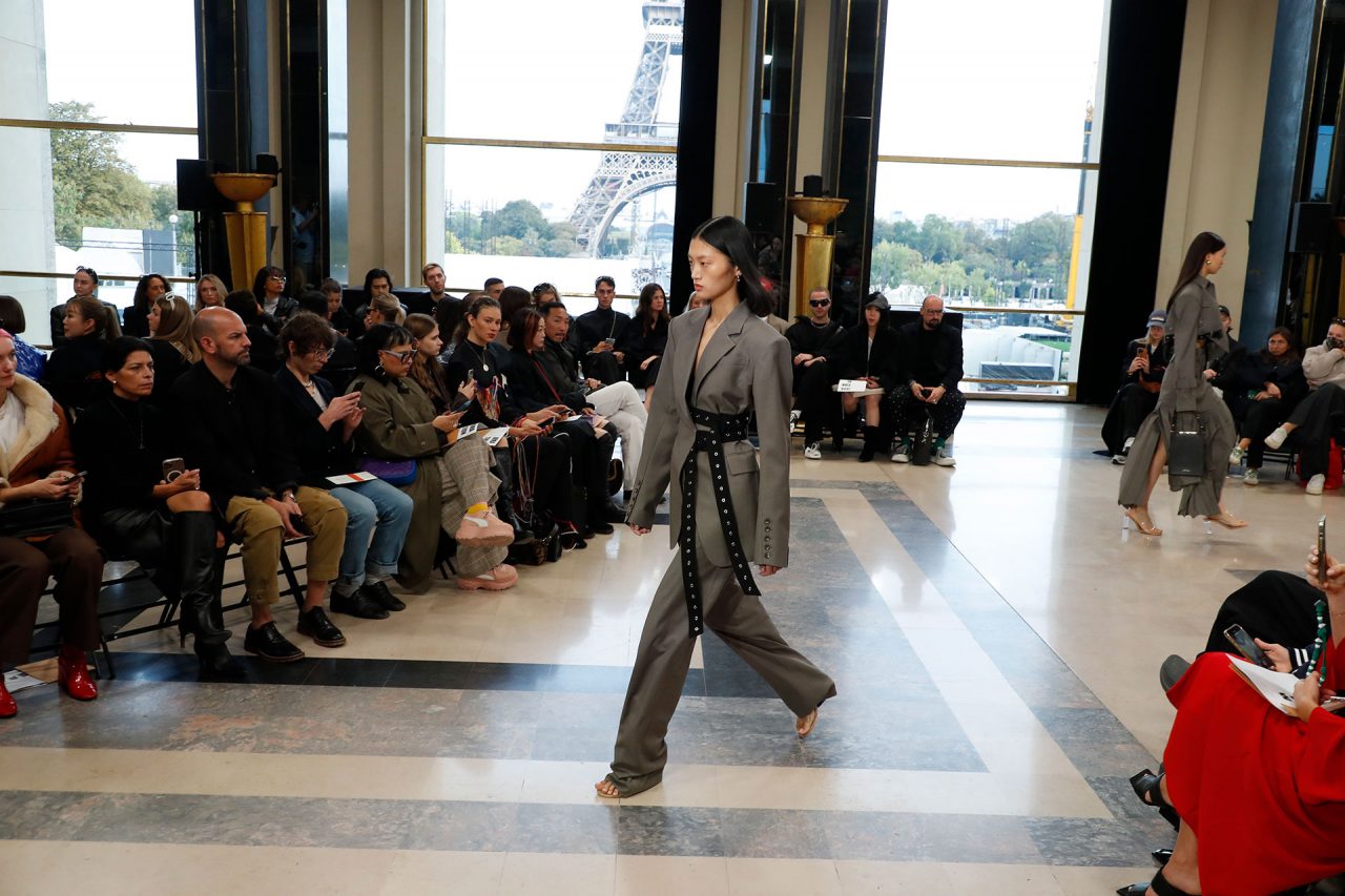 はい。デザインする上で「メリハリ」をとても大切にしています。しっかりとした直線のラインの洋服に湾曲なカットを加えているんですが、会場も同じように椅子の配置を湾曲にしてリンクさせました。また ROKH はベージュなどニュートラルな色合いを持つブランドなのでそれに合わせ、少し暖かみのあるトーンの会場を探したんです。ショーの時間帯も、黄色がかり暖かいトーンの日差しがかかる時間を選び、神秘的なショーを作り上げることができました。