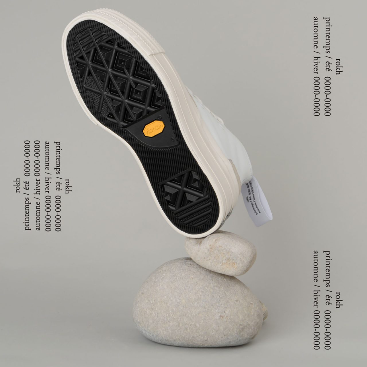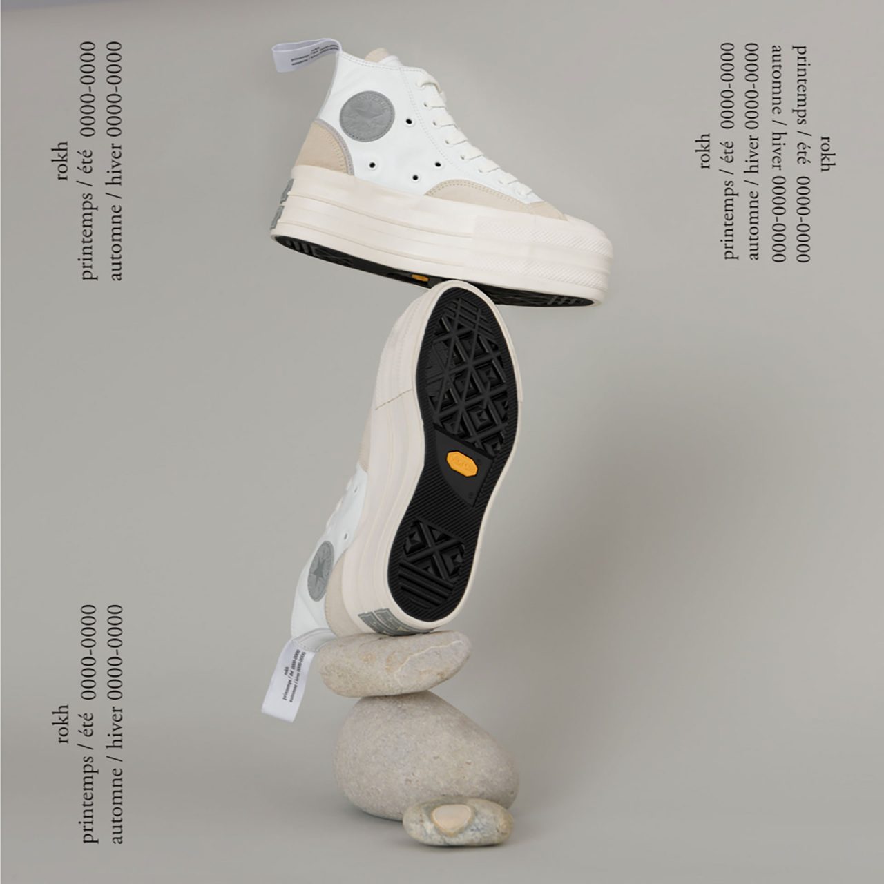 そうですね。昔に彼女の展示会で初めて会い、コレクションについて話し合ったのが出会いでした。そして今回のコレクションの制作をしていた時、遊び心を交えながらも美しい物を制作する彼女が適任だと感じました。それで私から彼女にアプローチし、一緒にイメージを組み立てました。彼女にパズルの話や子供時代の話をすると、私の名前が Rok (ロク) なので、名前にちなんで“石(ロック)”を使ったら面白いのではないかと提案してきたのです。それで、彼女は自分でスペインを歩き回り、完璧な石を探したらしいです。この石の上に CONVERSE がバランスよく積み上げられた作品は、デジタルでのデザインでなく、本当にリアルに組み立てた作品なんですよ。コロナのロックダウン期間に制作が行われたため、彼女は一人で石を積み上げてくれました。少し時間がかかってしまったんじゃないですかね。