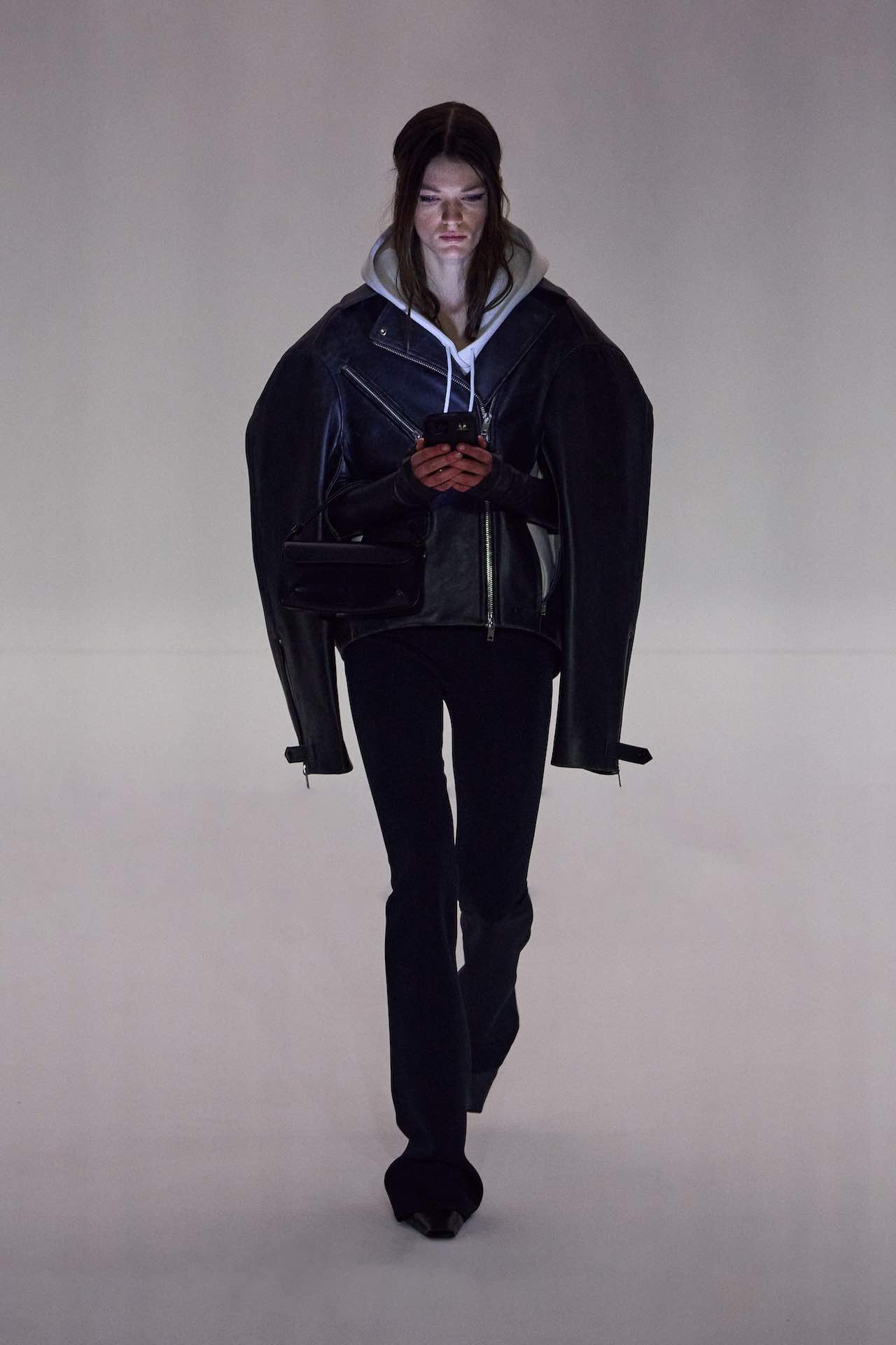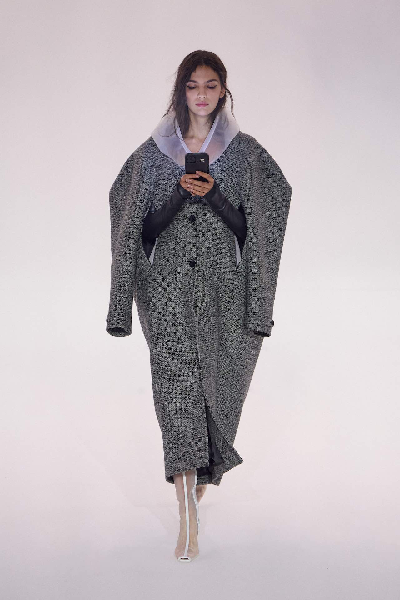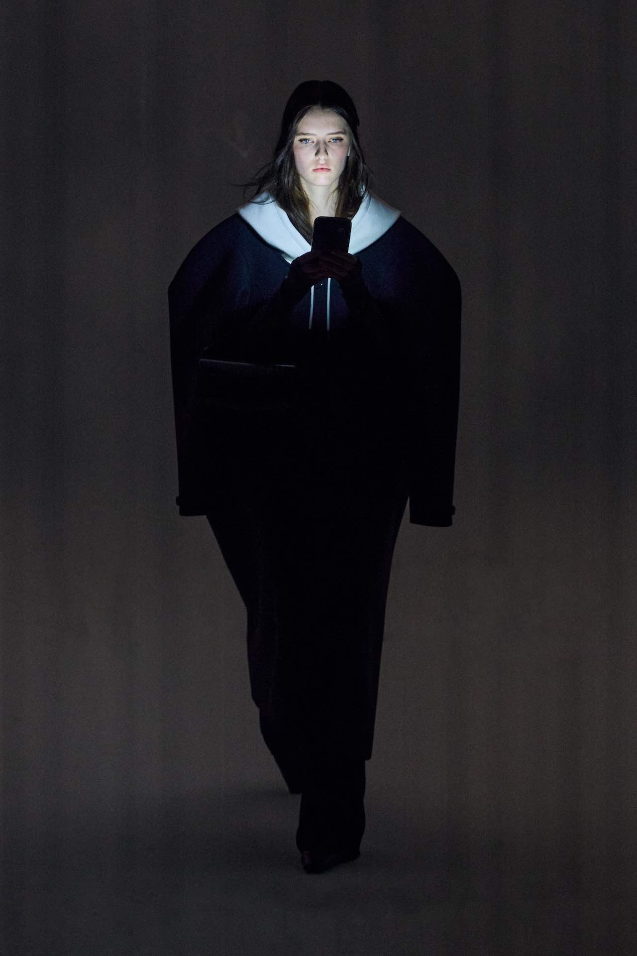 —本当ですね、まったく一緒!携帯を常に手にしているご自身の様子も、2023年秋冬コレクションとまさしく同じですね。機械音声が「Is the sky blue?(空は青色?)」という質問を繰り返す中、スモークからモデルが歩きスマホしながら登場する演出には、どのようなメッセージを込めたのでしょうか?