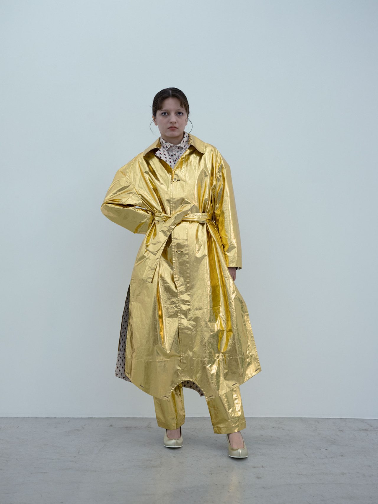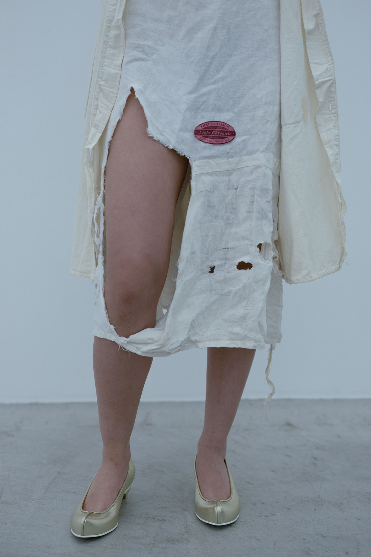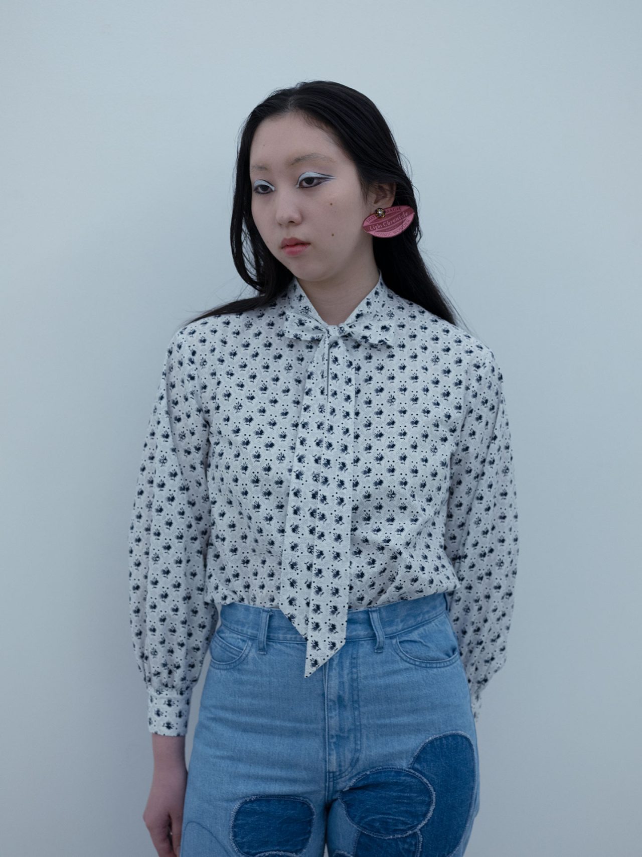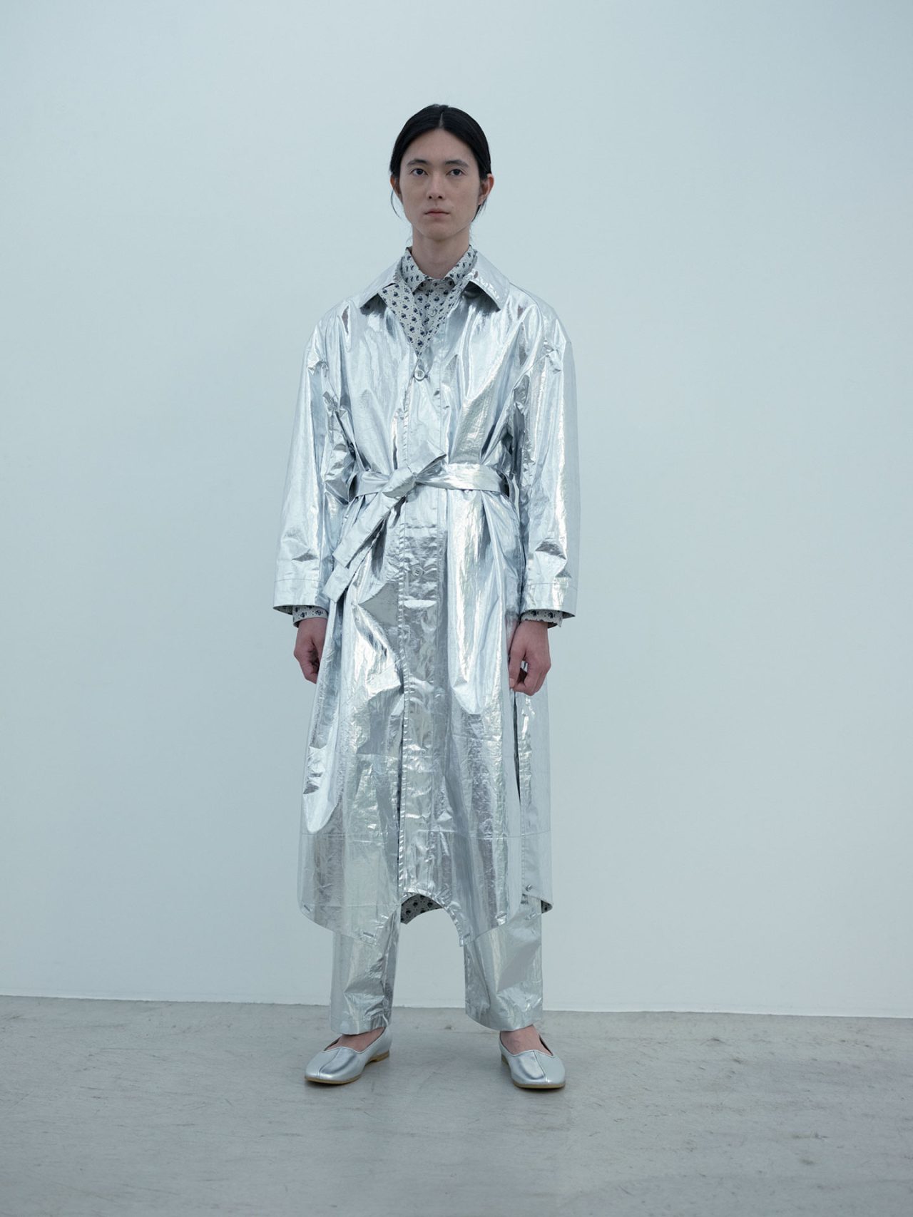 A:今回の展示の試みとして、COSMIC WONDER のコレクションにドローイングがなされています。「瞬間的、偶発的、運動神経的なプロセス」、その三拍子の動きは確かに魔術的な作用の賜物を感じます。昌穂にとってそれは初期から変わらない普遍的で根源的なエネルギーであって、衣服に解き放たれた時、さらに私たちを惹きつけました。あらゆるものが作品の土台となる喜びは、壁に描けば雨に打たれて絵が削られていく、服に描けば着用者の使用で描いた絵が朽ちていく、そのような消え行く自然の美しさは、芸術の根底であって原初の試みとも思われます、そしてそれは昌穂の作品の本質的なものだと感じています。とはいえ、LINALSASI の輝く空間はとても美しいです、このような芸術の原初的な空間を作ってくださりとっても嬉しいです。