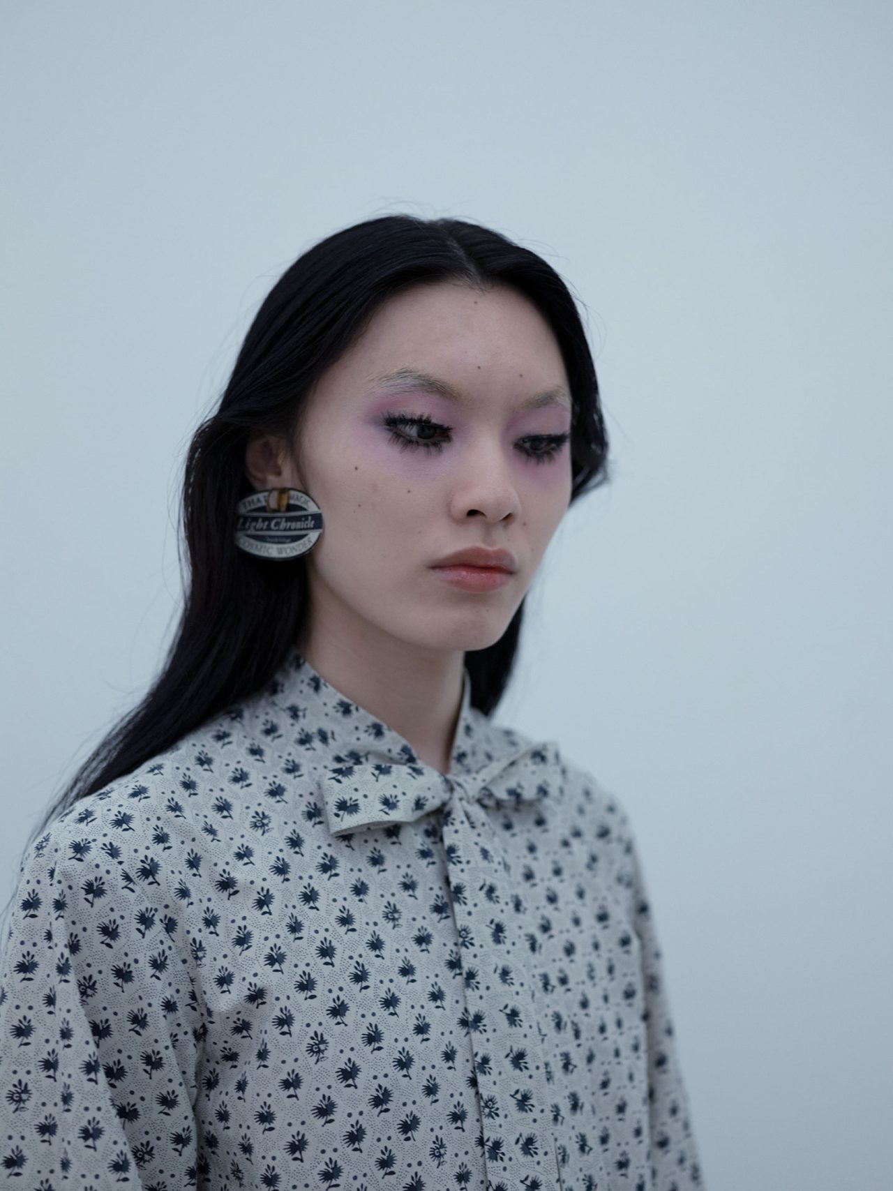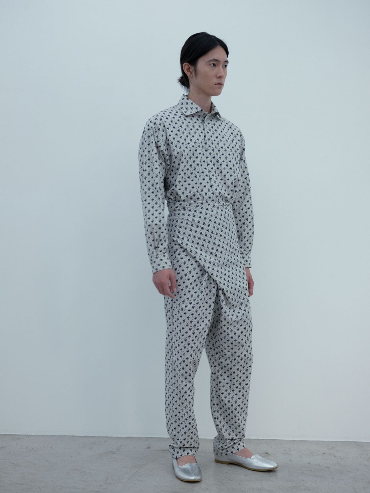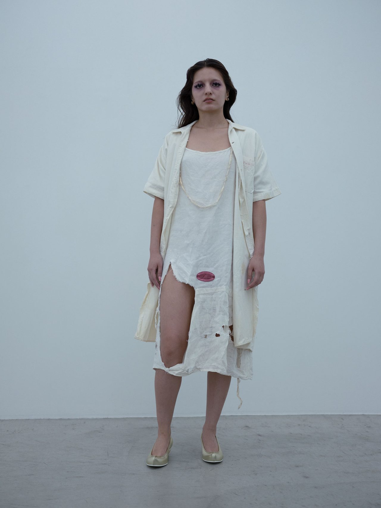 A:今回の展示の試みとして、COSMIC WONDER のコレクションにドローイングがなされています。「瞬間的、偶発的、運動神経的なプロセス」、その三拍子の動きは確かに魔術的な作用の賜物を感じます。昌穂にとってそれは初期から変わらない普遍的で根源的なエネルギーであって、衣服に解き放たれた時、さらに私たちを惹きつけました。あらゆるものが作品の土台となる喜びは、壁に描けば雨に打たれて絵が削られていく、服に描けば着用者の使用で描いた絵が朽ちていく、そのような消え行く自然の美しさは、芸術の根底であって原初の試みとも思われます、そしてそれは昌穂の作品の本質的なものだと感じています。とはいえ、LINALSASI の輝く空間はとても美しいです、このような芸術の原初的な空間を作ってくださりとっても嬉しいです。