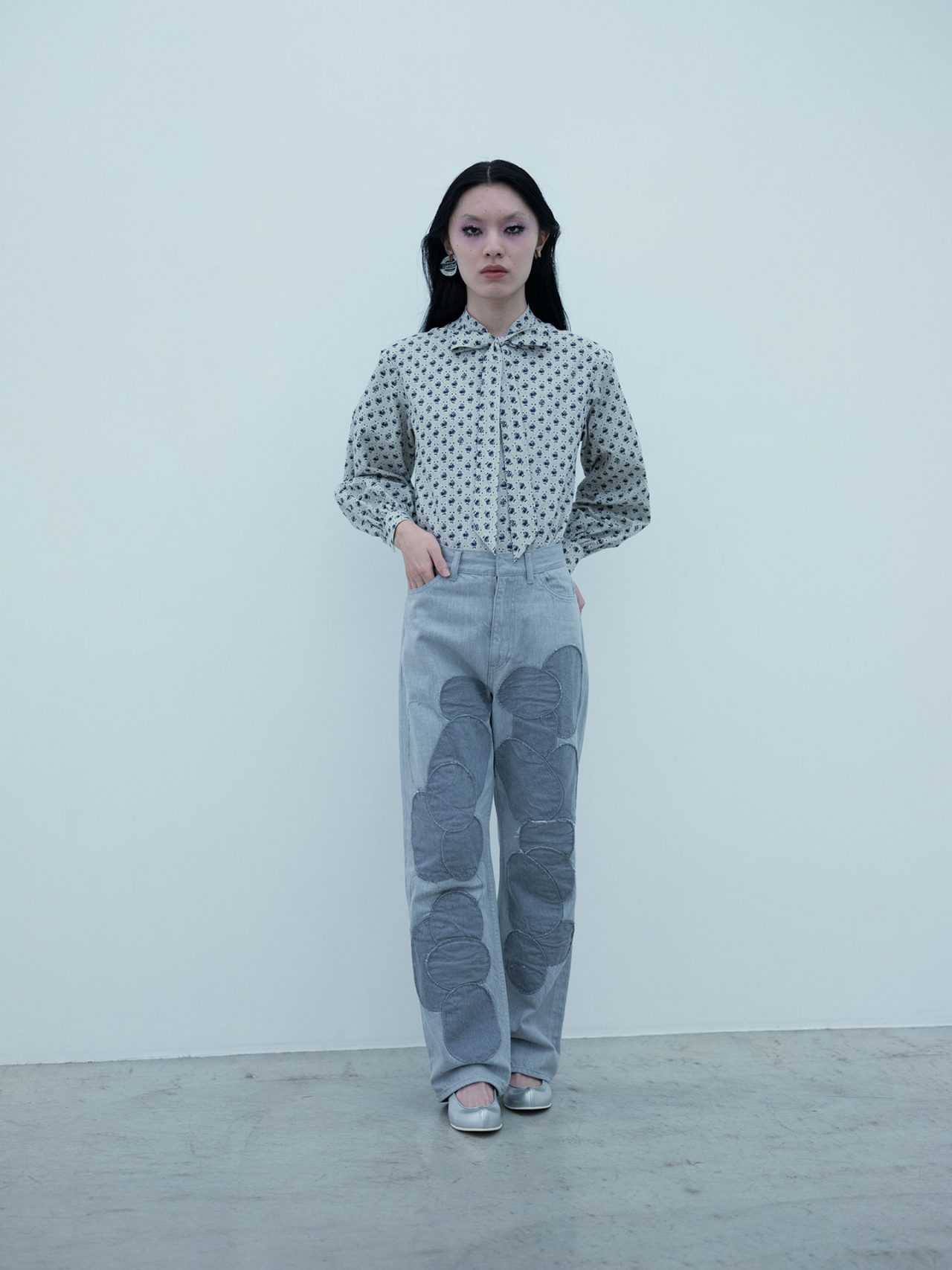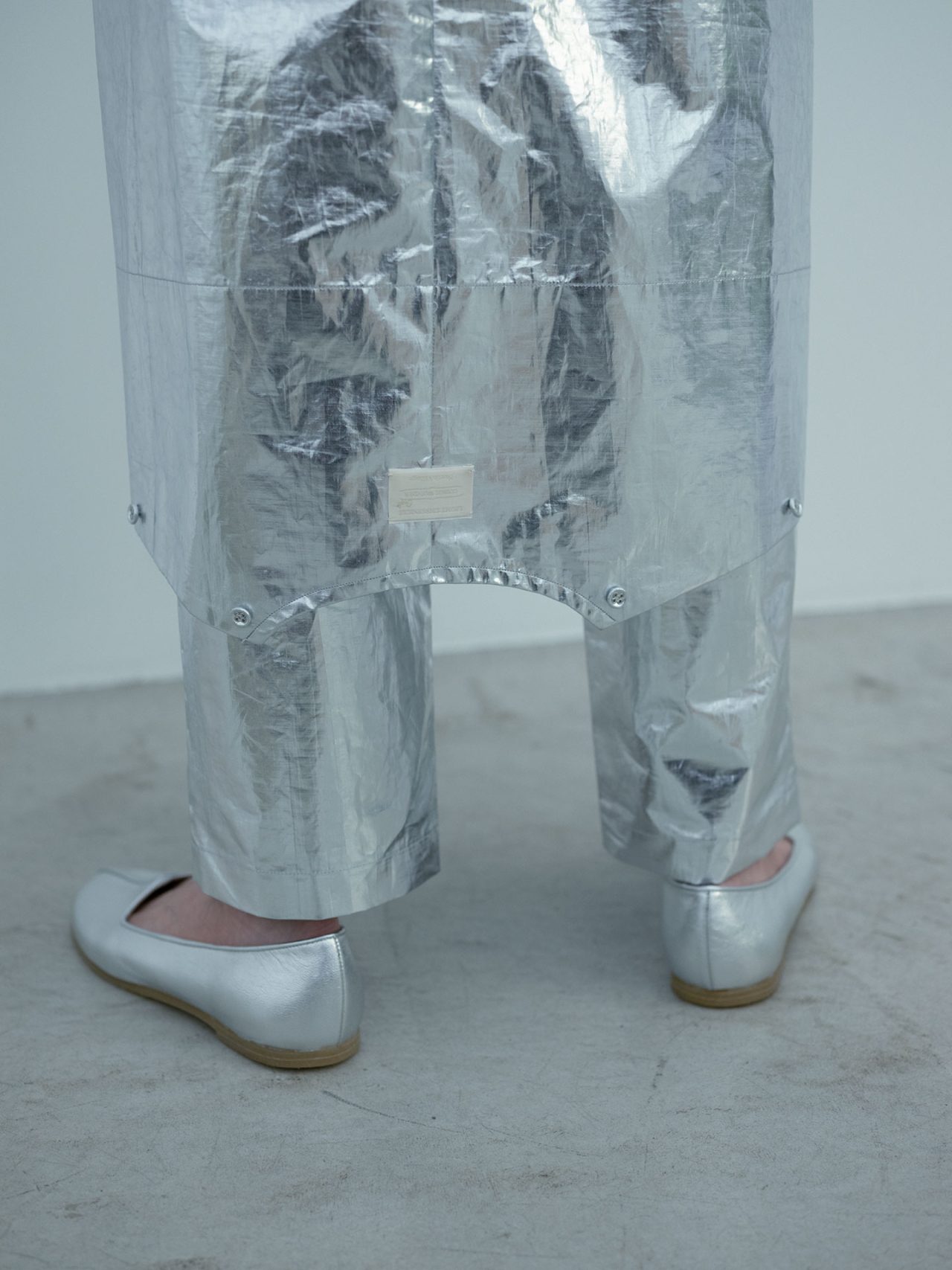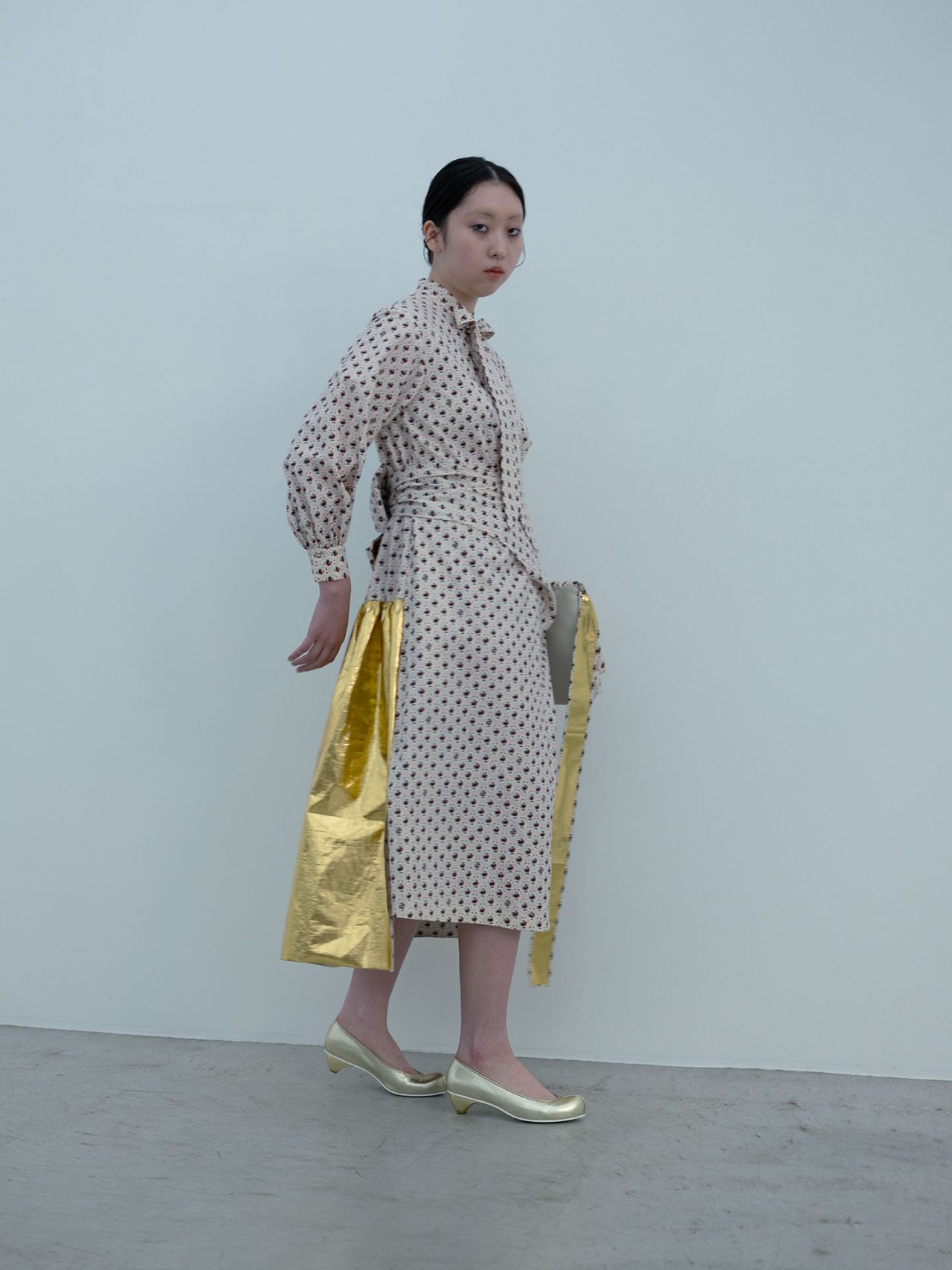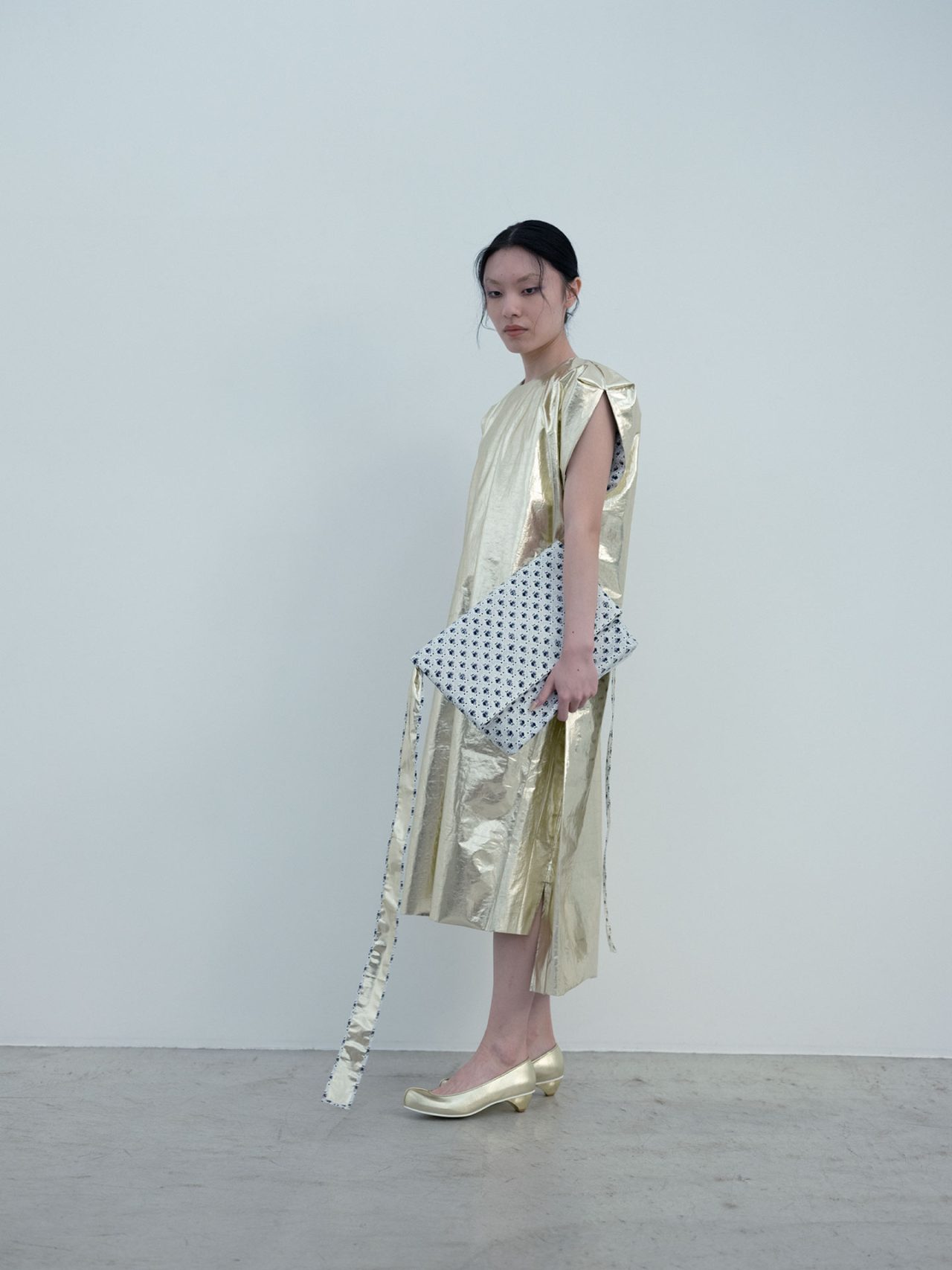 A:今回の展示の試みとして、COSMIC WONDER のコレクションにドローイングがなされています。「瞬間的、偶発的、運動神経的なプロセス」、その三拍子の動きは確かに魔術的な作用の賜物を感じます。昌穂にとってそれは初期から変わらない普遍的で根源的なエネルギーであって、衣服に解き放たれた時、さらに私たちを惹きつけました。あらゆるものが作品の土台となる喜びは、壁に描けば雨に打たれて絵が削られていく、服に描けば着用者の使用で描いた絵が朽ちていく、そのような消え行く自然の美しさは、芸術の根底であって原初の試みとも思われます、そしてそれは昌穂の作品の本質的なものだと感じています。とはいえ、LINALSASI の輝く空間はとても美しいです、このような芸術の原初的な空間を作ってくださりとっても嬉しいです。