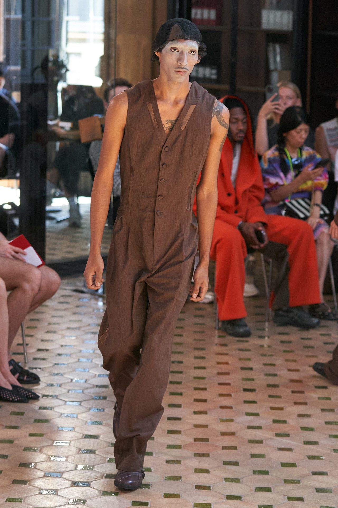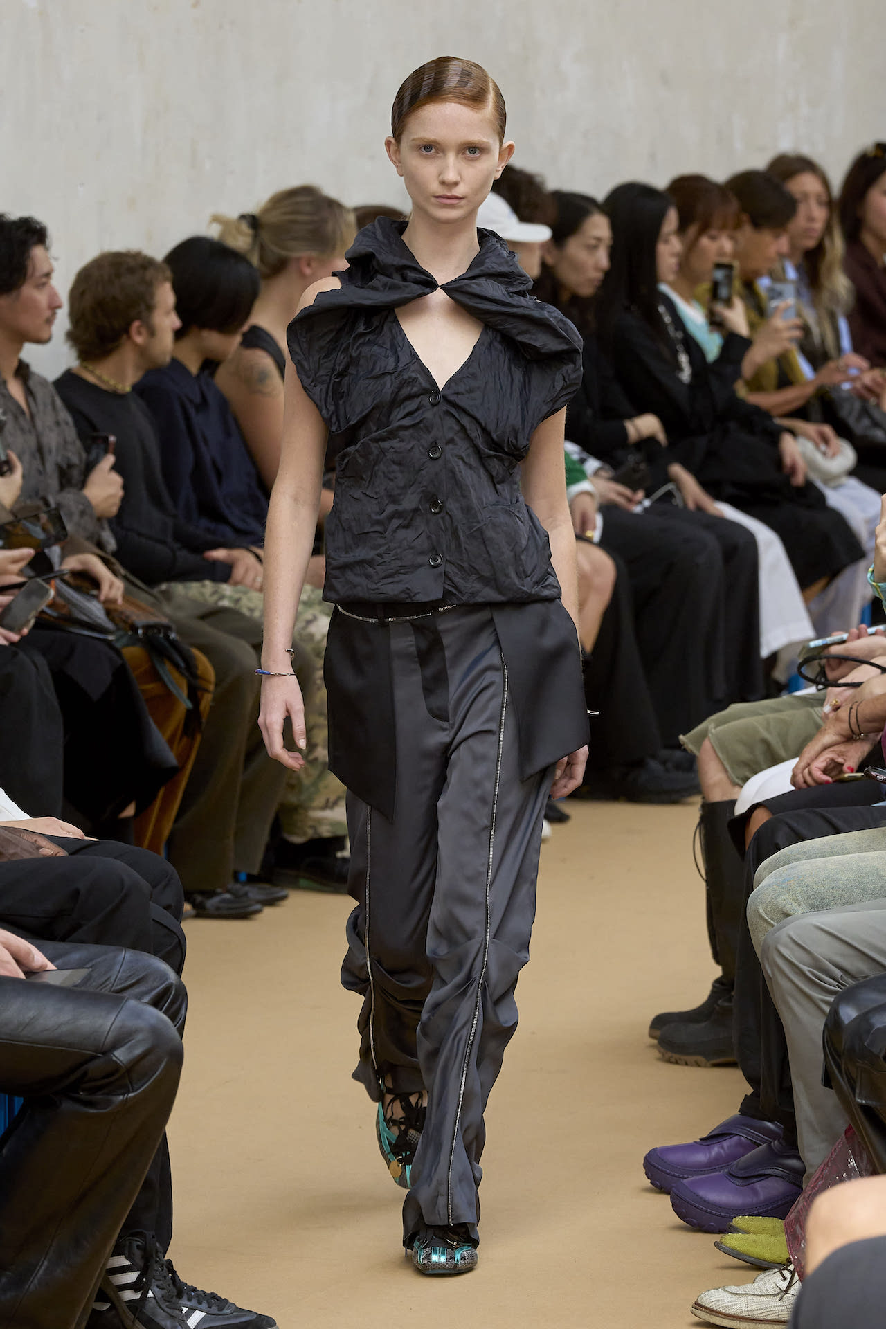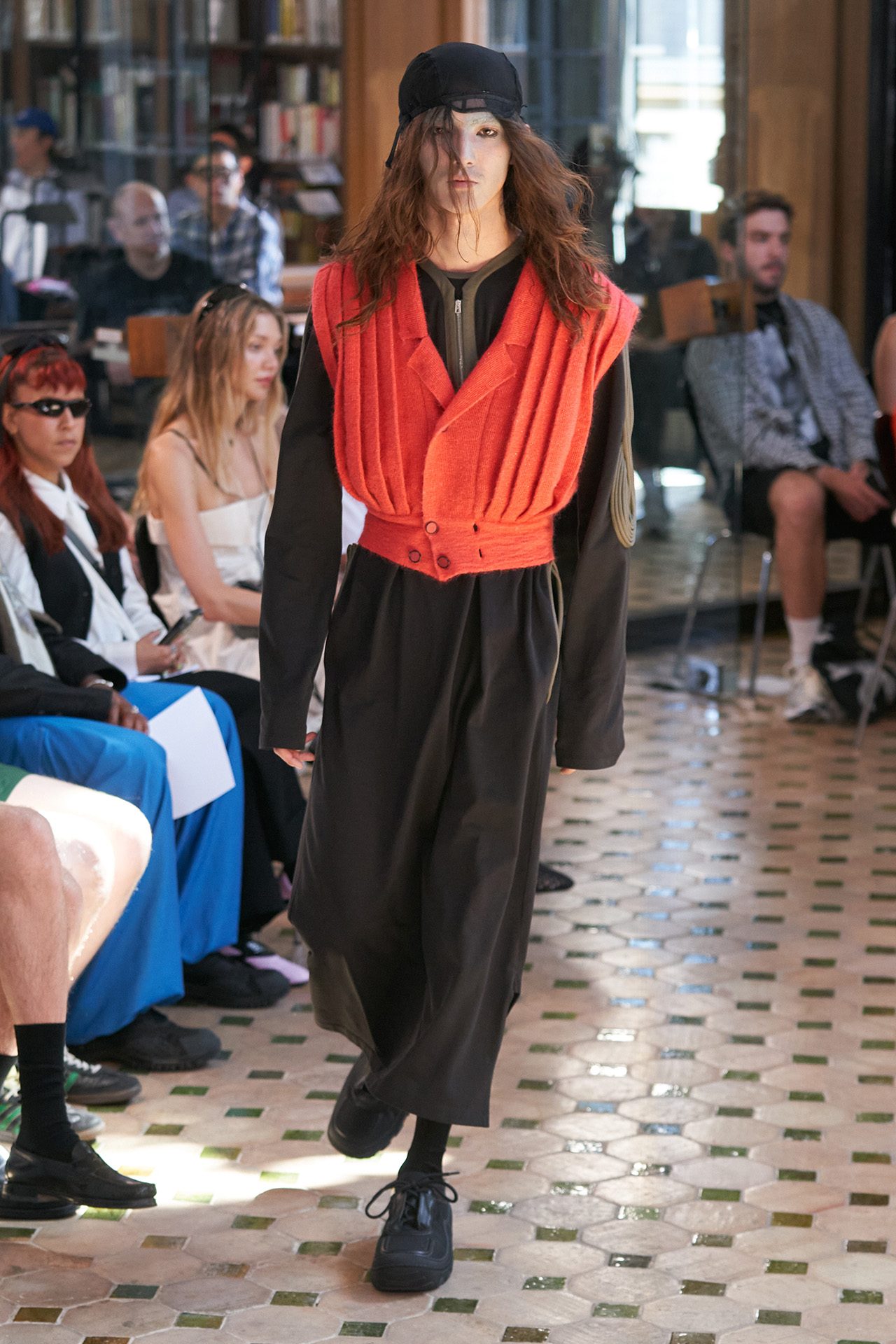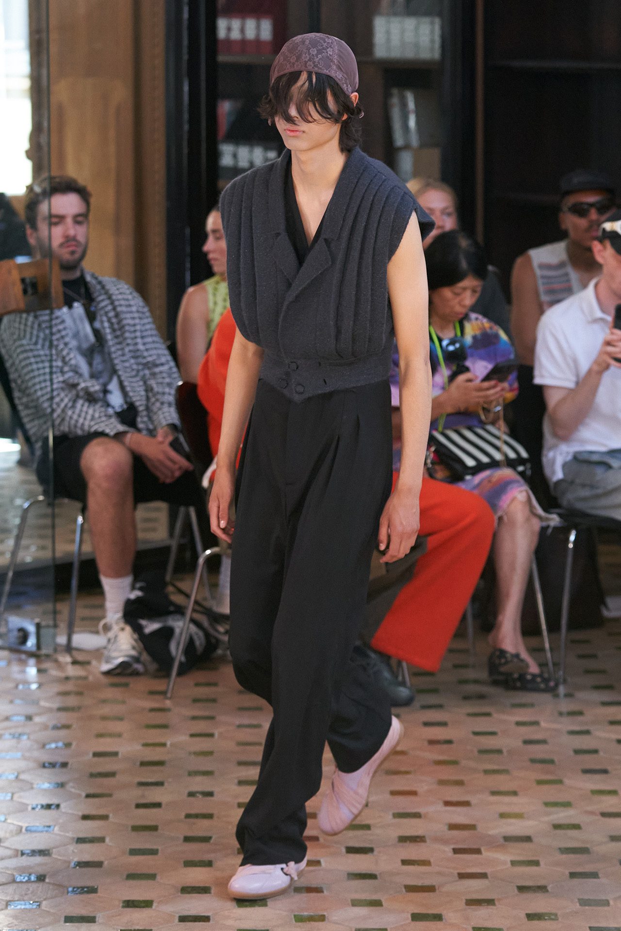 —ここで具体的なアイテムの話を。近年のコレクションでは、とくにテーラードのアイテムが印象に残っています。たとえば、2024SS のランウェイで2番目のルックに登場したウールギャバジンのテーラードジャケット。随所に差し込まれる短いダーツや二重になったラペル、隠しポケットなど、ディテールに心震えました。あれはどうやって思いついたんですか?