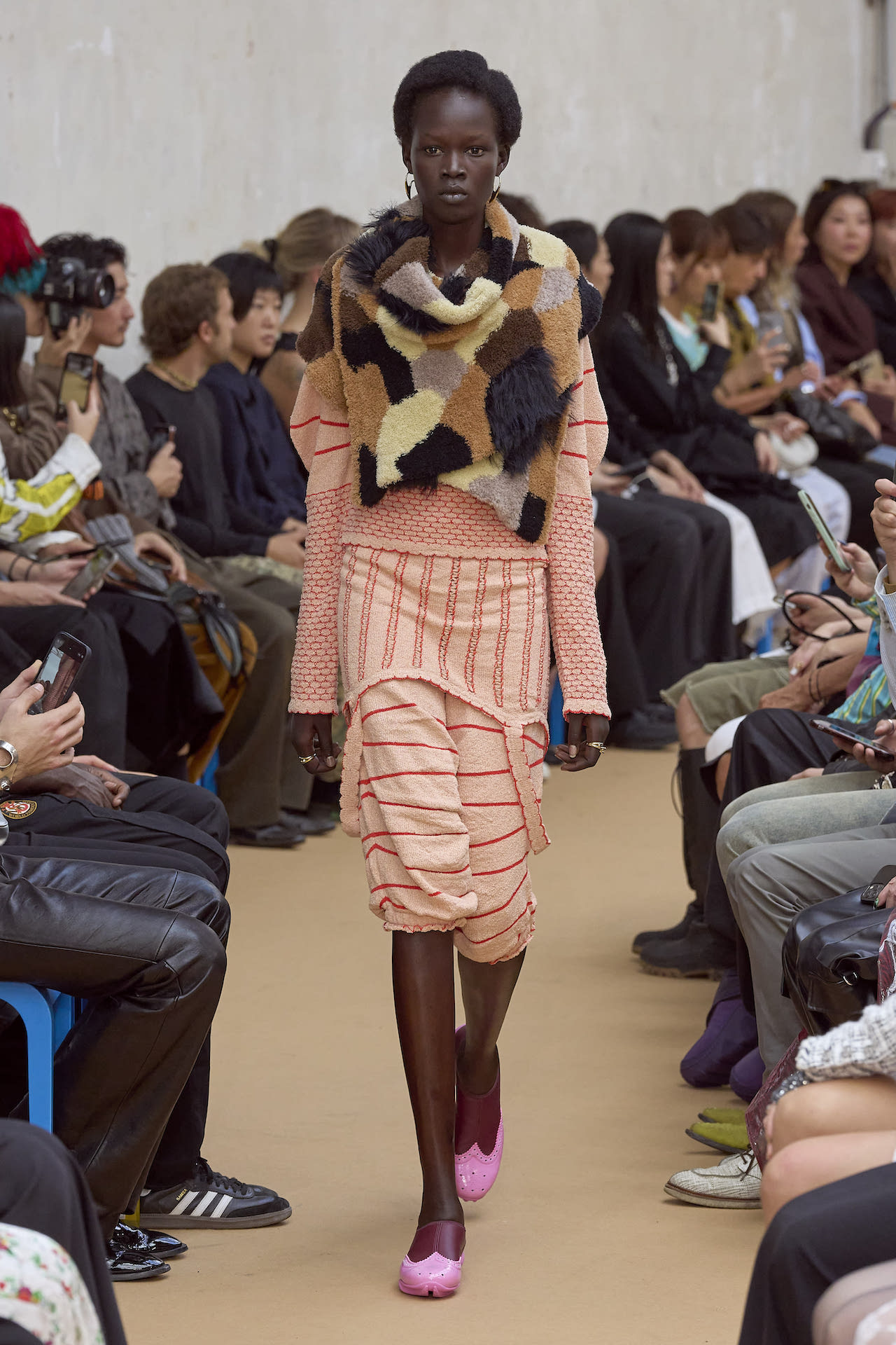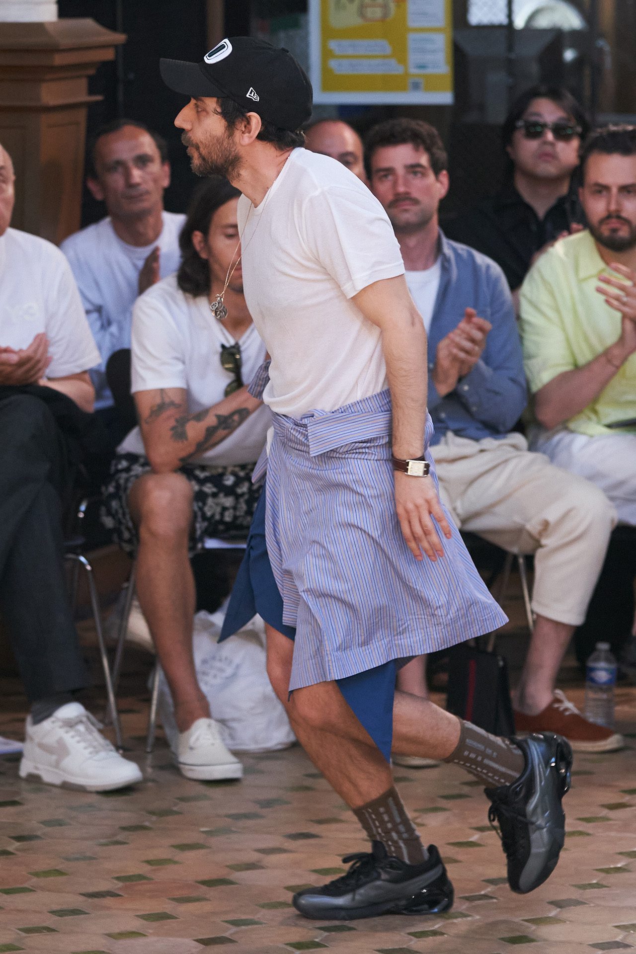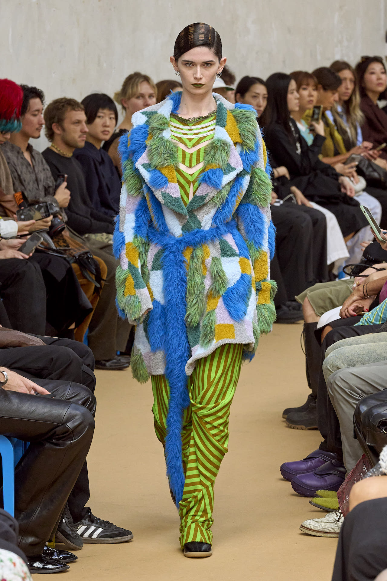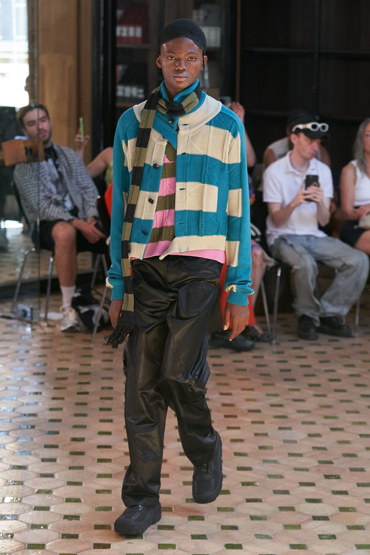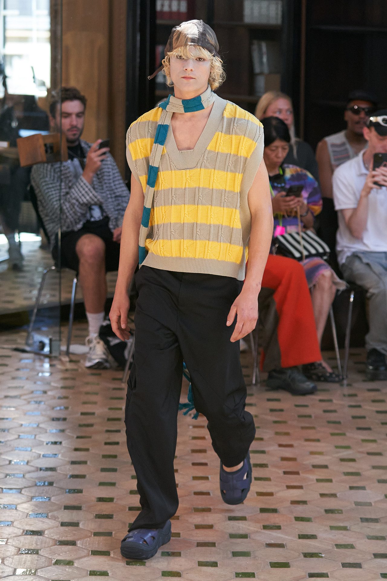 Kiko といえば ASICS (アシックス) とのコラボレーションが有名だが、元々はデザイナーがセントラル・セント・マーチンズ在籍時、Stussy (ステューシー) の服を脱構築したアイテムを発表したことでその名が知られるようになった。その「脱構築」というアプローチは、現在もなお彼らの中核をなしている。彼らは、ワークウェアやニット、テーラードジャケットなどの機能的なシルエットやパーツに対して、音楽のサンプリングのごとく個人的な解釈を加えていく。その存在は、彼自身がファンから神格化されているという点も含めて、Martin Margiela (マルタン・マルジェラ) や Raf Simons (ラフ・シモンズ) の系譜に連なるかもしれない。