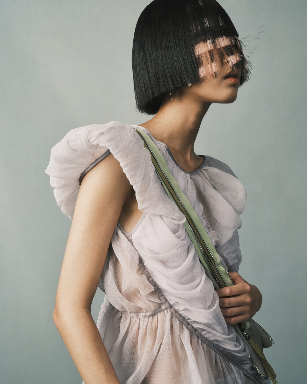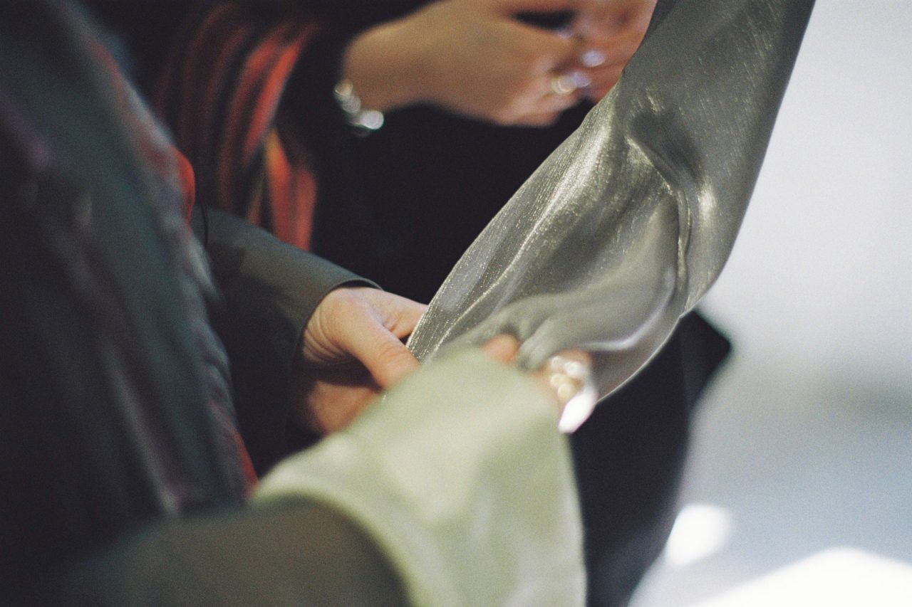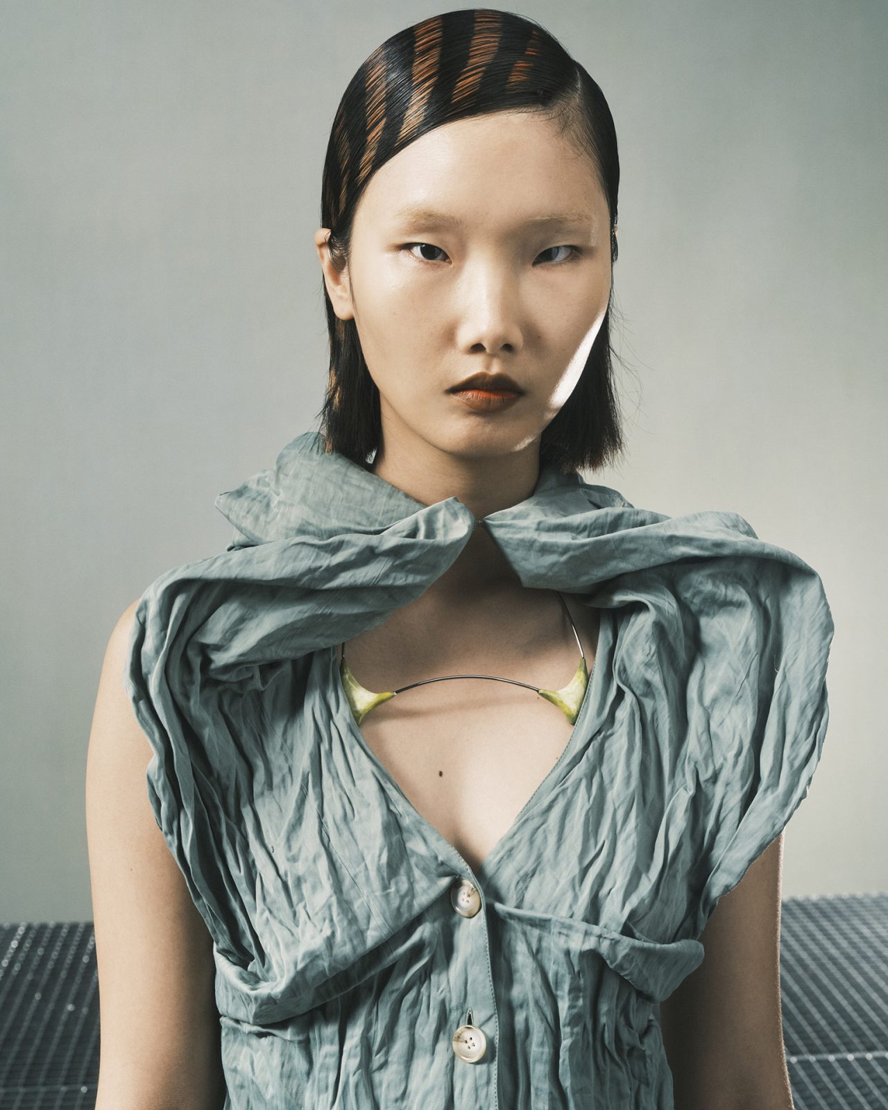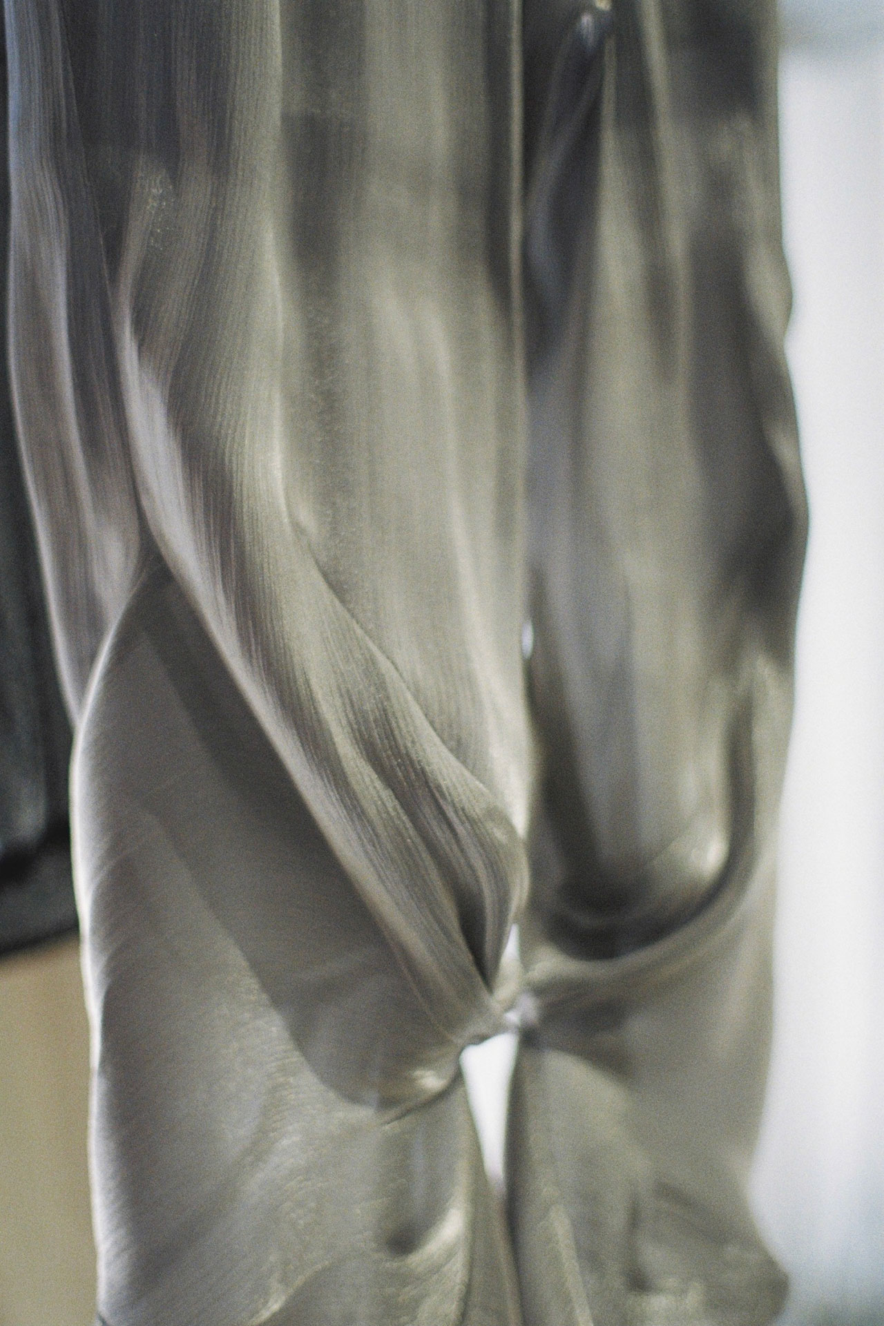 L:良いですよね。30種類くらいのビスコースをリサーチし、どんな経年変化をおこすのかを比較検討する中で、最終的に少し光沢のあってシワ感が出やすいものを選びました。目指したのは、最初に見た時に、今後どうやって育っていくのかが想像できるような服。たとえば、このドレスを誰かが着ているのを路上や何かの写真でみたとします。でも、そこからドレスは変化し続けているので、その見た目はつねに一回きりのもの。私たちはひとつのアイテムの中で時間性を表現したかったんです。
