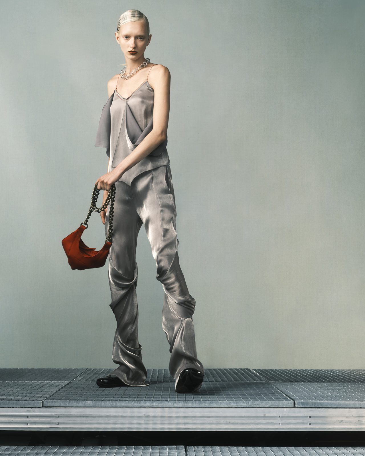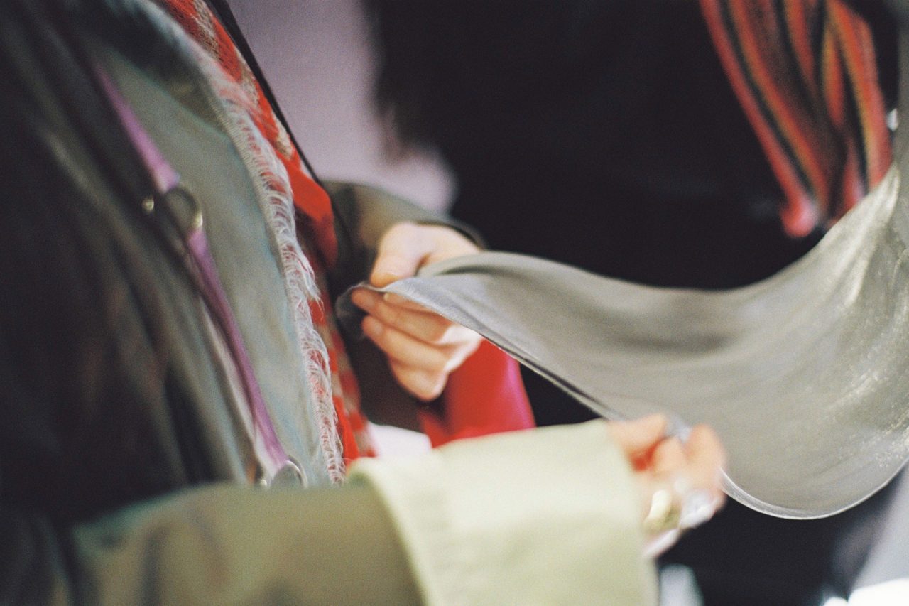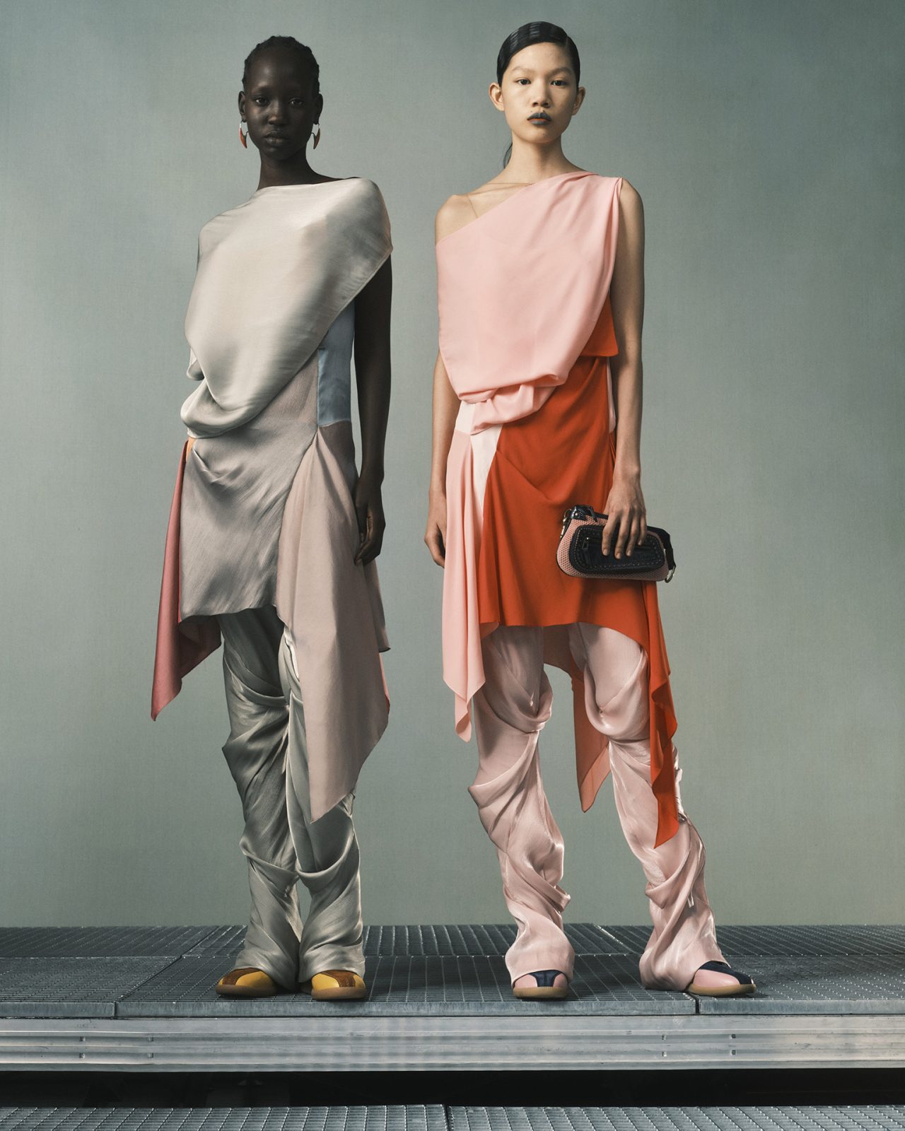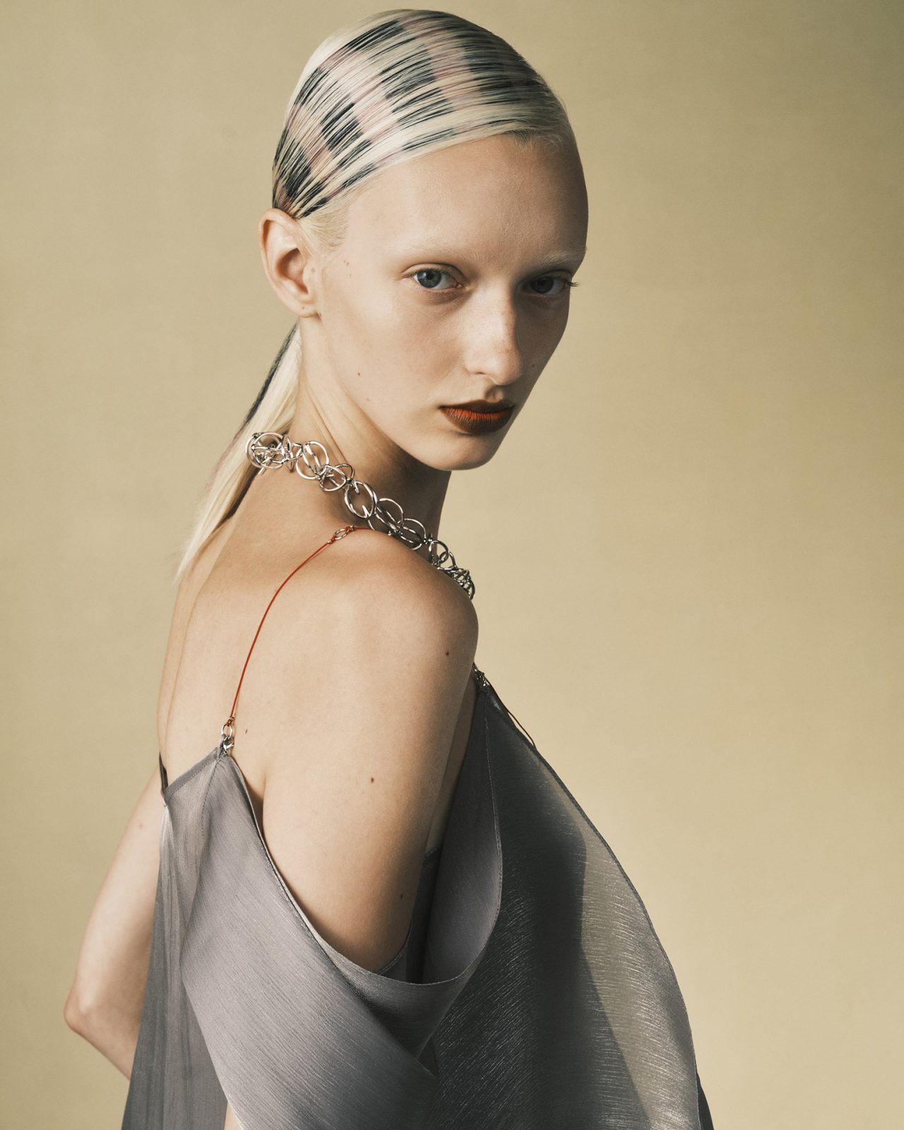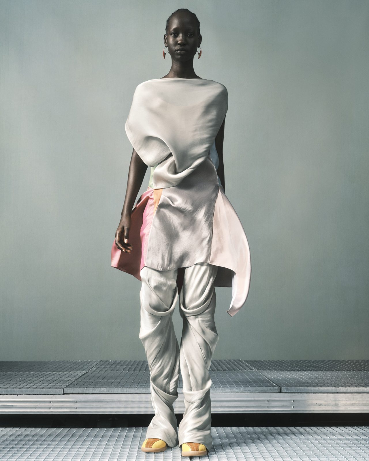 L:良いですよね。30種類くらいのビスコースをリサーチし、どんな経年変化をおこすのかを比較検討する中で、最終的に少し光沢のあってシワ感が出やすいものを選びました。目指したのは、最初に見た時に、今後どうやって育っていくのかが想像できるような服。たとえば、このドレスを誰かが着ているのを路上や何かの写真でみたとします。でも、そこからドレスは変化し続けているので、その見た目はつねに一回きりのもの。私たちはひとつのアイテムの中で時間性を表現したかったんです。