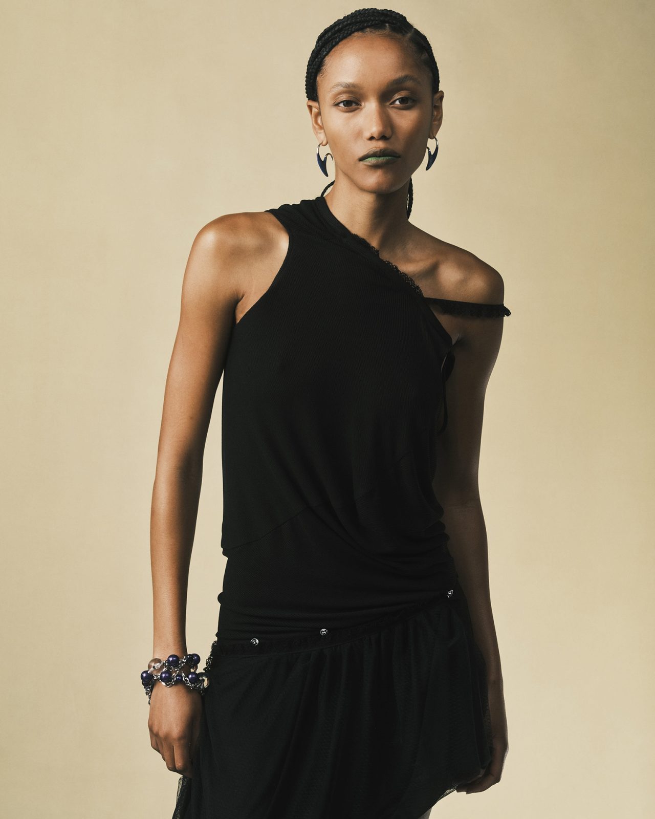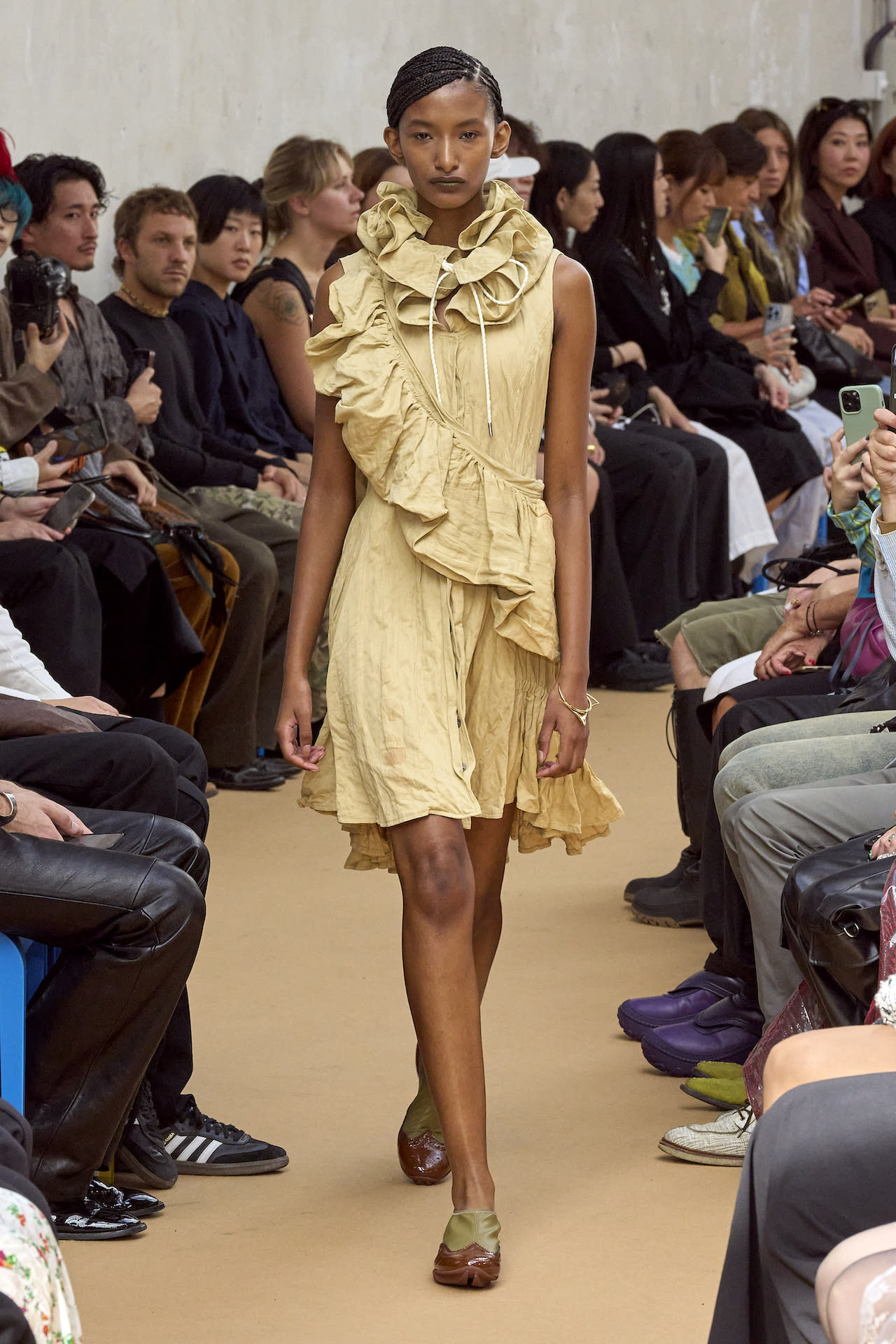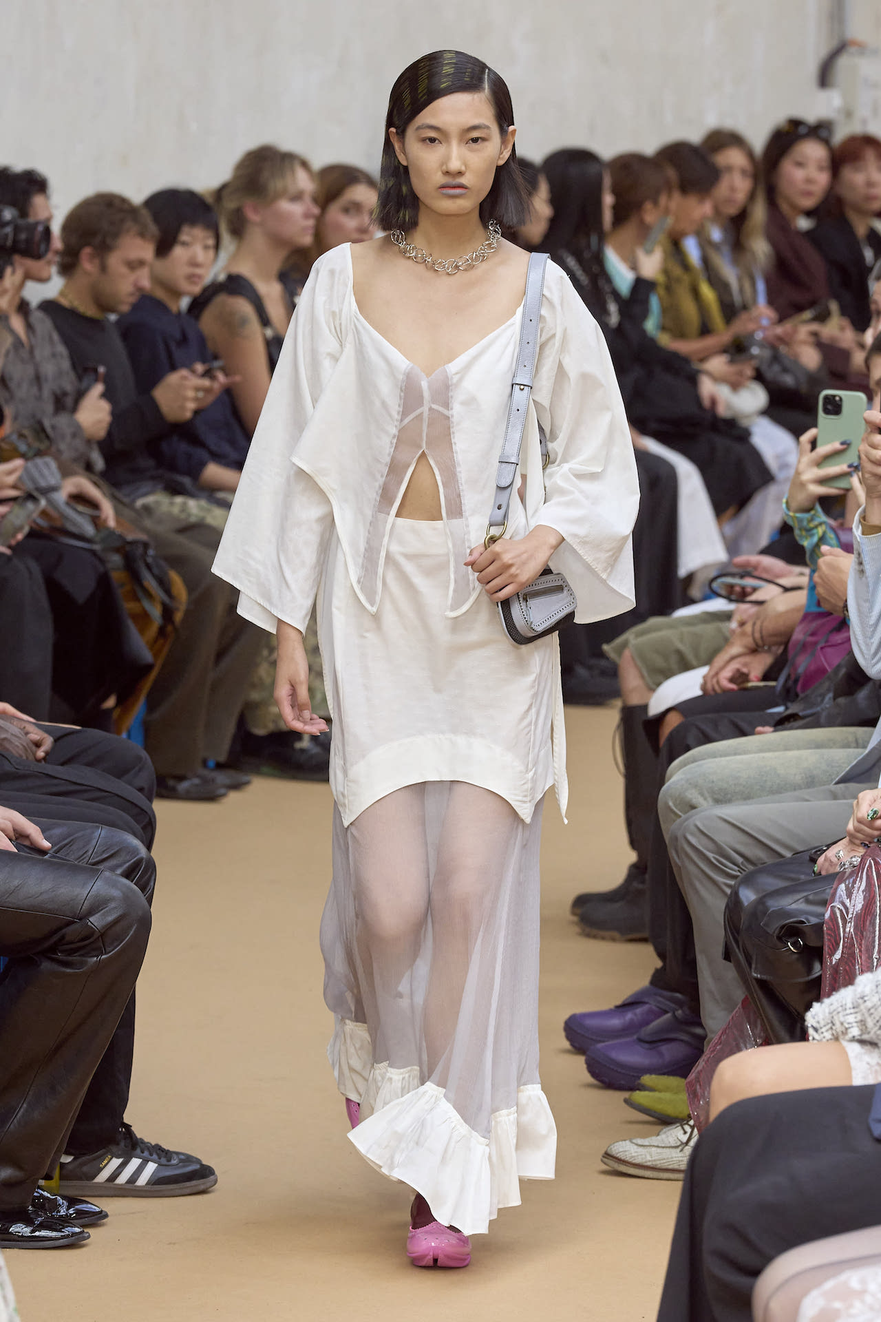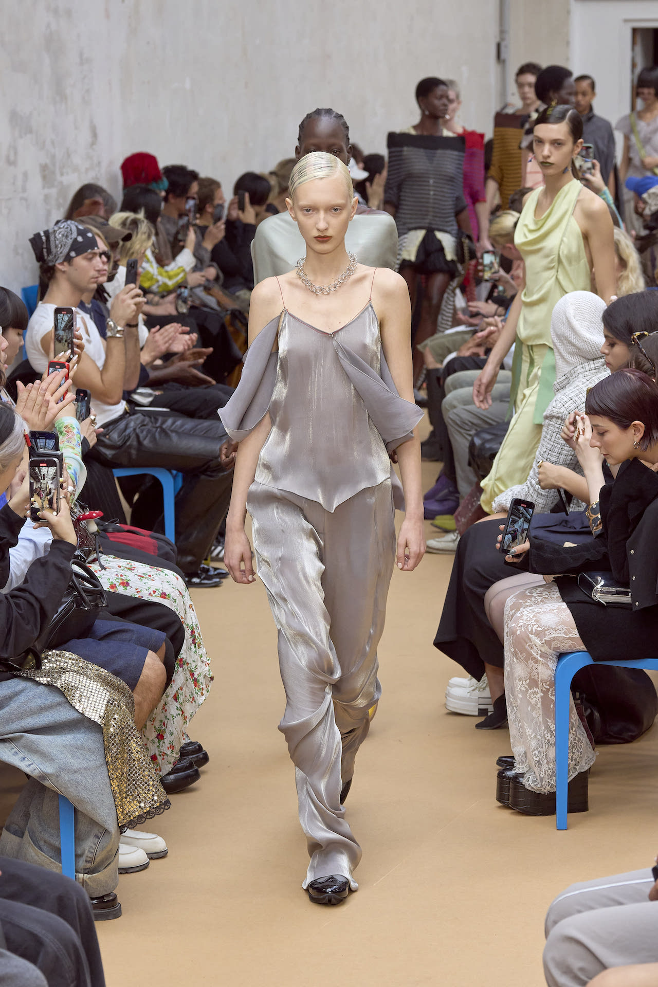 L:良いですよね。30種類くらいのビスコースをリサーチし、どんな経年変化をおこすのかを比較検討する中で、最終的に少し光沢のあってシワ感が出やすいものを選びました。目指したのは、最初に見た時に、今後どうやって育っていくのかが想像できるような服。たとえば、このドレスを誰かが着ているのを路上や何かの写真でみたとします。でも、そこからドレスは変化し続けているので、その見た目はつねに一回きりのもの。私たちはひとつのアイテムの中で時間性を表現したかったんです。