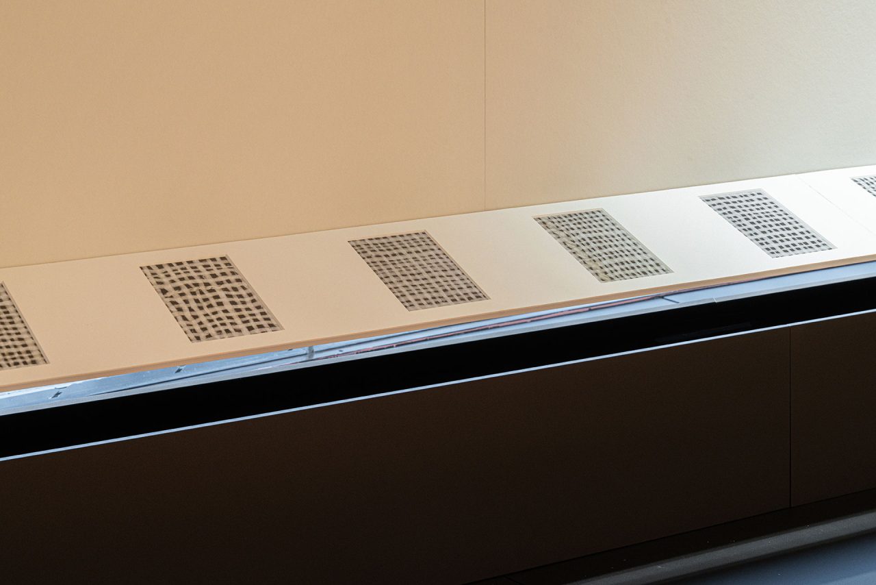 骨董屋で白い江戸時代の着物を買うことからはじめて、ルーペで見て、手でつくった糸や織りのものをつかう。寺で保管されていた打敷などは享保とか文化、文政など奉納された年記銘が墨書きされていて、1700年代とか1800年代の布であることが確認できるんです。並べ方にはなんのルールもないけど、僕なりに並べて、表具屋に仕立てをお願いする。誰もやっていないだけで、もし、同じようにやろうと思えばできます。僕よりもいい作品ができるかもしれない。でも、ボイスのインスタレーションもそうで、ボイスが手をかけるから気配が出る。違う場所で展示をする時、もとの通り1ミリも狂わず配置しても、作家が直接置いたものじゃないと、ただ置いただけで何の意味もない。《白》も同じです。作家が手をかけることで「気配」が出る。