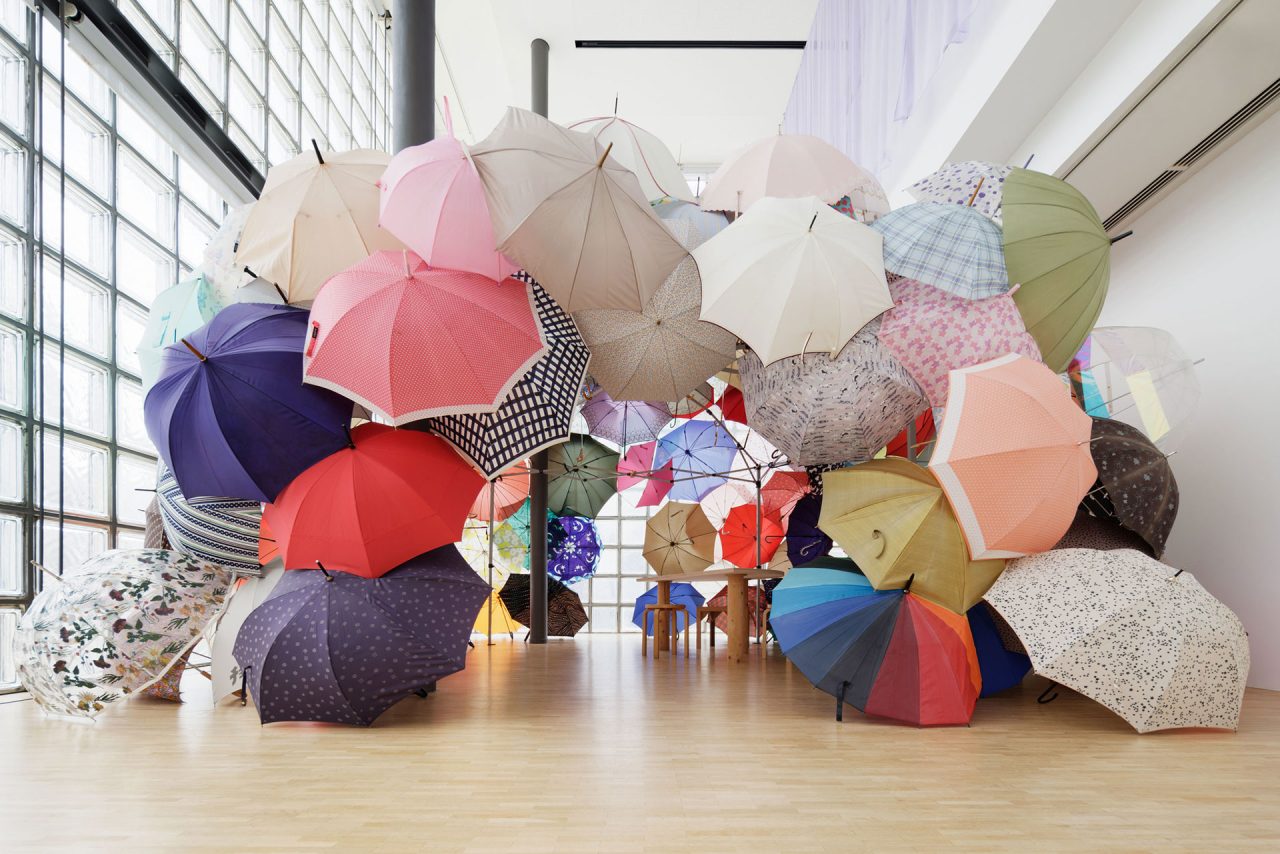 André Cadere (アンドレ・カデレ) の代表作の一つ《Round wooden bar(丸い木の棒)》(1970–78)は、招待されていない展覧会のオープニングや公共空間に持ち込むアクションを起こすというもの。絵の具で塗られた棒を持ち歩き、時には無許可でギャラリーに置き、再び持ち帰るなど、規制の芸術空間や制度に対する批判的なパフォーマンスです。Helen Chadwick (ヘレン・チャドウィック) の写真作品も、自身の身体で家電を模して、女性の身体を物として扱うことを明快に批判した代表的なフェミニズムアートの一つです。また Jessica Diamond (ジェシカ・ダイアモンド) は、作品を一人の作家だけが生み出すという前提や、その背後にある作家の権力構造に疑問を投げかけてきました。代表作の一つである草間彌生をオマージュした壁画も、ダイヤモンドのプロコトルを元に、エルメス財団のチームが描いた作品を今回展示しており、まさに“Faire Corps”を象徴する作品だと言えます。笹原晃平による大規模インスタレーションも、公共施設や店に忘れられた傘を彼が書いた指示書をもとに他者が設置するというプロセスを踏んでいます。市民の参加を促進し、現代美術を発展させようとする社会的かつ実践的な作品です。メタボリズムへのオマージュでもあり、作家の権威主義を批判する作品でもあり……。そして色や柄もさまざまな傘が、社会は多くの個性の集合体であることを象徴しています。