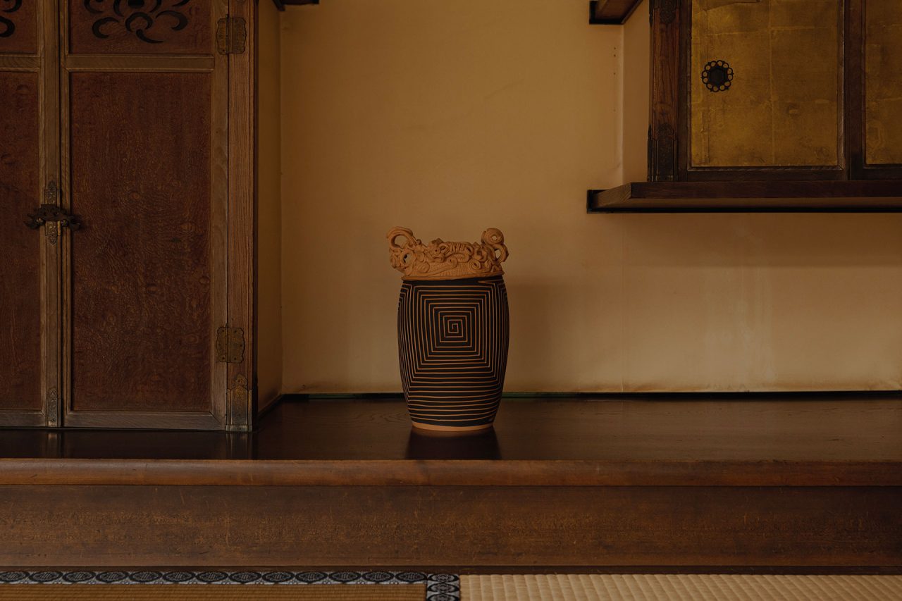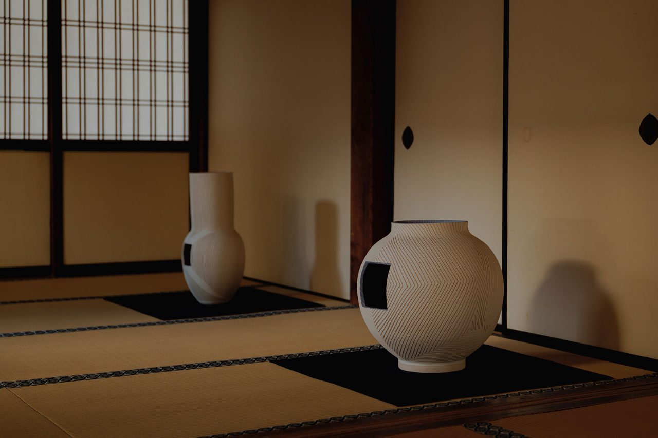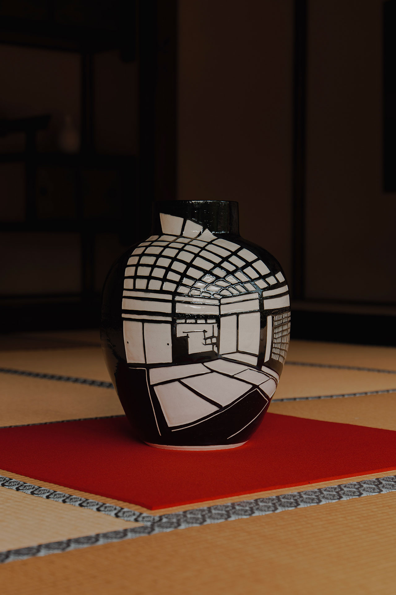 シオ:春に両足院を訪問した際、内装やディティールなどの写真を撮影したのですが、のちに写真を見た時に、寺院建築がグリットのように立ち現れてきました。普段作品には、あまり絵を取り入れることはないのですが、両足院のインテリアを陶器の表面に取り入れた作品を制作してみることにしました。このインテリアの作品は自分にとっても新しい取り組みで、今後も継続して作っていきたいと思っています。