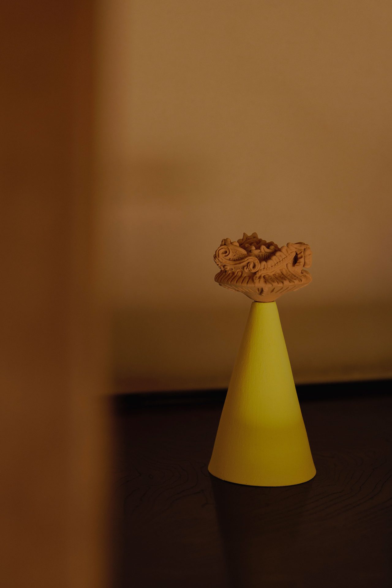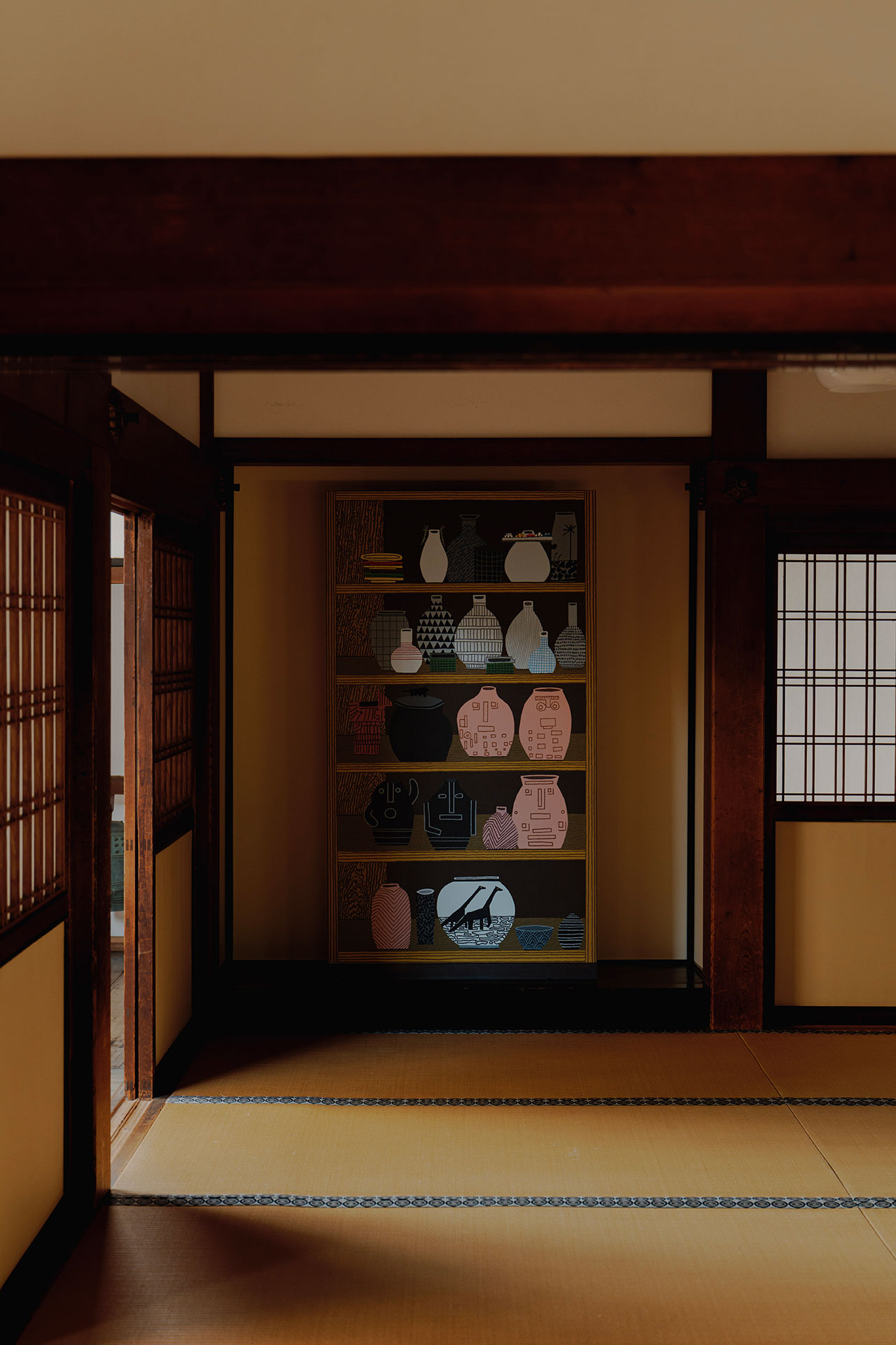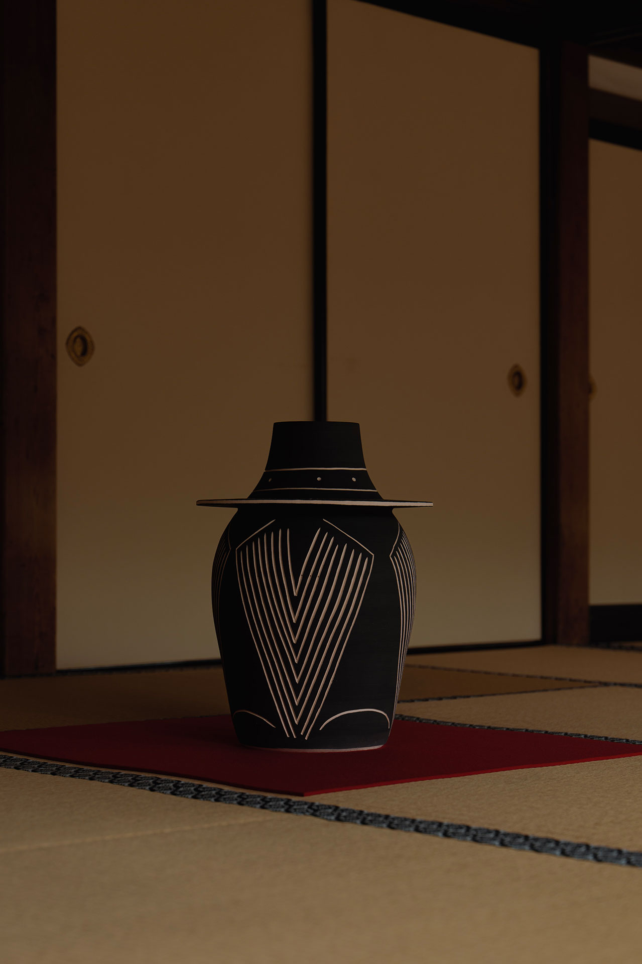 シオ:春に両足院を訪問した際、内装やディティールなどの写真を撮影したのですが、のちに写真を見た時に、寺院建築がグリットのように立ち現れてきました。普段作品には、あまり絵を取り入れることはないのですが、両足院のインテリアを陶器の表面に取り入れた作品を制作してみることにしました。このインテリアの作品は自分にとっても新しい取り組みで、今後も継続して作っていきたいと思っています。