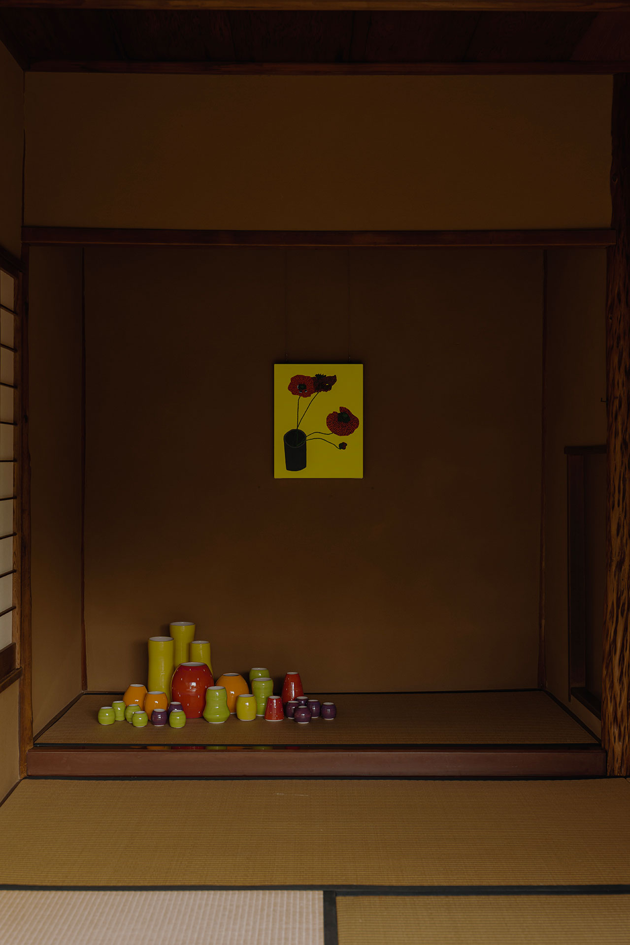 シオ:縄文土器風の香炉を持ってきていたので、ジョナスの小さい盆栽の絵の下に置いてみたらぴったりとはまりました。臨池亭の方はカラフルな設えなので、コントラストが出てよかったと思います。