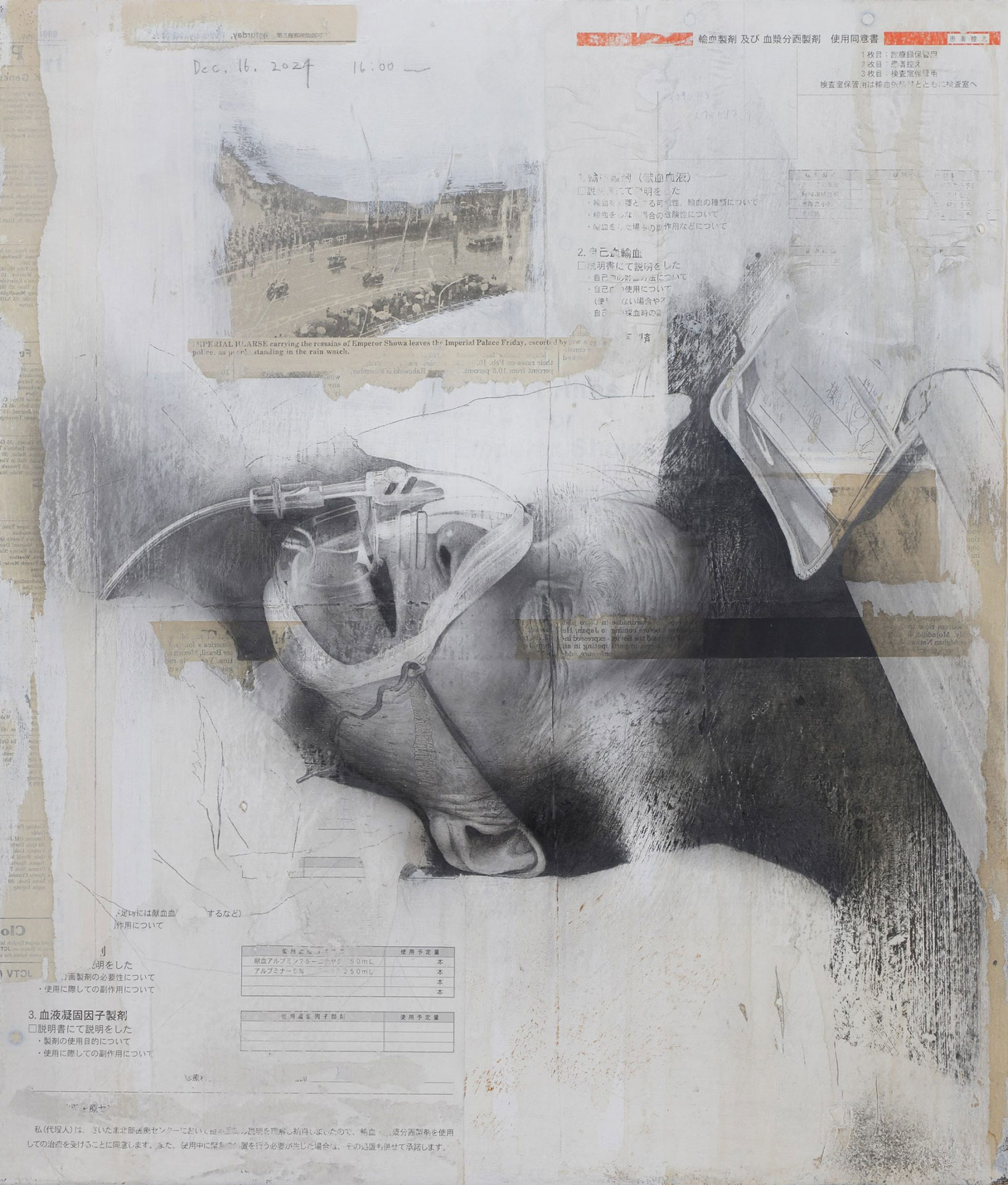 「汀 (みぎわ)」というタイトルをつける際にイメージしたのは波打ち際です。波が打ち寄せるたびに砂浜にはさまざまな曲線、境界線が描かれていきます。海の上限と空気の底にあたる、その境界線には、海藻や貝類、小魚などが打ち上げられているでしょう。病床の母の呼吸を観察していた時に、そんな情景を思い出しました。私は生きているもの / 死んでいるものの両方を描く機会が多くありますが、それらの領域は明確に分かれているものではありません。母親が亡くなった時に、私は死に目に会うことができませんでした。病院に着いたら生命維持装置がものすごい音を立てていましたが、家族が到着するまでお医者さんは装置を止めずにいてくださいました。装置を止めた時をもって、医師が認定する死亡時間としてくれたわけです。ただ、医師による生死の判定が出ても、身体の部位のどこかは確実に生きているわけで、私は母の際に立ち会っていたとも考えられるでしょう。他人に咎められるまでもなく、死にそうな人間を描くっていうのはやはり、良心が疼くものです。動きを止めて物体に近づいているような母を描いていると、静物画を描いているような感覚にもなりました。「汀」という言葉について考えた時、「なぎさ」とも読めますが、「なぎさ」はもっと視野が広く、風景も含んだイメージですよね。「みぎわ」はあまり馴染みがなく、誰もがちょっと考えさせられる言葉。私は人とモノ、生と死。境界線があるようでない状態を「汀 (みぎわ)」という言葉に託したのでした。それは未だ判然としない、私の未踏の絵画……