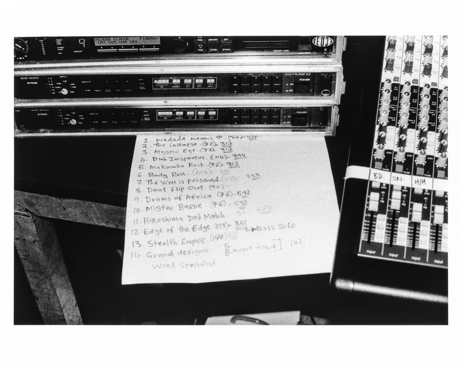 DJ をする時、俺は SPD (電子パーカッションのサンプリング・パッド) を使っているんだ。今日も持ってきていて、サンプルは全部そこに保存しているんだよ。でも DJ ミックスは奥行きを与えるリバーブと、立体感を与えるディレイが入っている。例えば、曲の BPM が70だと分かっている時は、必ず付点三連符 (316ディレイ) に合わせるんだ。そして俺は、いつも付点8分音符を使う。なぜなら、リズムを回転させて速く感じさせるから。70 BPM、付点8分音符は321ミリ秒ということになるから、俺はそれを SPD に打ち込んで、DJ プレイ中に加えるんだ。DJ 中何かやることを作るためにね(笑)。少しだけ盛り上げるためさ。やりすぎは禁物だから。CDJ (プロ用DJプレイヤー) の操作では限界があるけど、これが俺のやり方。ほんの少しだけ活気づけたいんだよ。