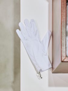 服をイメージしてから、アイウェアをどうデザインするかを考えました。その中で、レンズを外したときのフォルムがジュエリーに見えたんです。theo もアントワープのブランドで、幼少期から父が愛用していた記憶もあり、個人的なつながりもありました。ヴィンテージのフレームを採用しているのも、20年にわたる歴史と品格がある部分を打ち出したかった。それが今回選んだ理由です。