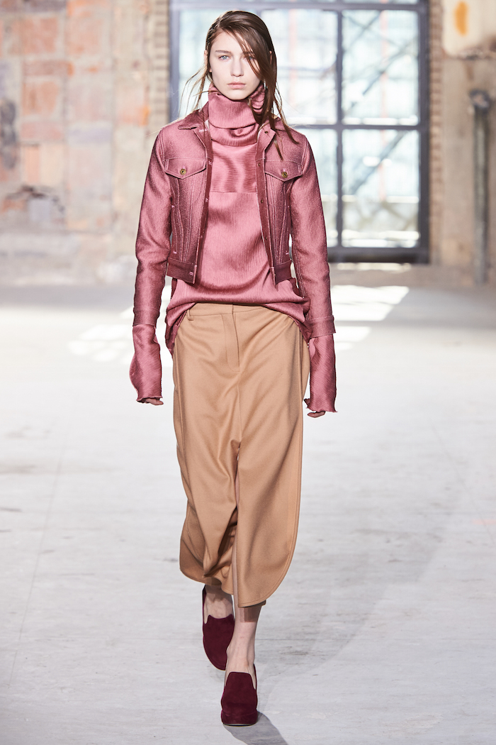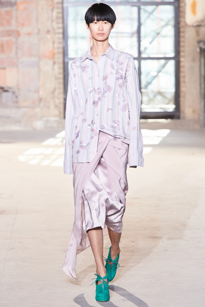 これは、ベーシックラインの中でも特にリコメンドしたいアイテムだよ。コレクションの中で最もリーズナブルな価格帯、799ユーロで展開している。同じ素材を使用した美しいドレスは他にもあるよ。ピンク色がとっても際立つでしょ。カラーはとても重要だよね。次にこれは、柔軟剤を用いてウォッシュド加工されたもので、柔らかい素材が肌に馴染むよ。この素材はクレープオンというもので僕たちの使用しているファブリックの中でも、特に目を引くものなんだ。アシッドイエローで染めたこのカラーがとても素敵でしょ。そしてこれが定番のデニムジャケット。これのほかに、ファーを施したものもあるよ。最後にこれが僕たちのお気に入りのカーゴパンツだよ。