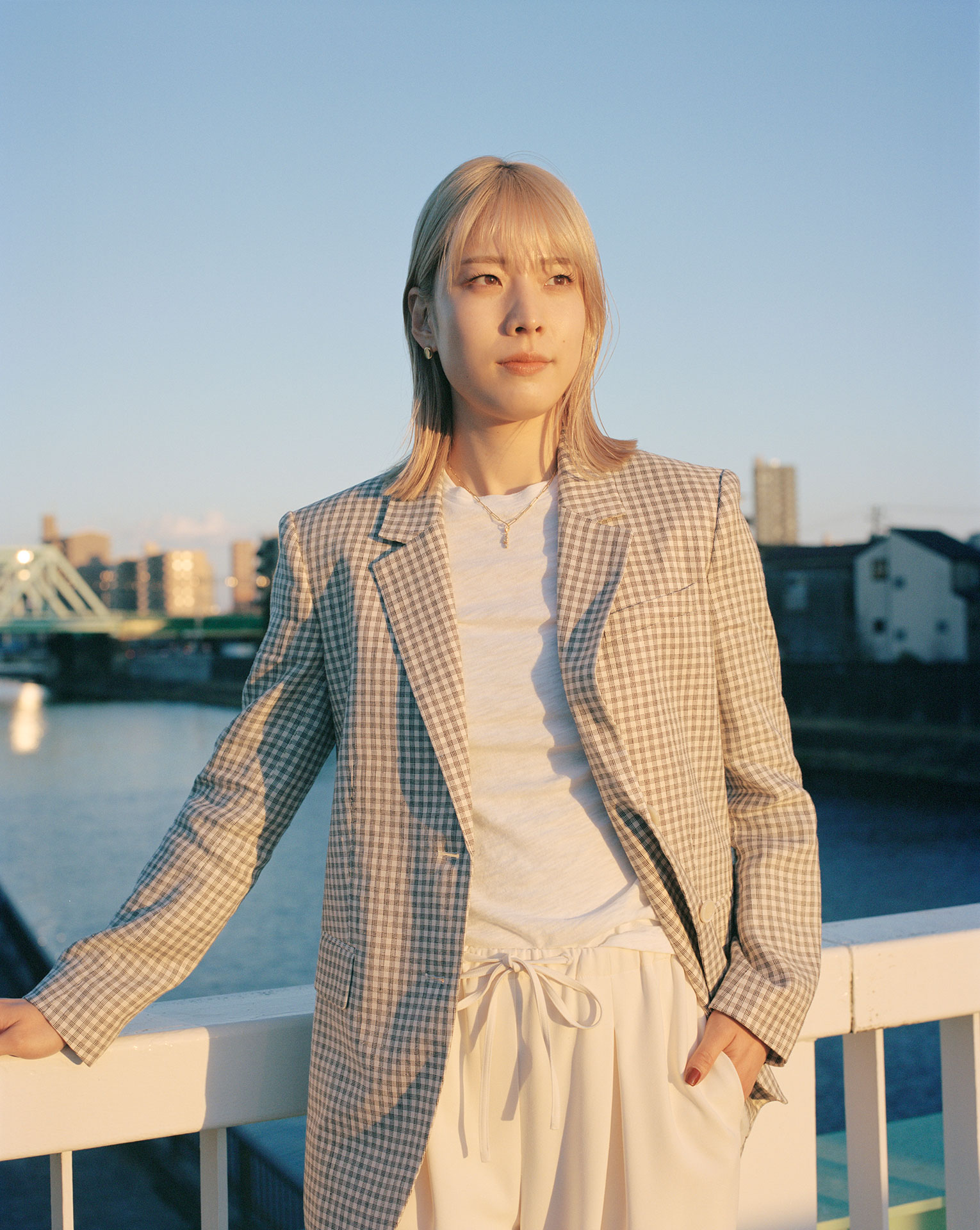 ひと目見ればわかるその上質な生地は、Theory が誇る「Admiral Crepe」。ドライタッチのトリアセテートで、さらりとした肌ざわりが湿気の多い時期でも快適な着心地を叶える。主張しすぎず、それでいて高級感を醸す光沢感と、ハリのある質感は、着るシーンを選ばない。まっすぐな背筋とスラリとしたプロポーションの江村には、ブラックのパンツにマニッシュなベストを合わせたシックな装いを。その凛とした姿が、Theory のコンテンポラリーな女性像を体現する。一方、ホワイトのパンツは思いっきりカジュアルに、彼女の等身大の魅力を引き出す。ベーシックなアイテムだからこそ、お気に入りのアクセサリーとも自然に調和し、自由自在なアレンジで異なる雰囲気を楽しんで。