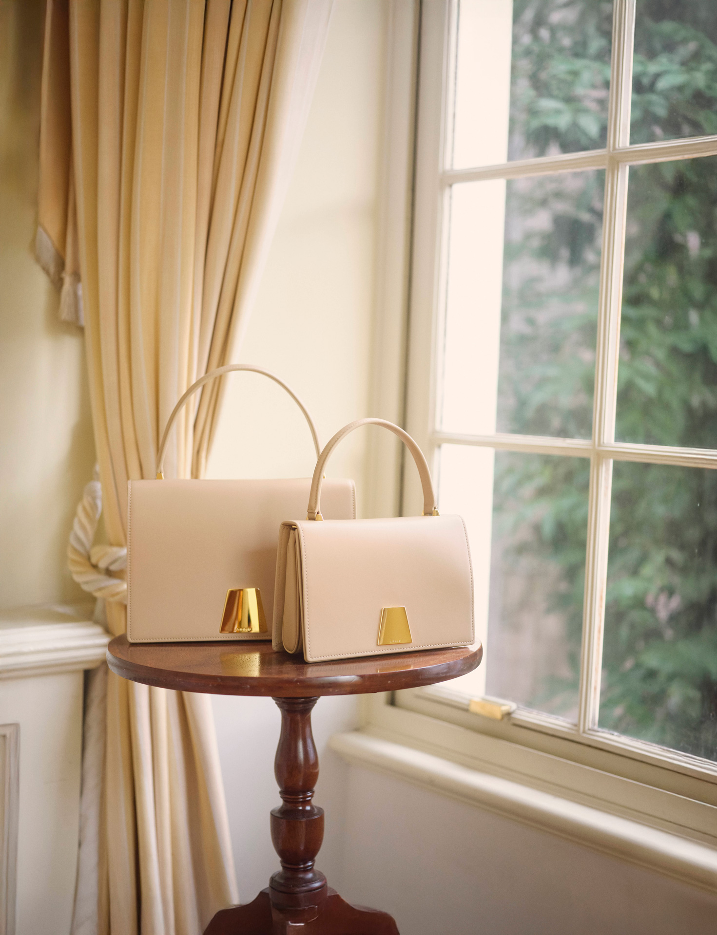 手元には、 Akris Alice シリーズからコダージュを。アクリスの頭文字 “A”をかたどったシグネチャーの台形バックルが印象的に輝く。やわらかなニュアンスを帯びたコダージュが、全身のニュートラルトーンに溶け込みながら佇まいに奥行きと陰影をもたらす。